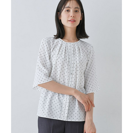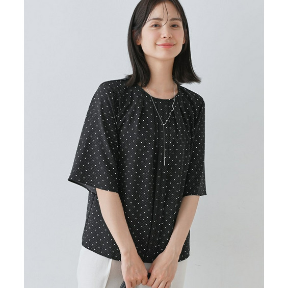 スクエアモチーフの変化ドット柄がフェミニンになりすぎない印象を演出します。
