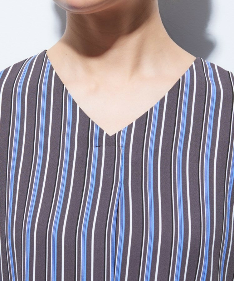 シンプルなVネックと女性らしいほのかなAラインシルエットが、上品さときちんと感も演出します。