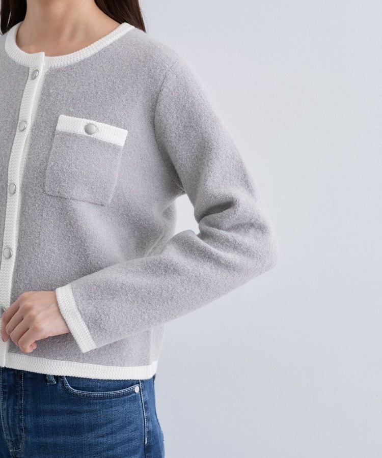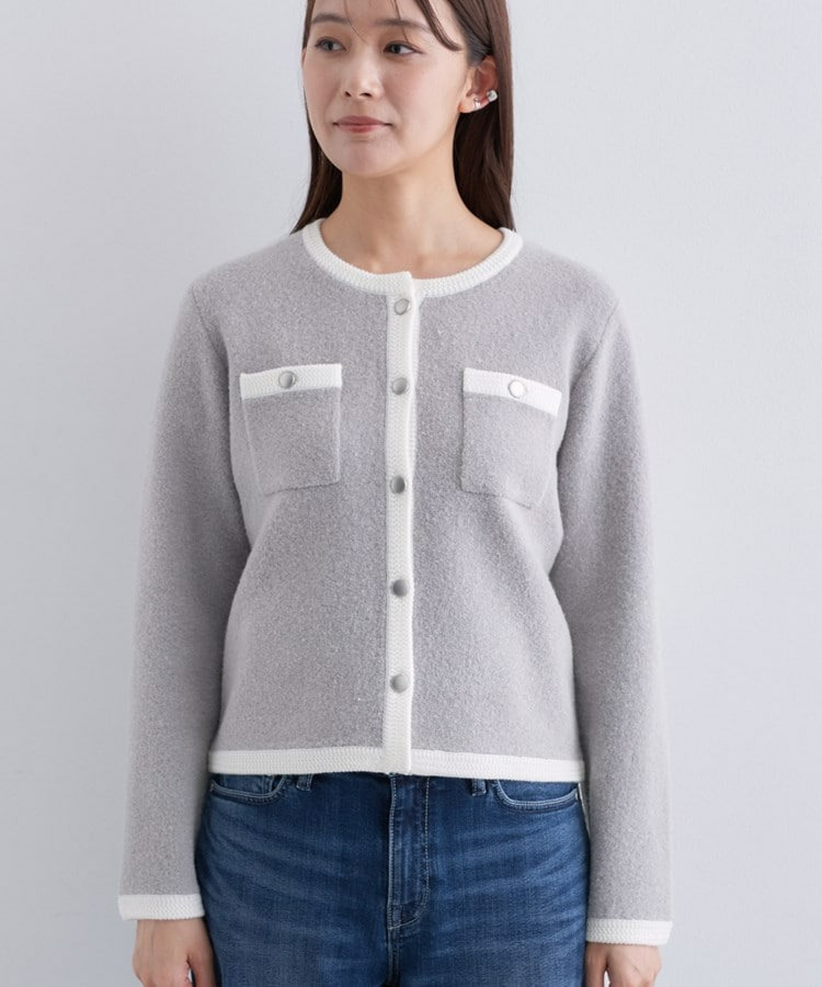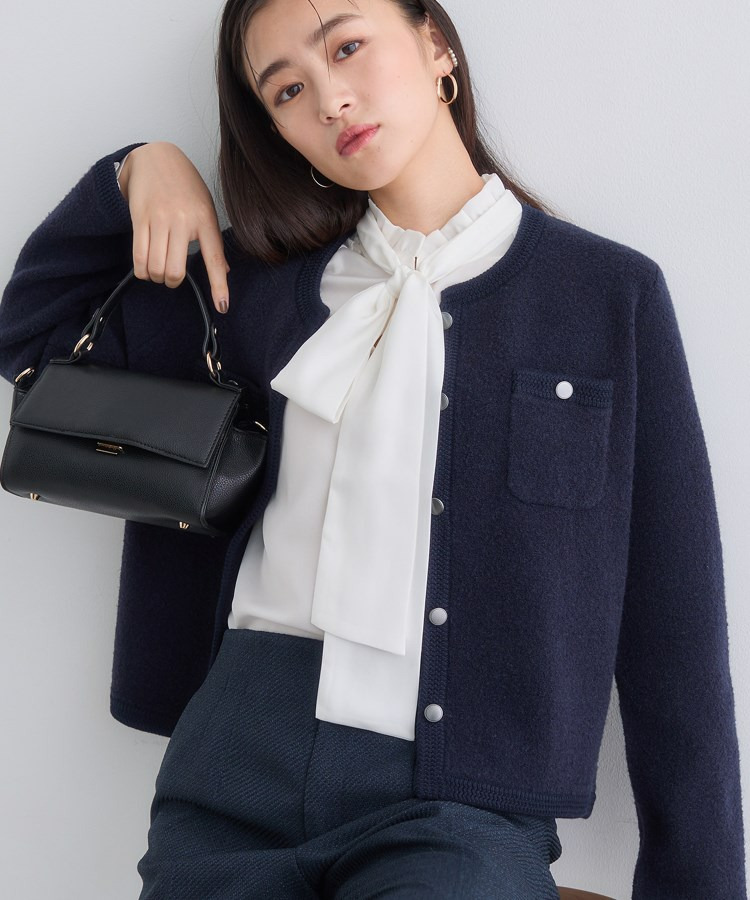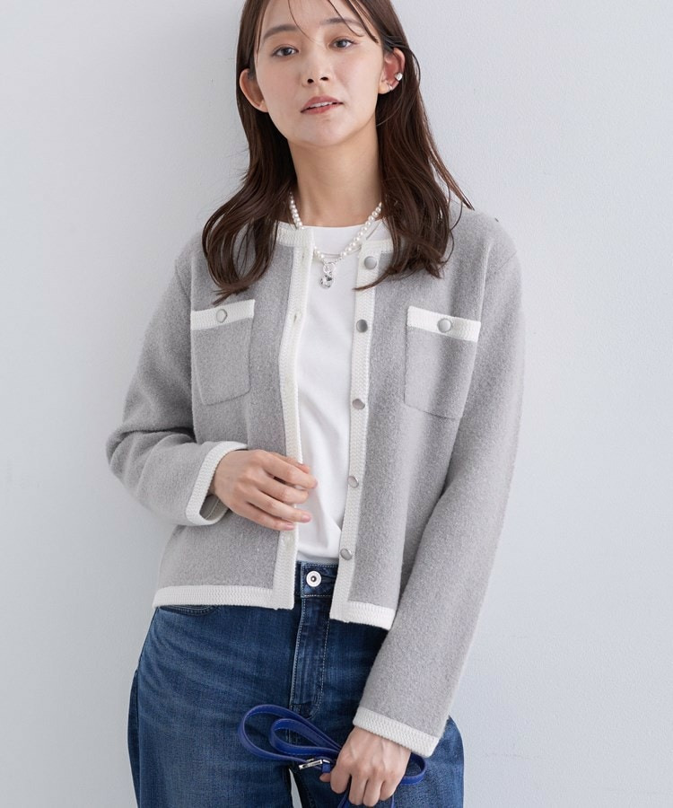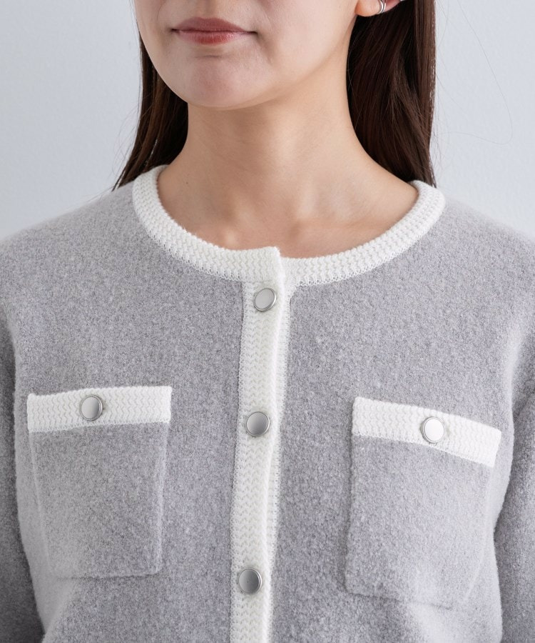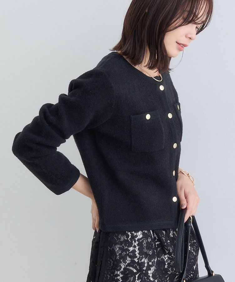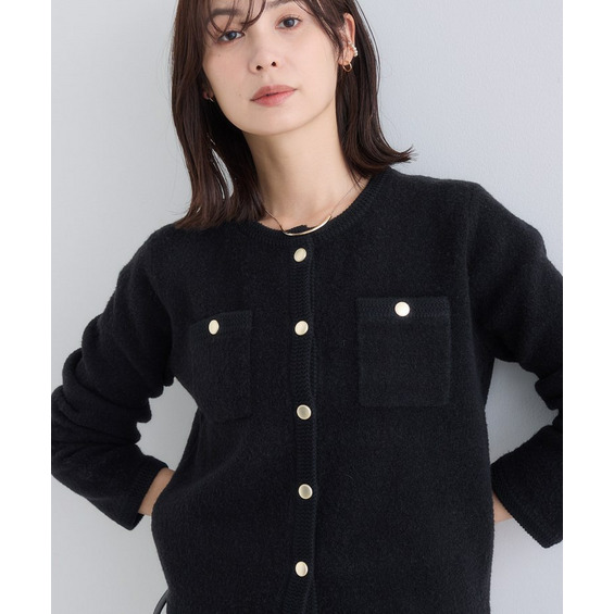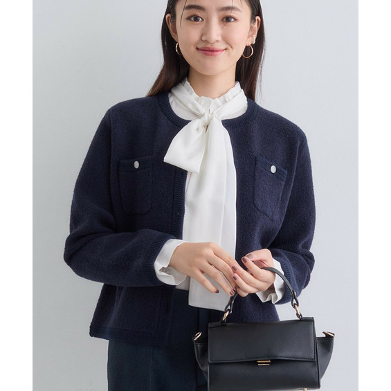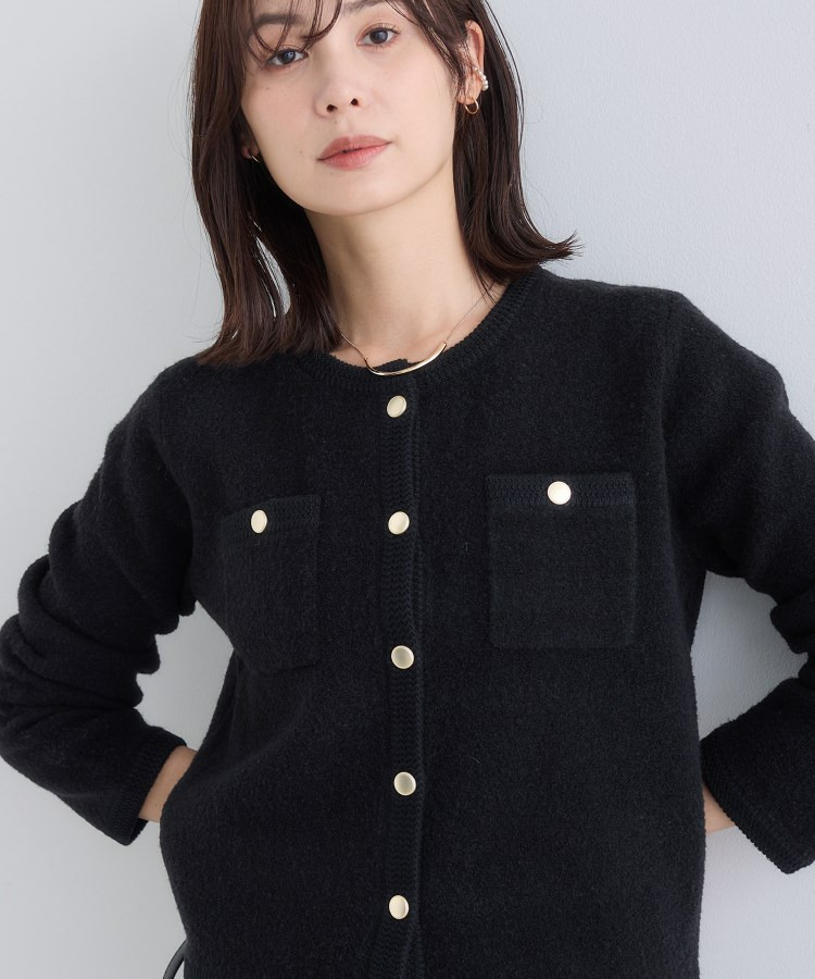 上品なミニブークレ素材を使用した、ウール混のジャケットライクカーディガン。
