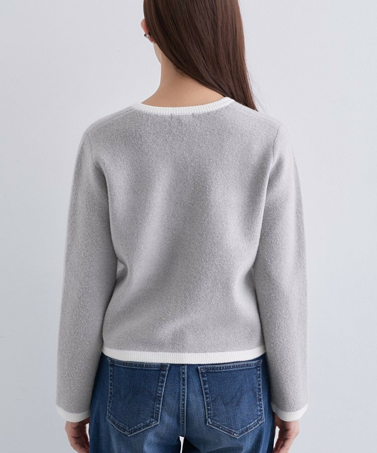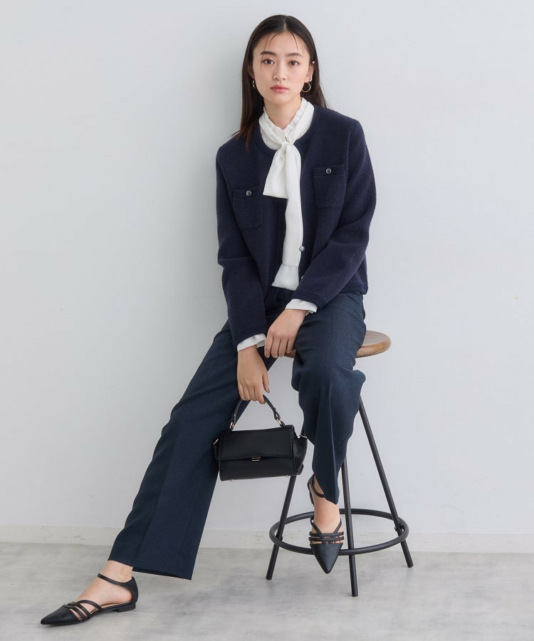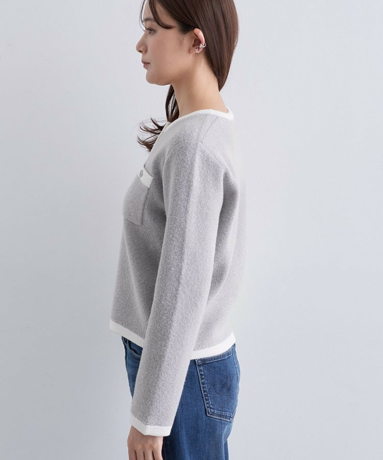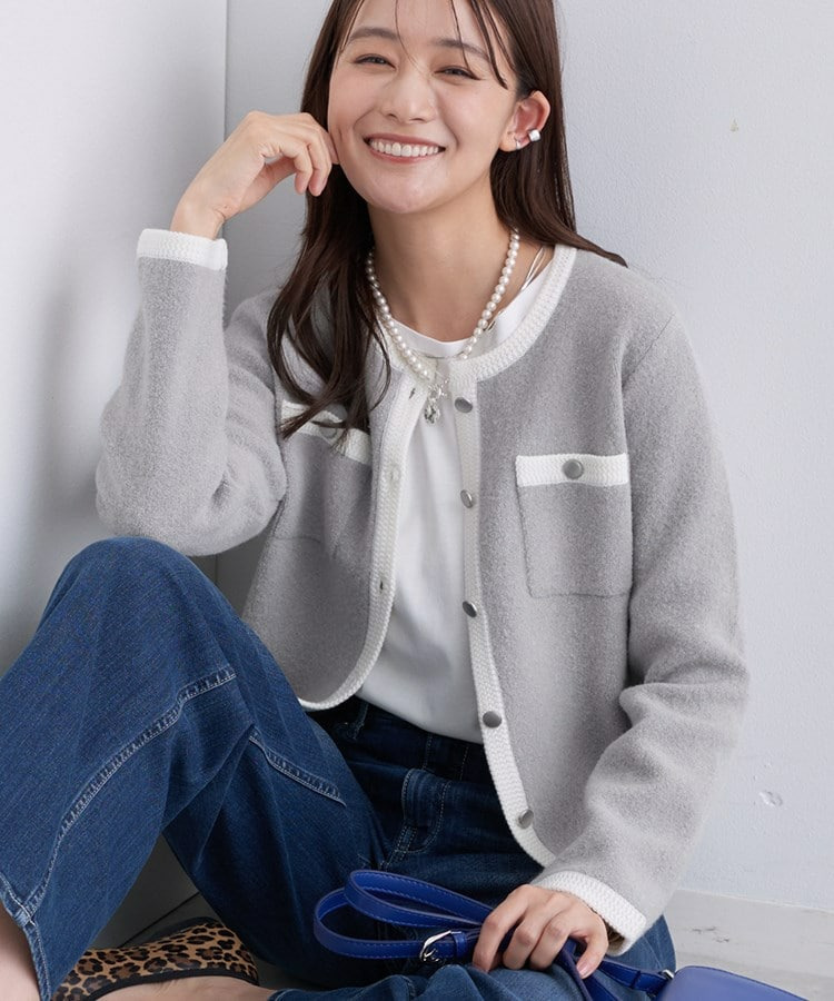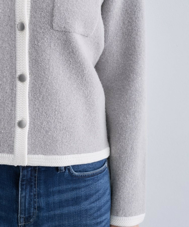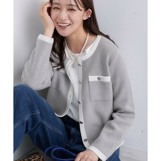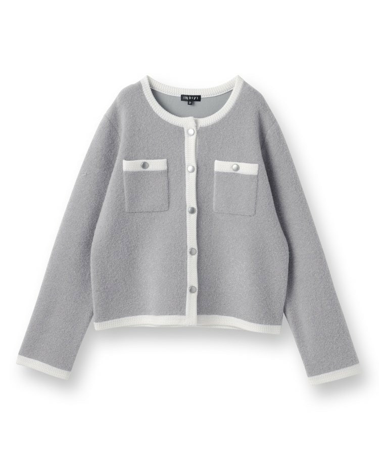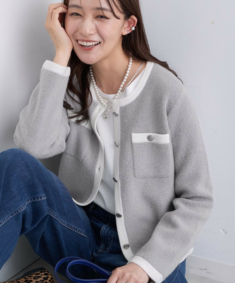 上品なミニブークレ素材を使用した、ウール混のジャケットライクカーディガン。