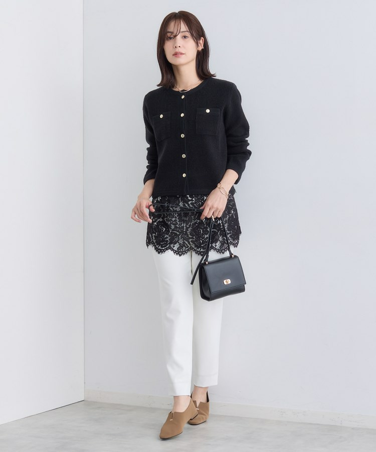 衿元、前立て、袖口には異素材のトリミングを施し、さりげないアクセントが大人の洗練された印象を演出。