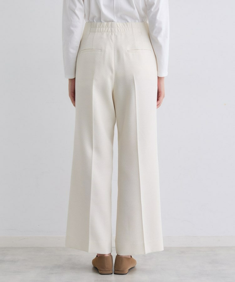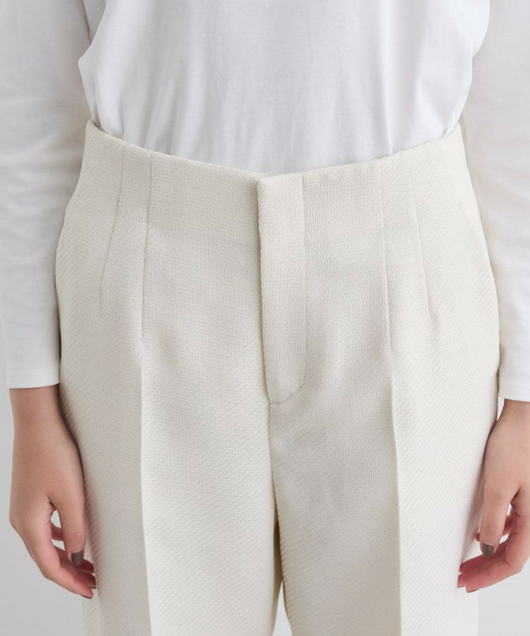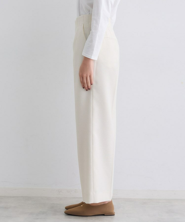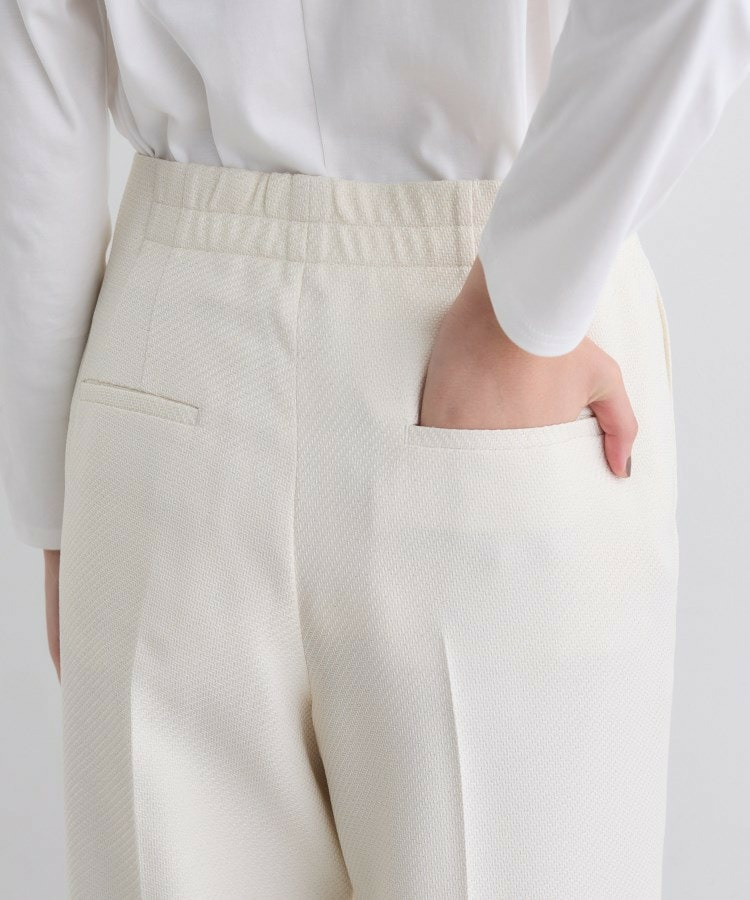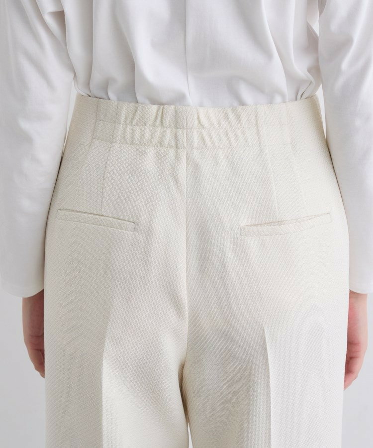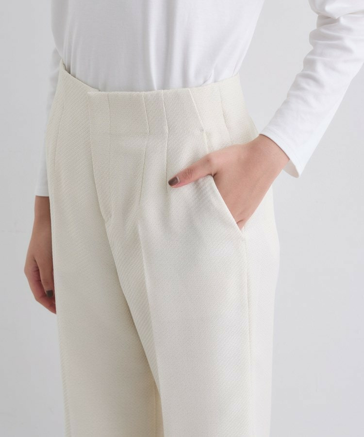 トップスをインする際にもウエスト位置が高く見えるベルトレスでスタイルアップ効果も期待できるシルエットデザインです。