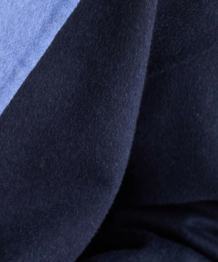 両面ビーバー仕上げによる美しい光沢感と、バイカラーによる配色デザインが特徴のウール混リバー素材になります。