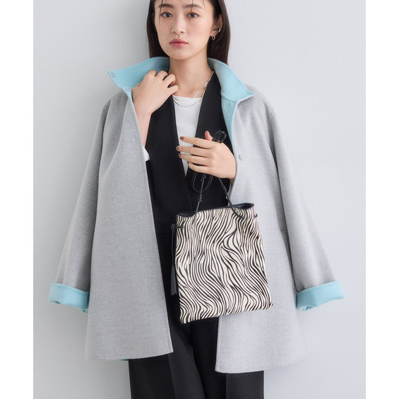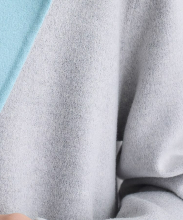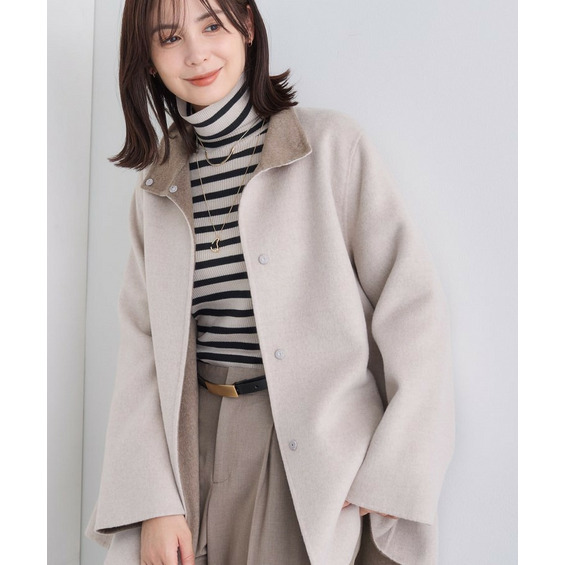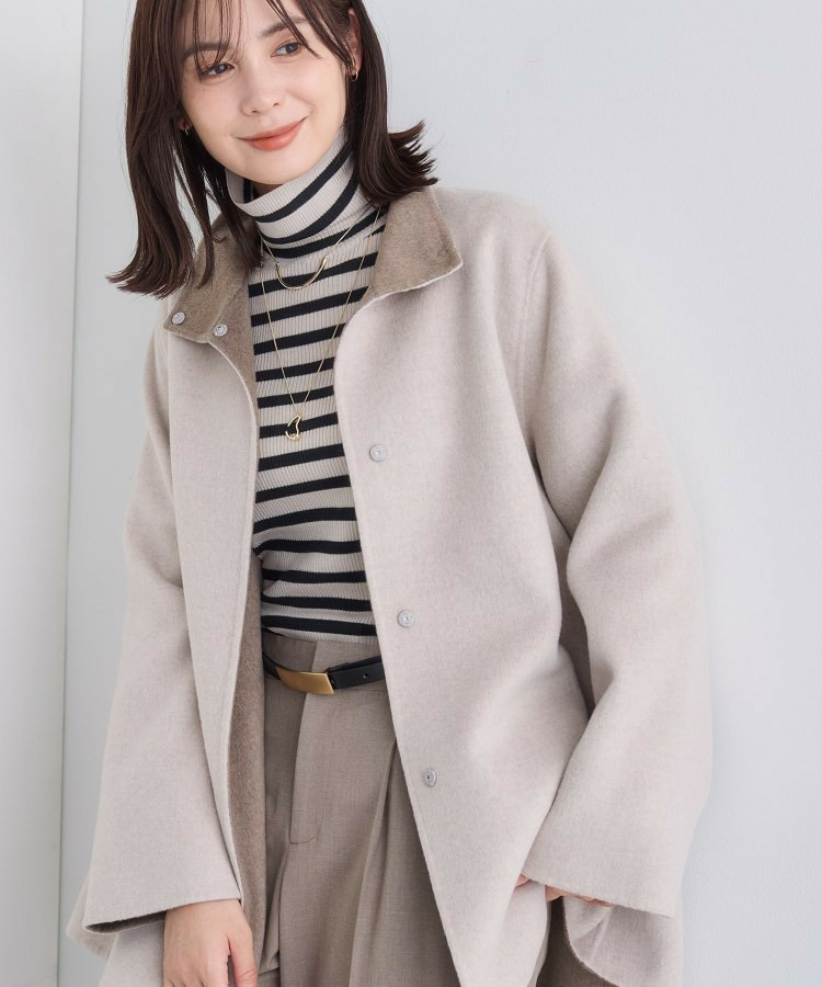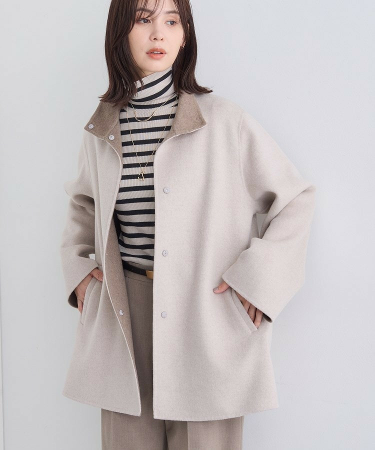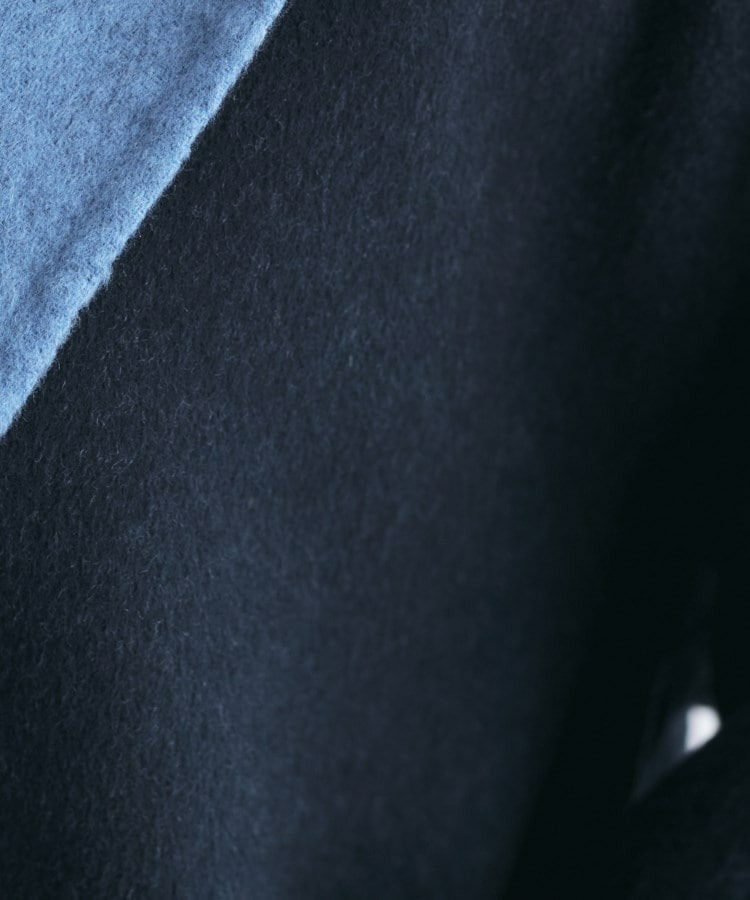両面ビーバー仕上げによる美しい光沢感と、バイカラーによる配色デザインが特徴のウール混リバー素材になります。