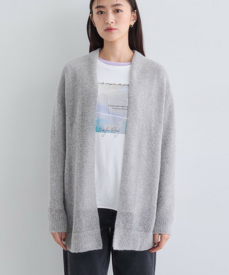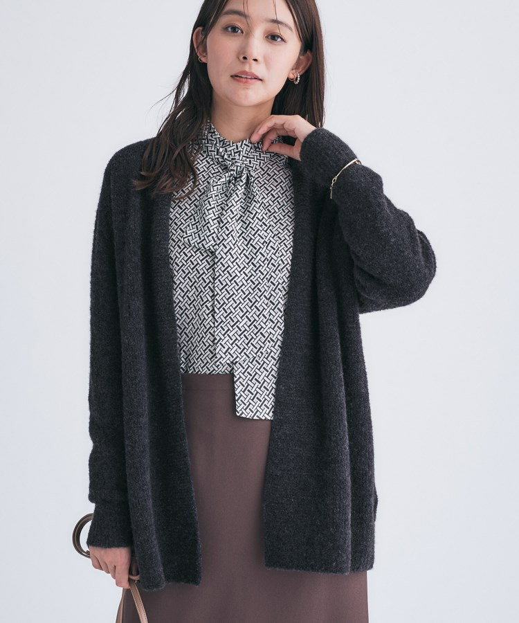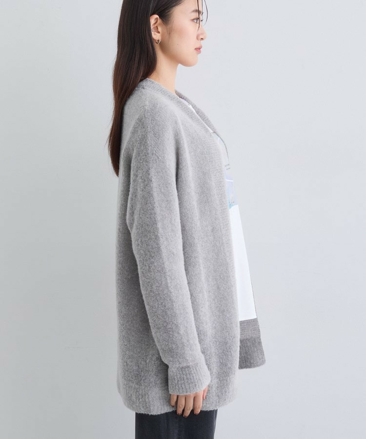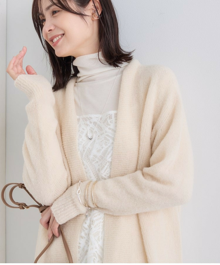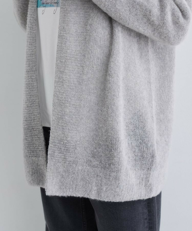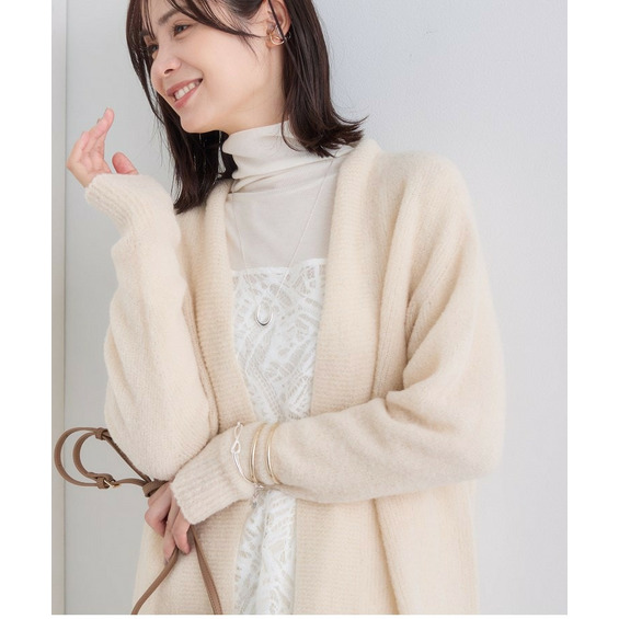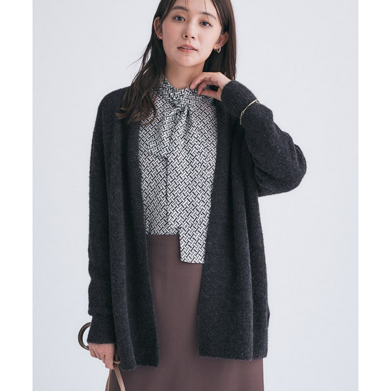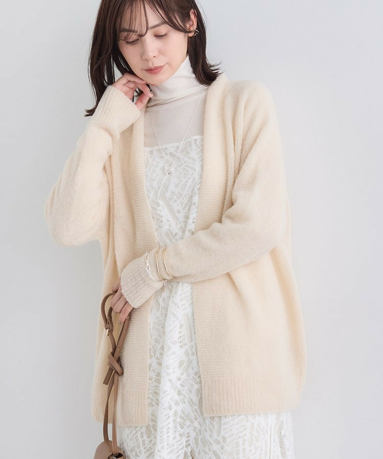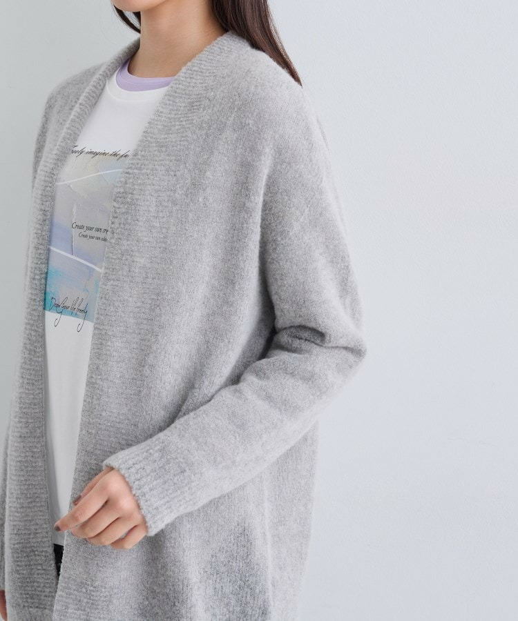 エアリーで軽いブークレ糸を使用したベーシックな着流しカーディガンです。