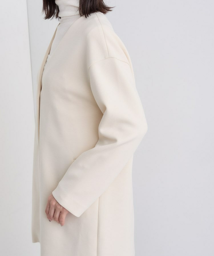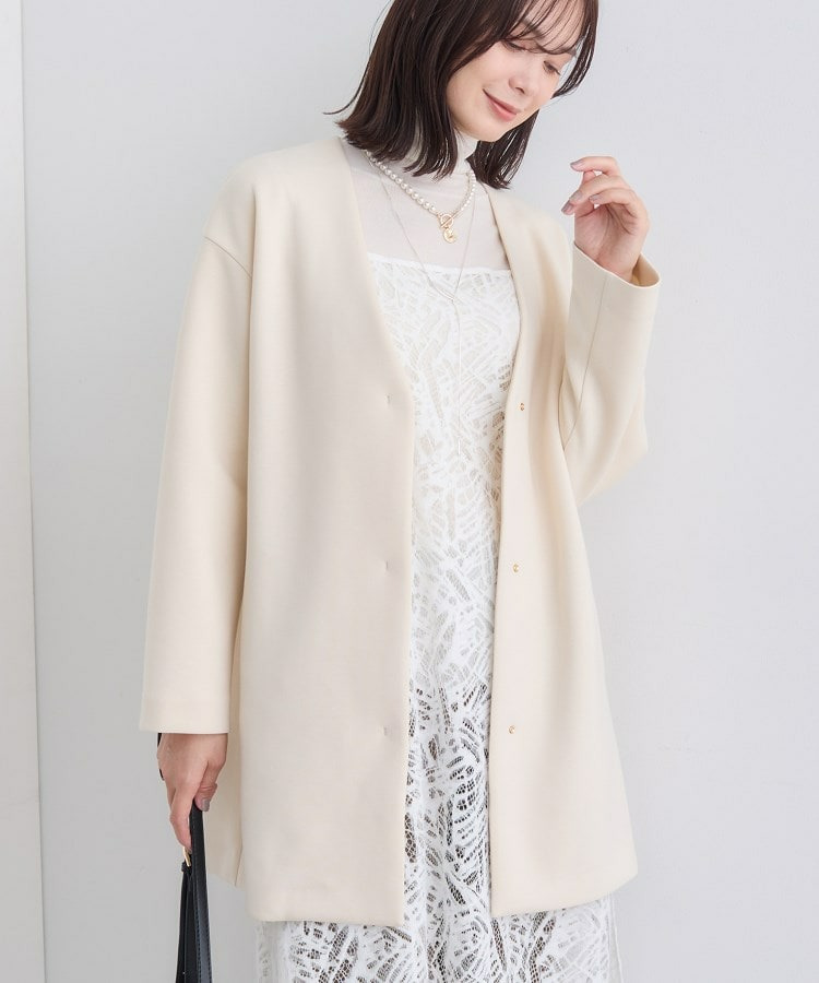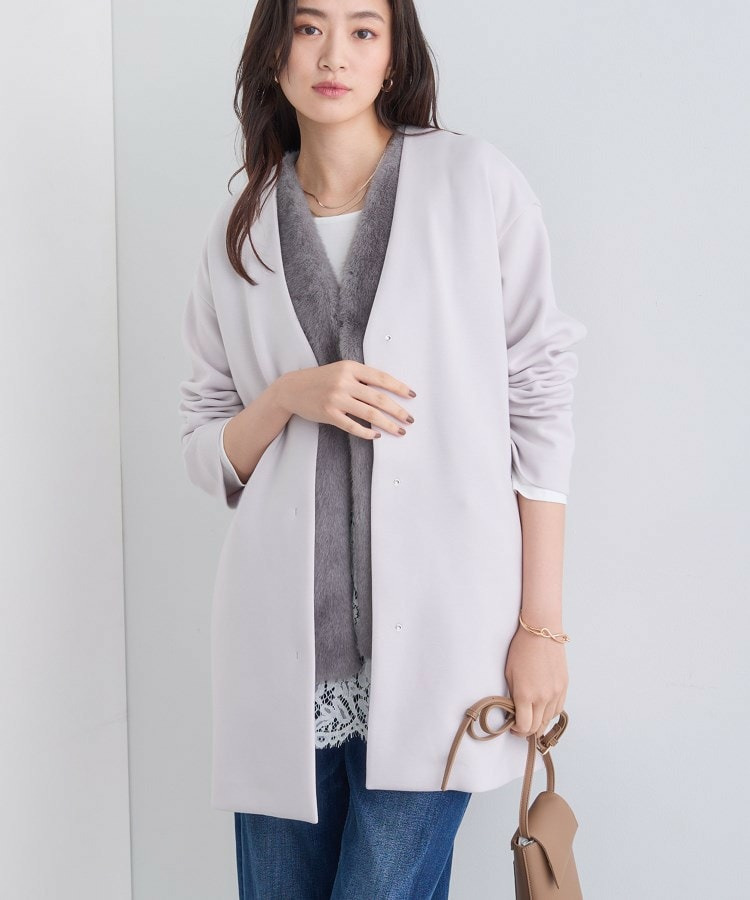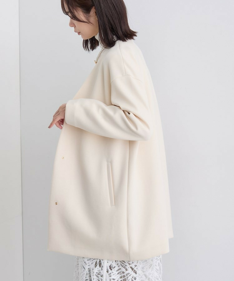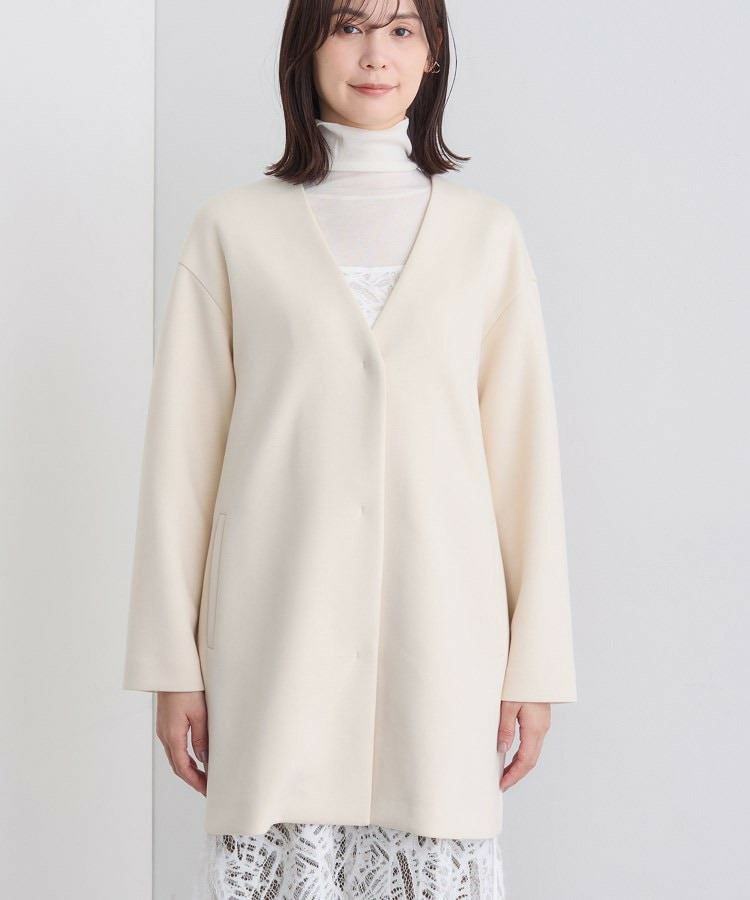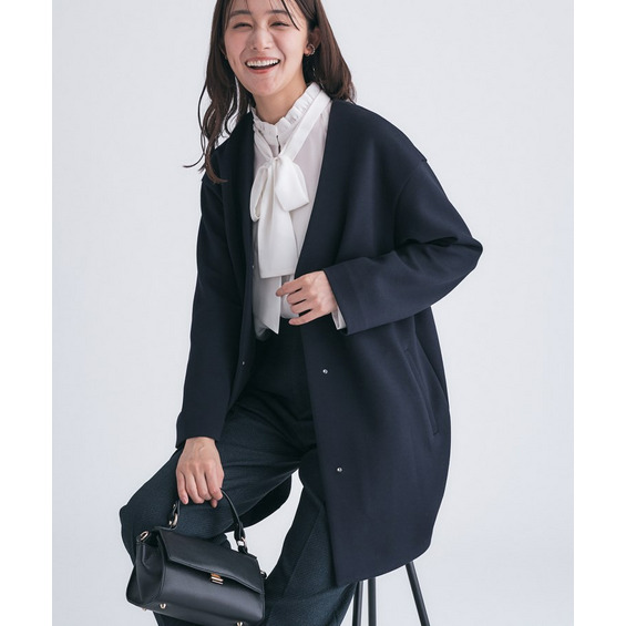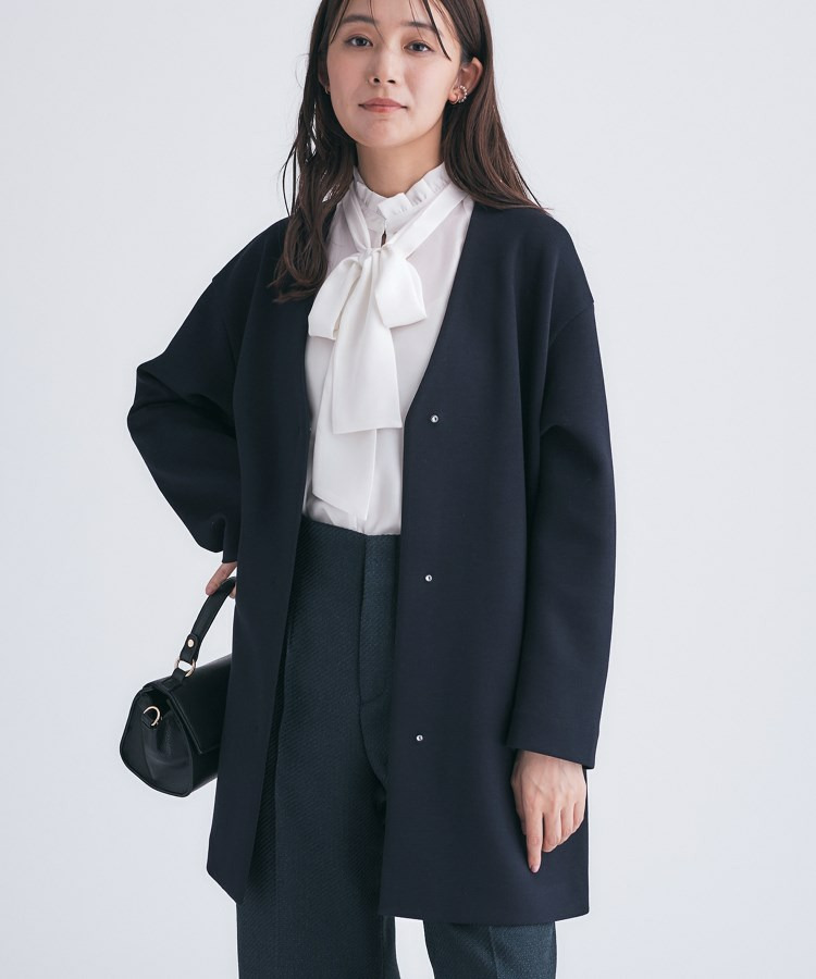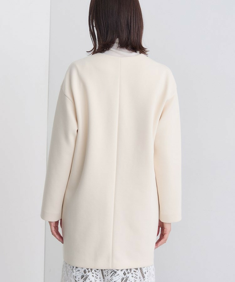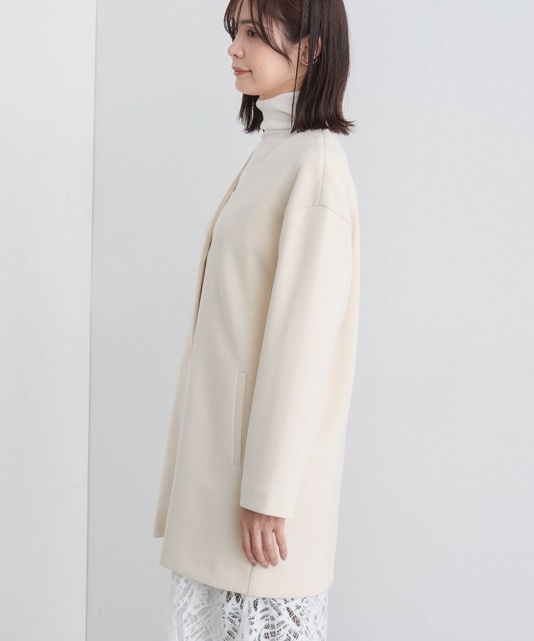 ふっくらしたスポンディッシュなタッチが特徴のノーカラーアウターです。