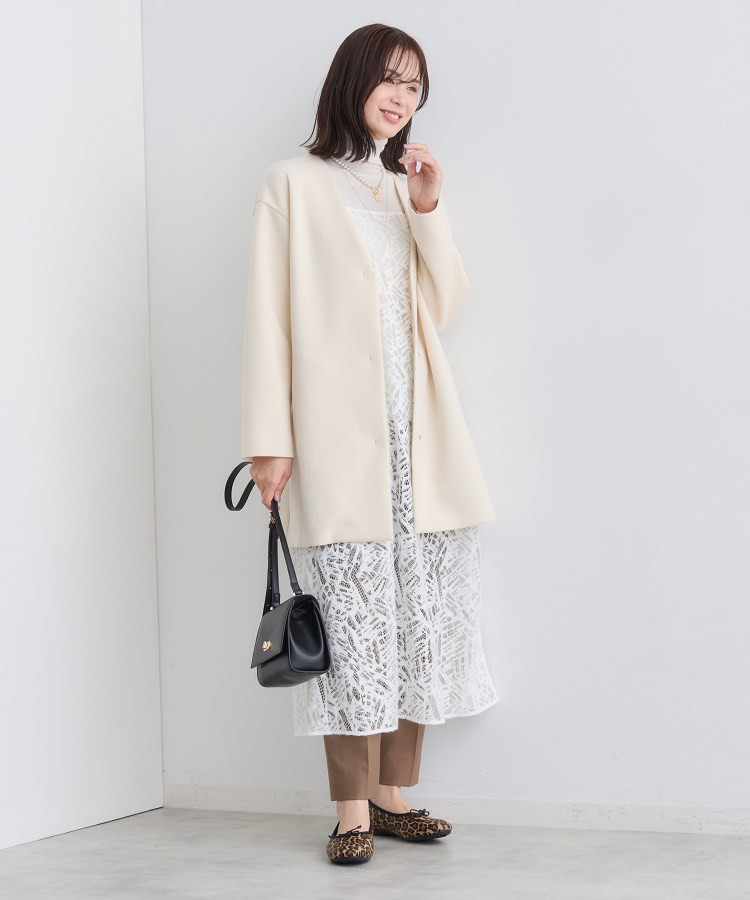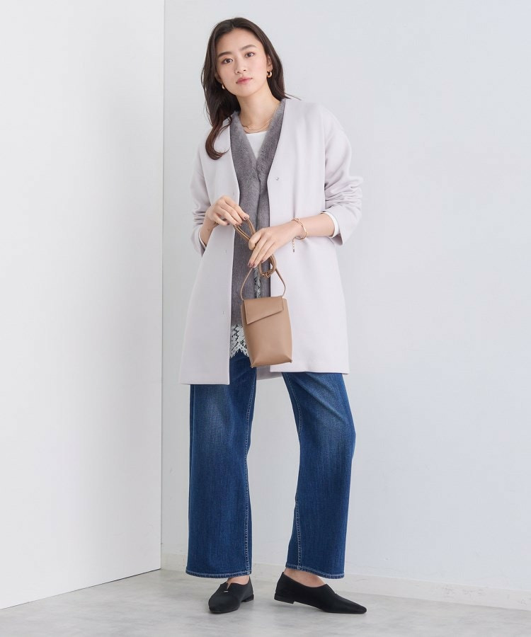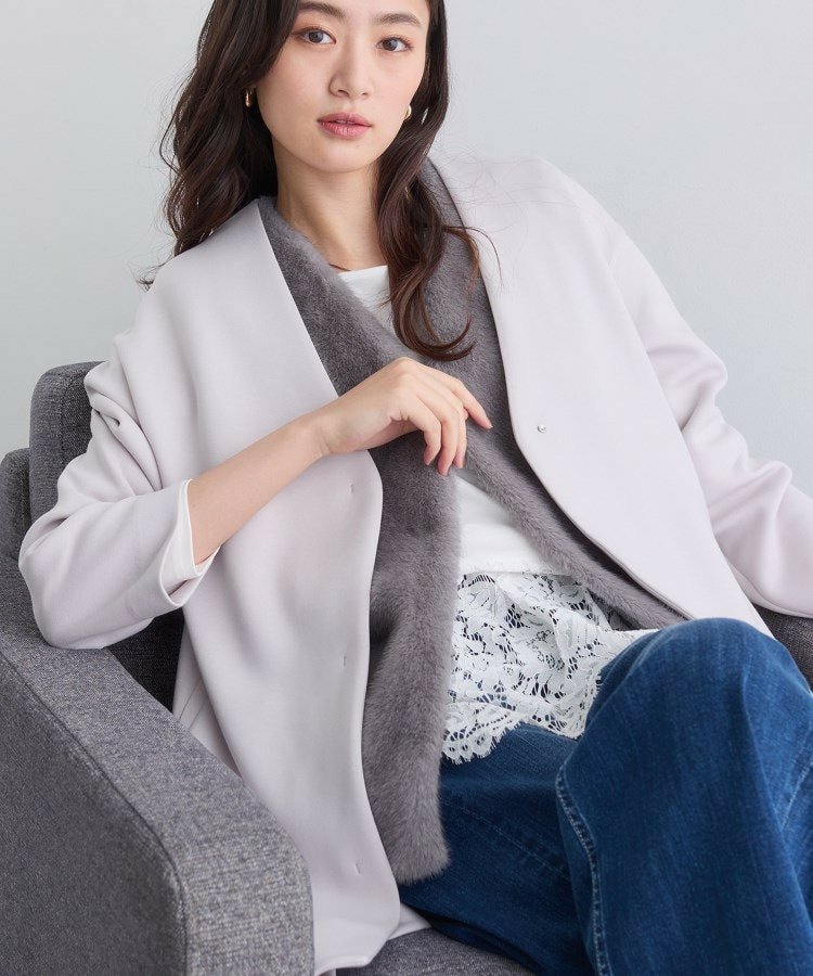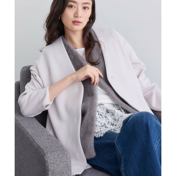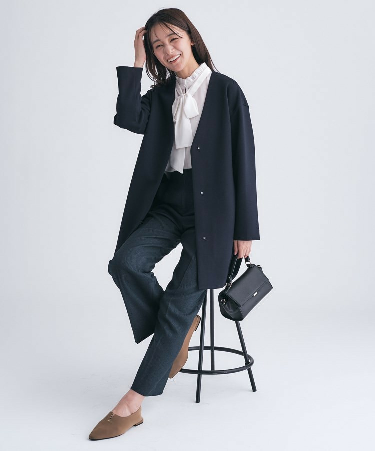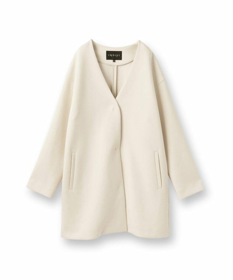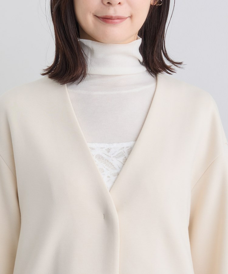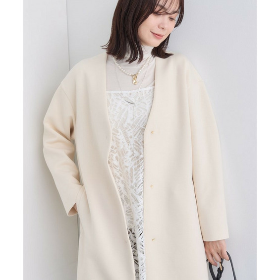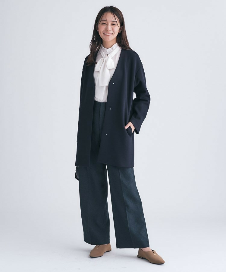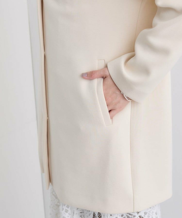 ふっくらしたスポンディッシュなタッチが特徴のノーカラーアウターです。