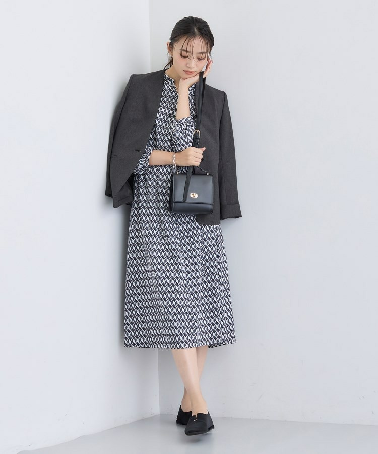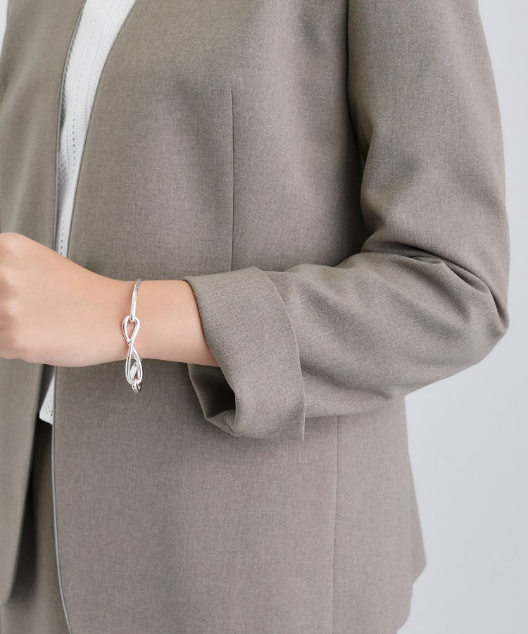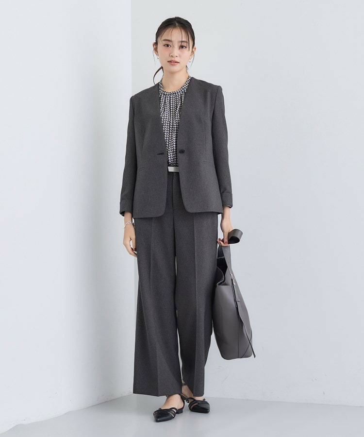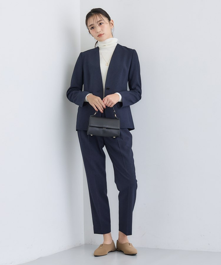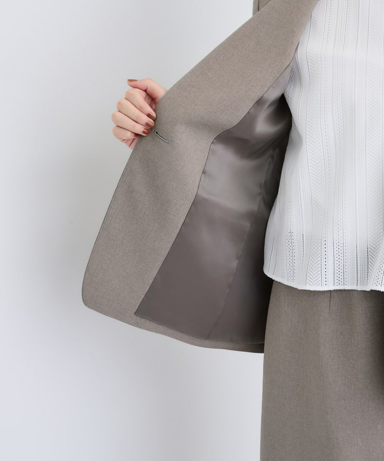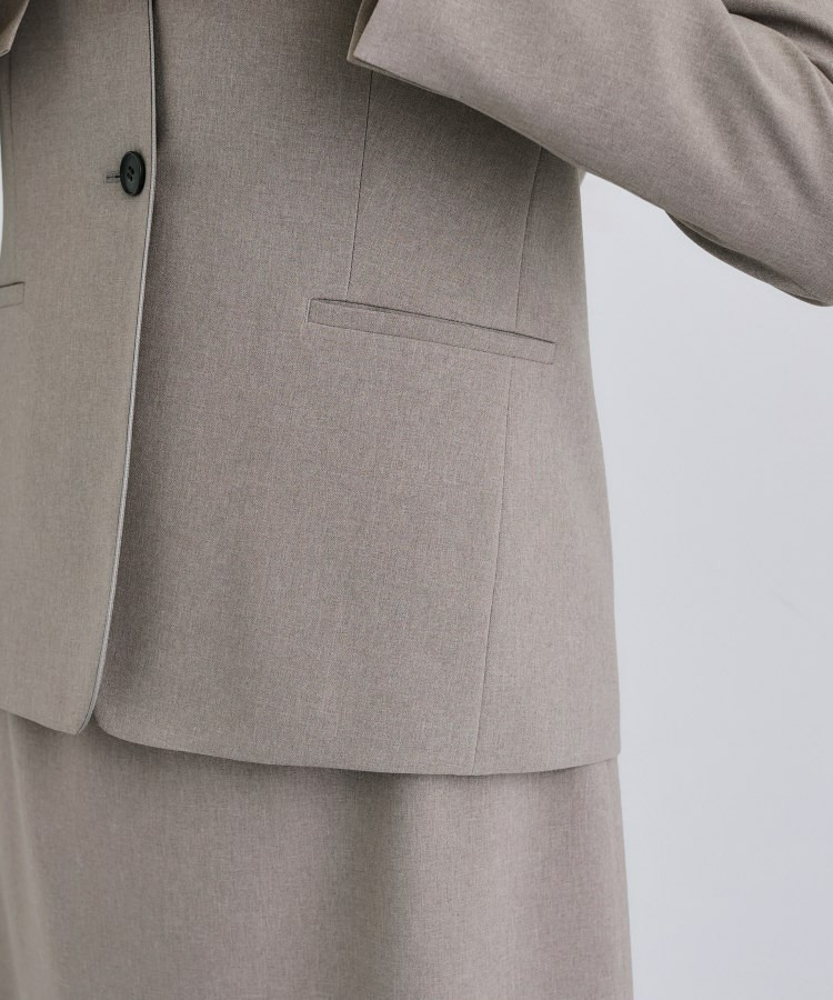 定番のノーカラージャケットはウエストを絞りすぎず、立体的にスッキリとした見え感のシルエットです。