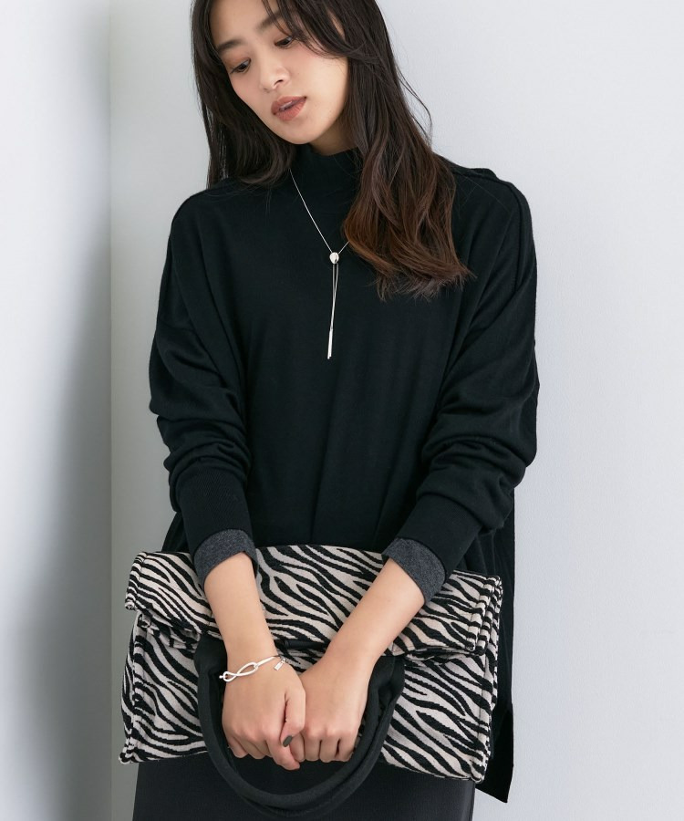 ハイネックのオーバーシルエットに、裾スリットとヒップを隠せる着丈で、抜け感とリラックス感を兼ね備えています。