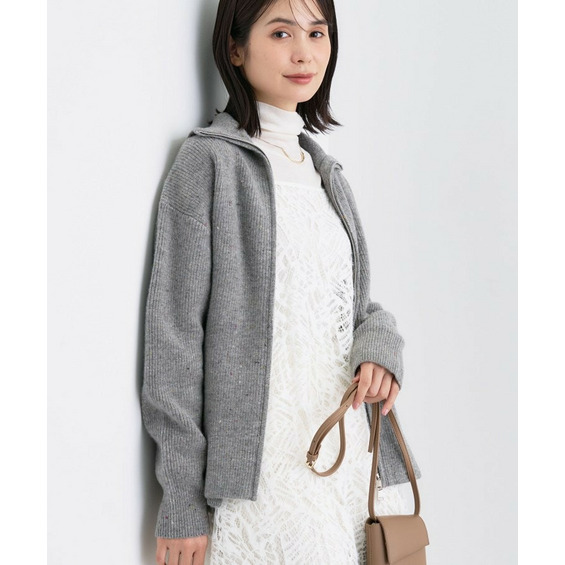 ファスナーを閉めるとスタンドカラーにもなって色々な着こなしが楽しめるカーディガンです。