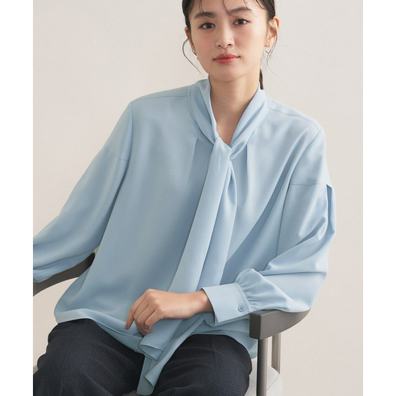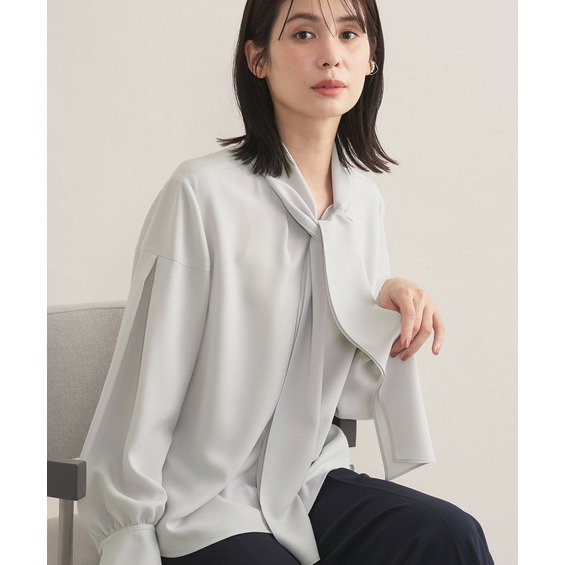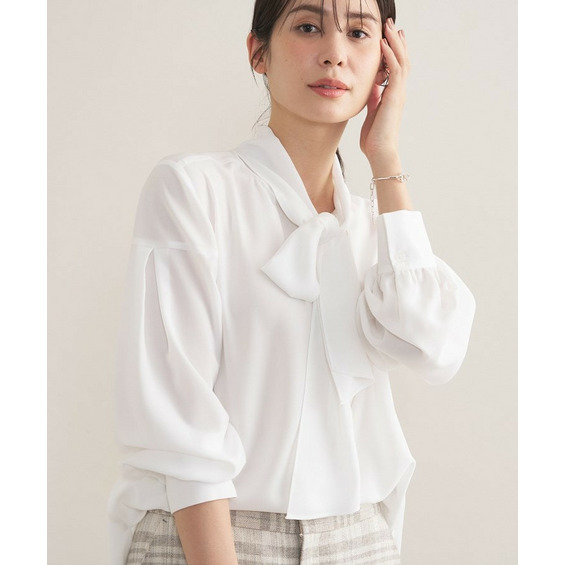 映えるボウタイデザインのブラウスなので、オフィスで活躍する1枚着としてはもちろん、セレモニーの場面などではジャケットのインナーにも活躍するアイテムです。