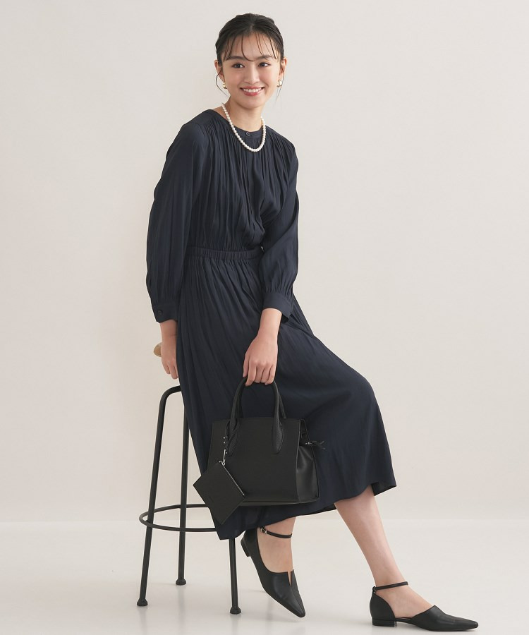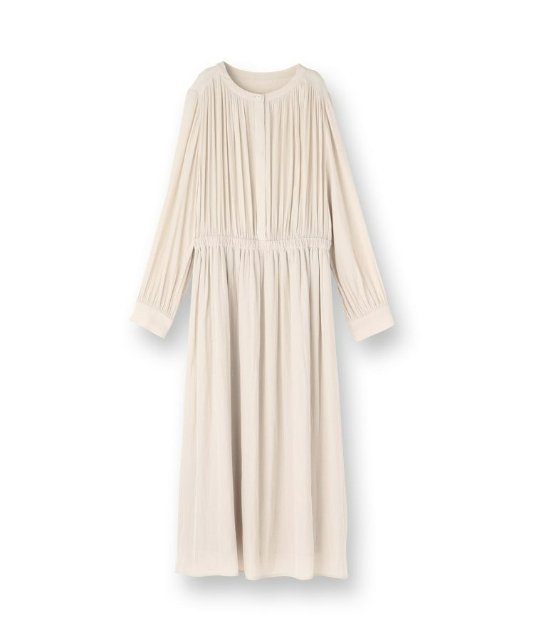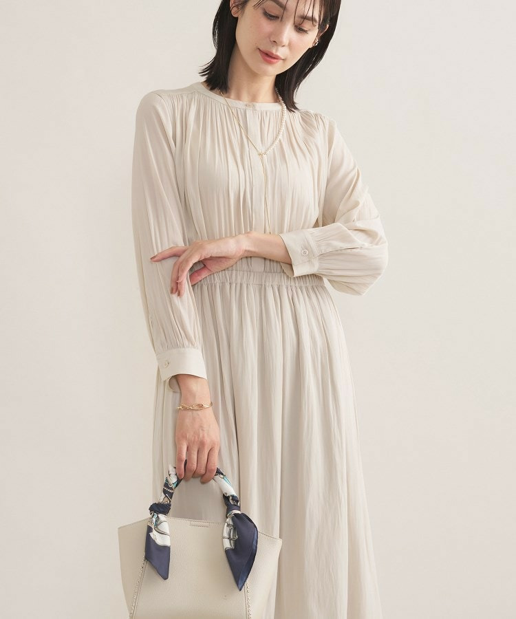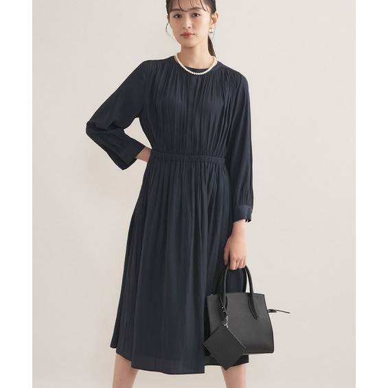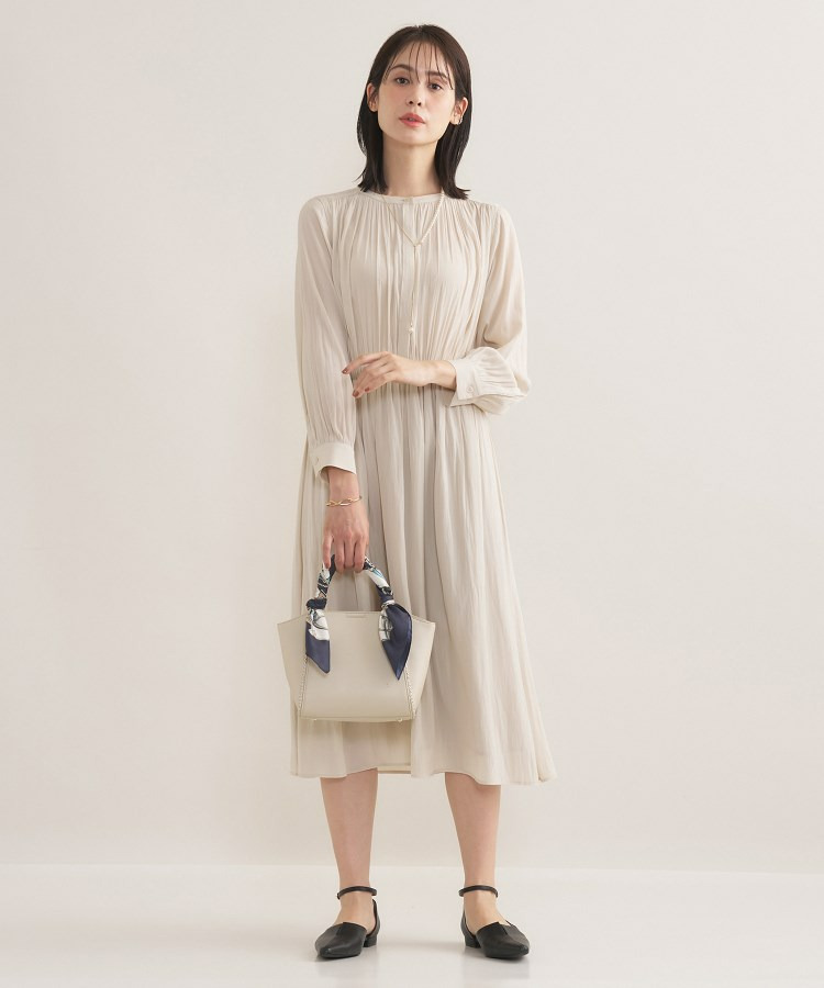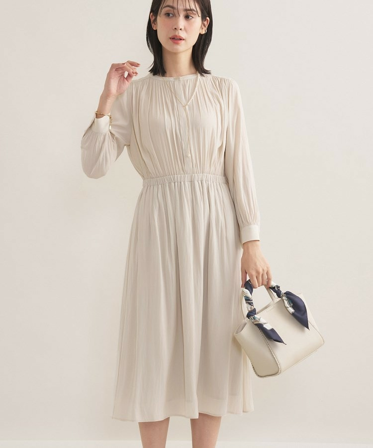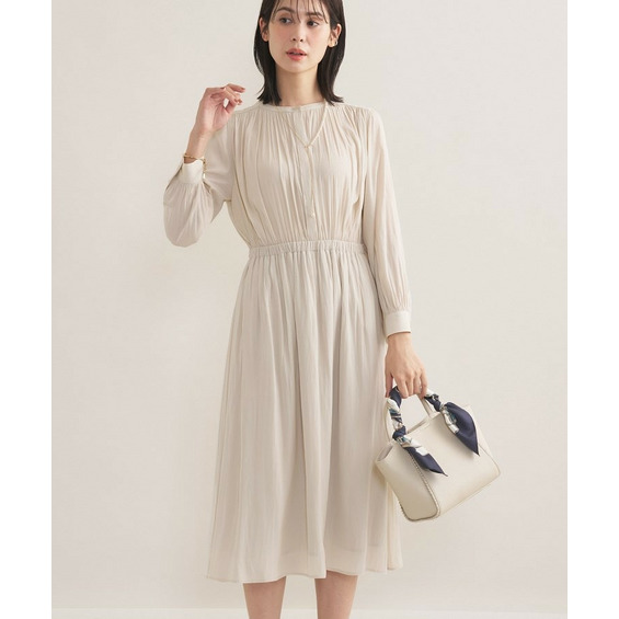 ギャザーや落ち感を活かした女性らしいワンピースなので、1枚でも華やかな印象で着こなしていただけます。