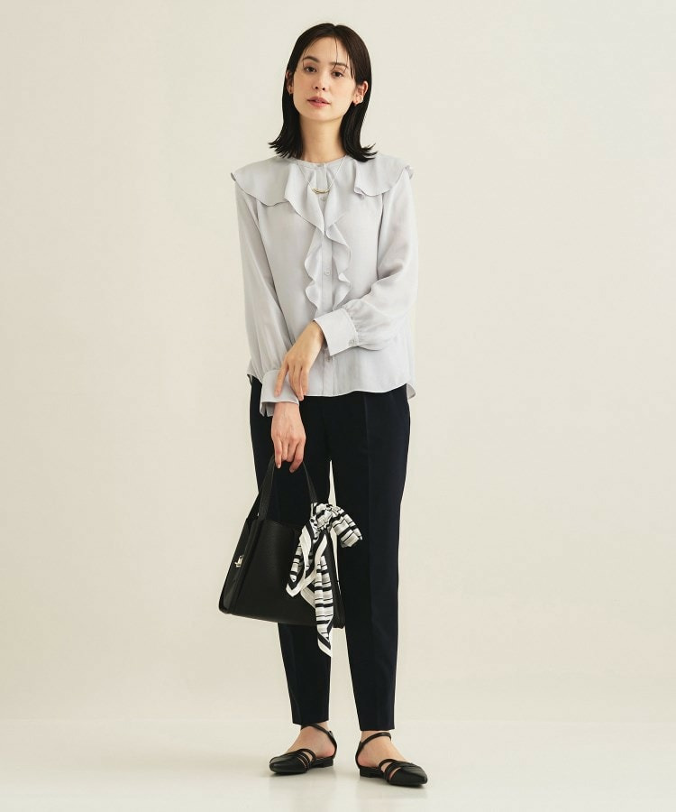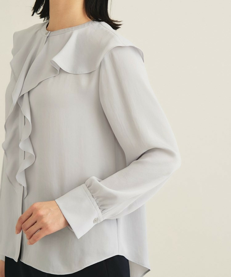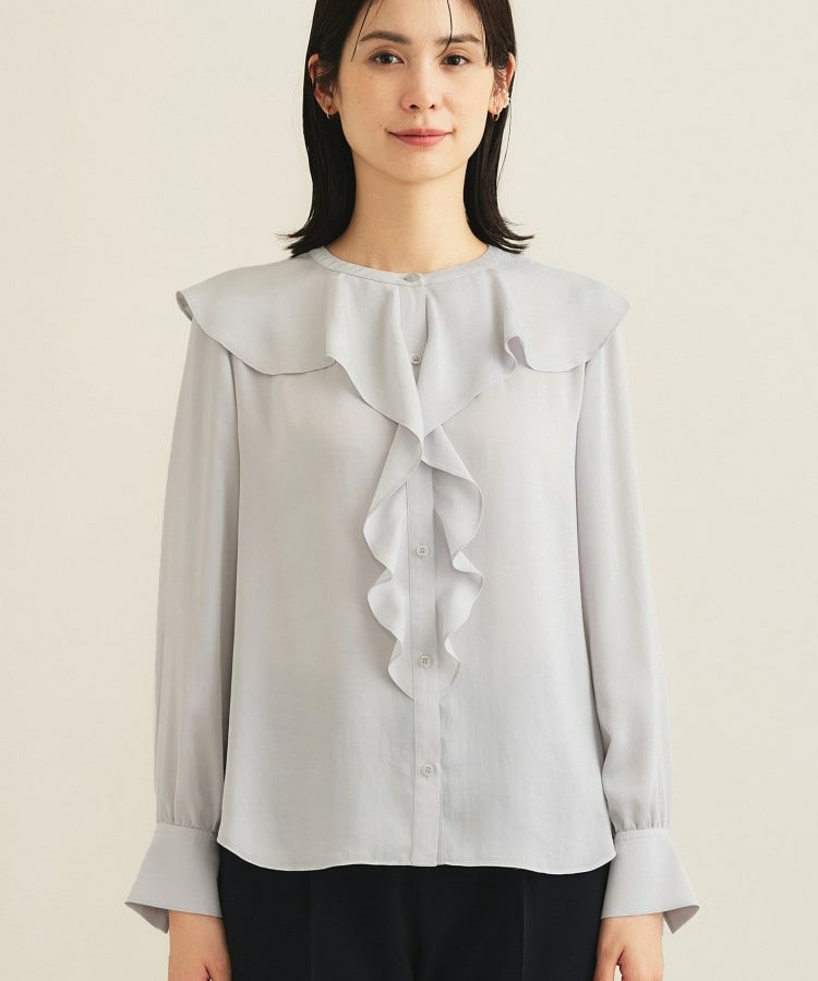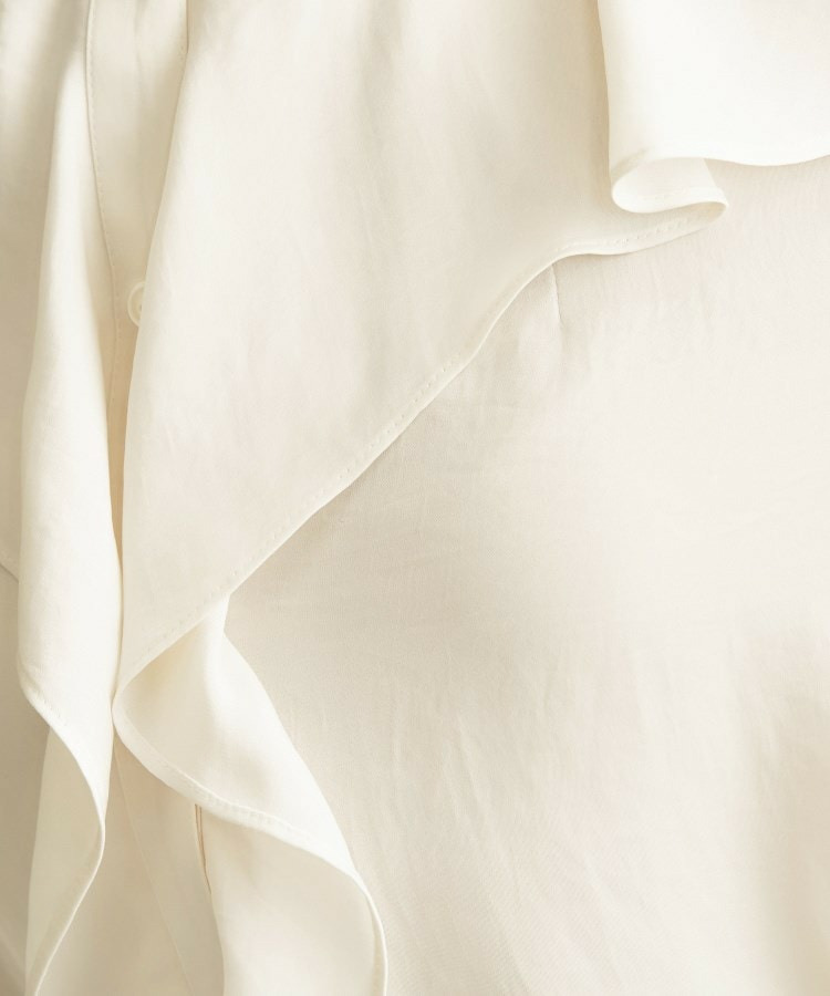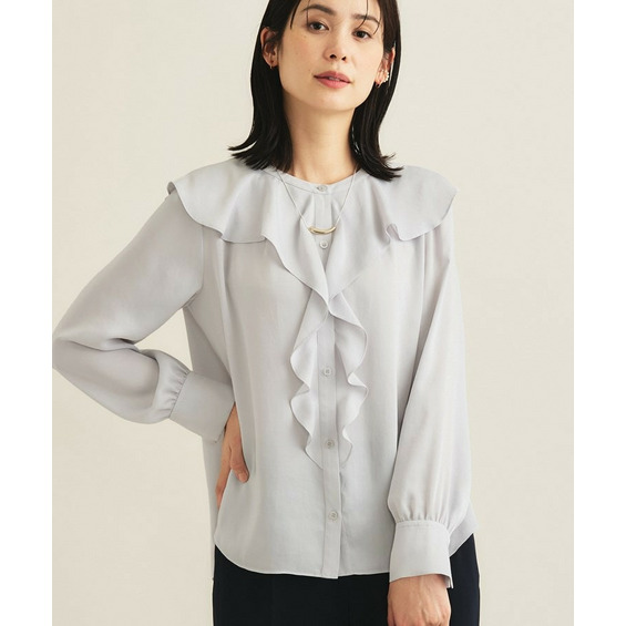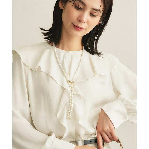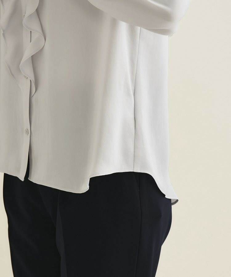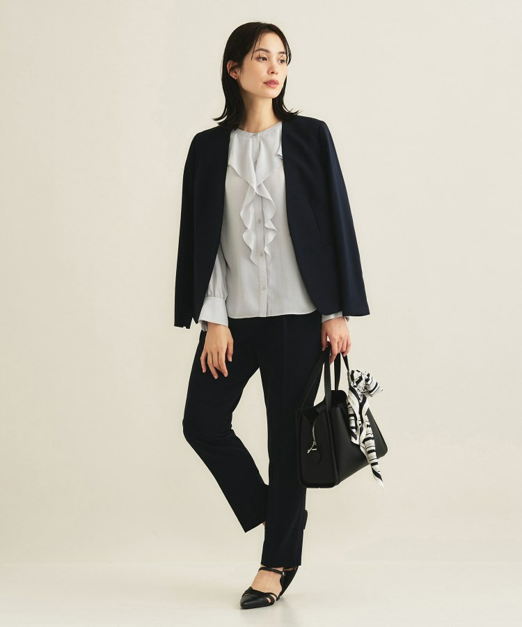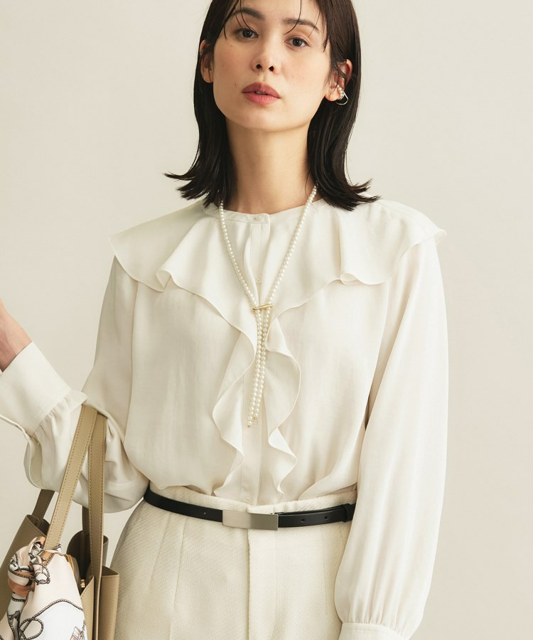 華やかなラッフルのデザインなのでオフィスで映える1枚着としてはもちろん、セレモニーの場面などでツイードジャケットのインナーにもおすすめです。