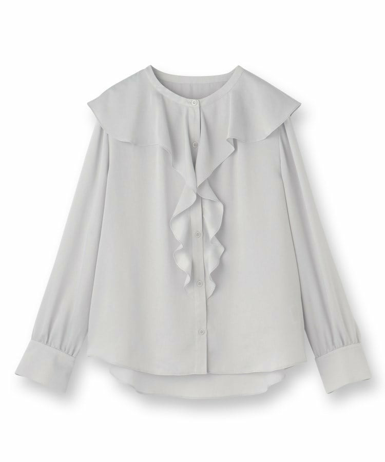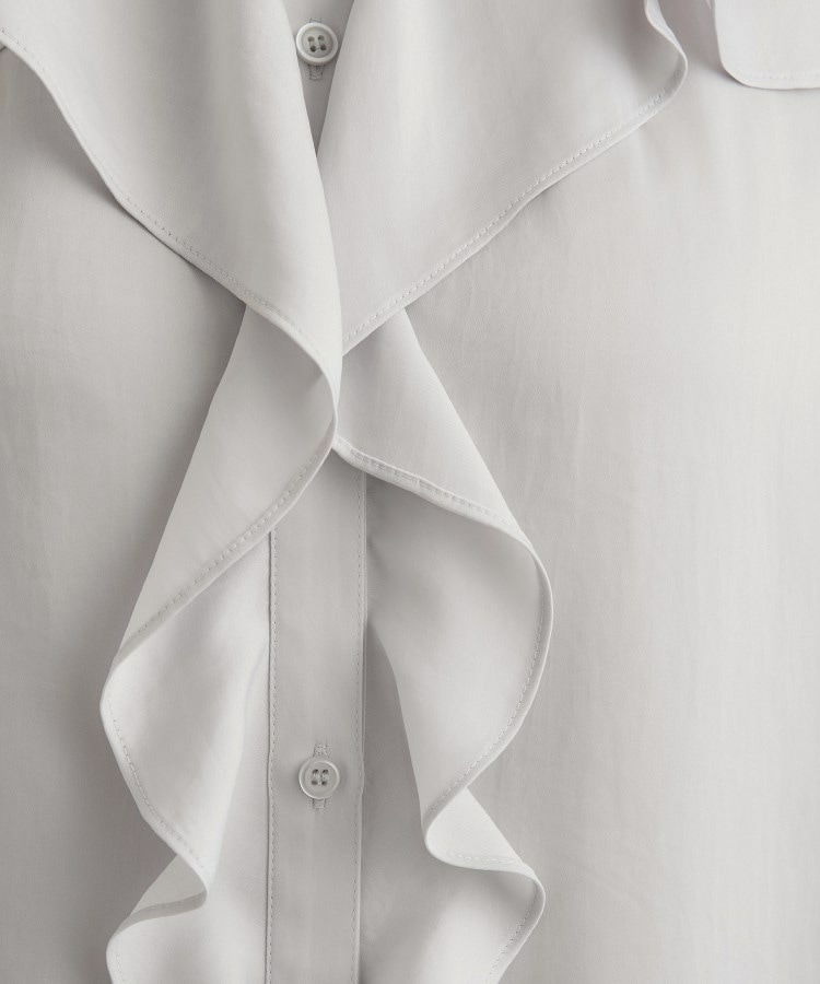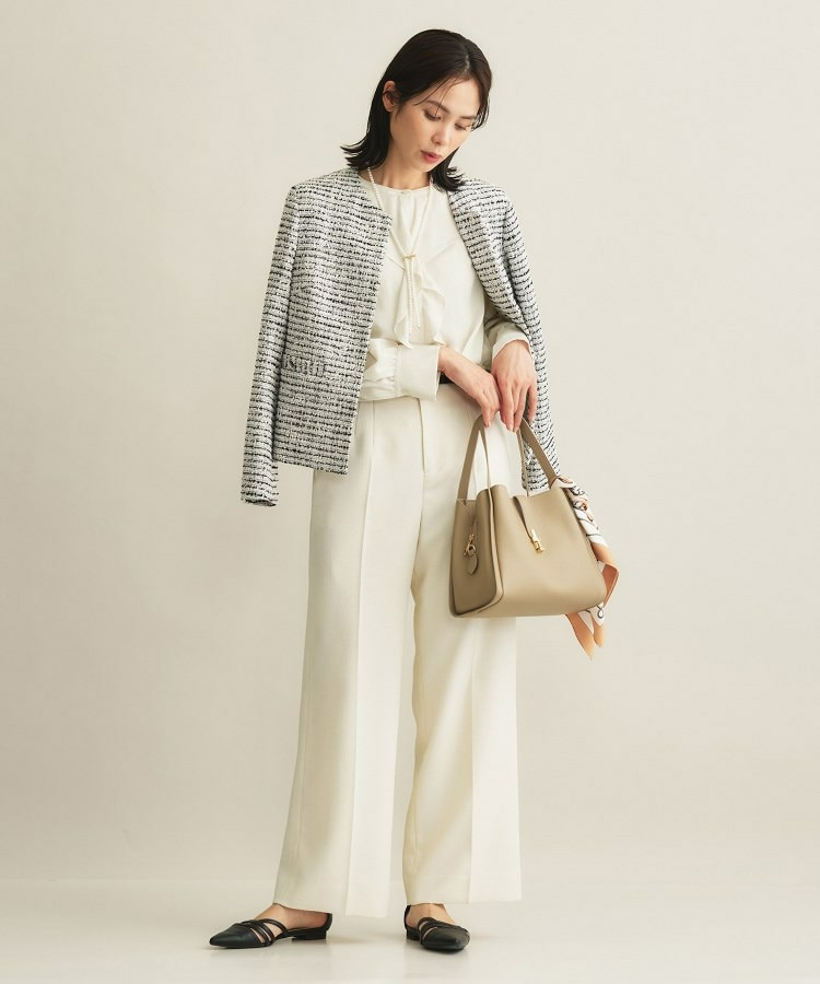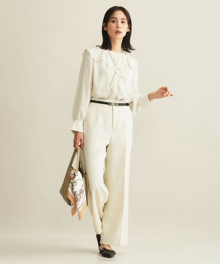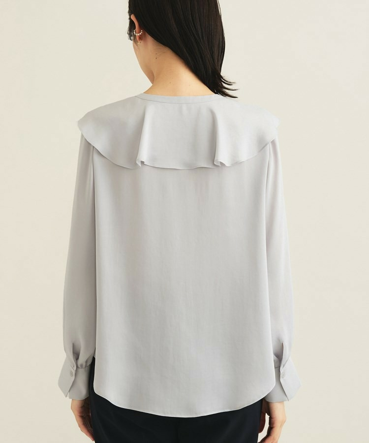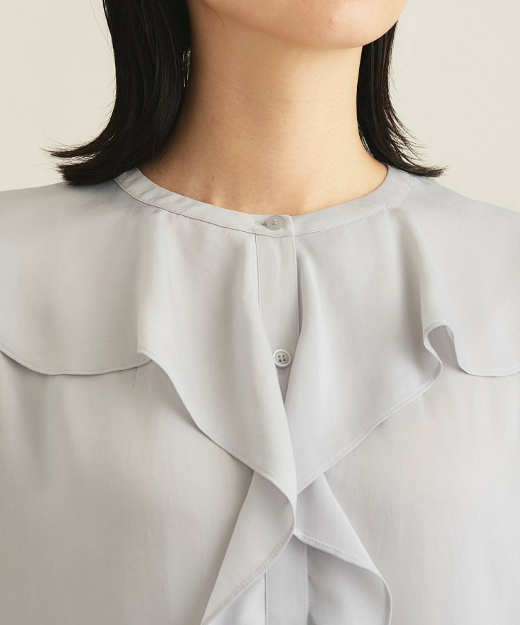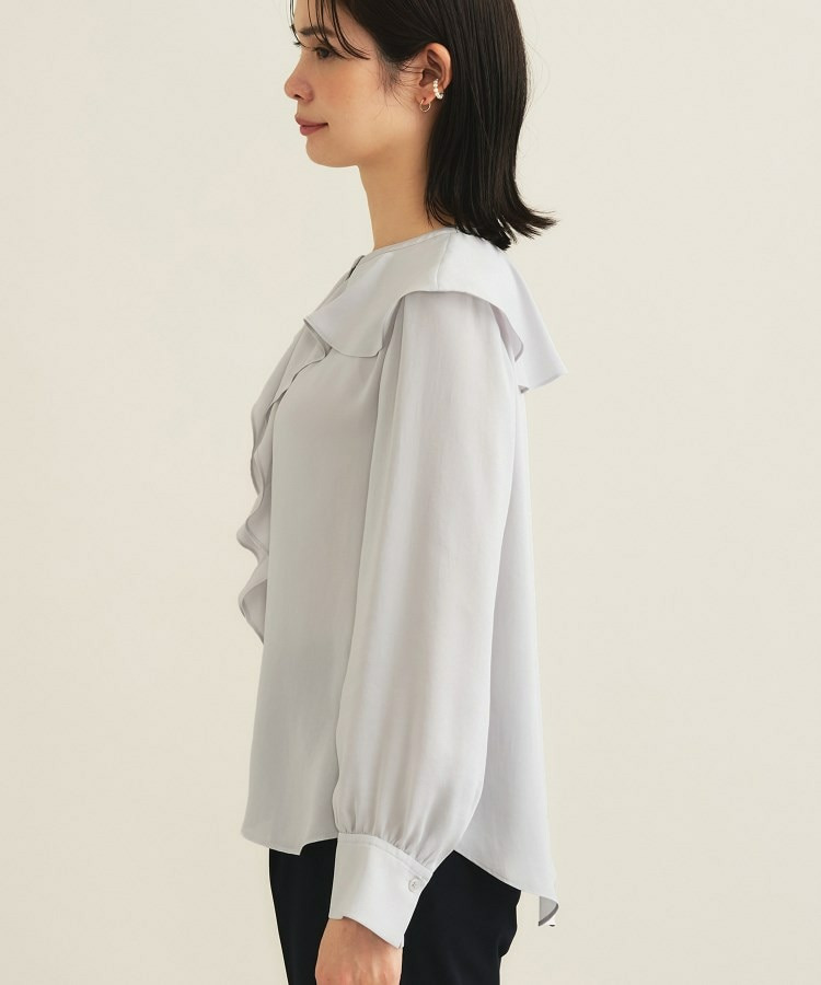 華やかなラッフルのデザインなのでオフィスで映える1枚着としてはもちろん、セレモニーの場面などでツイードジャケットのインナーにもおすすめです。