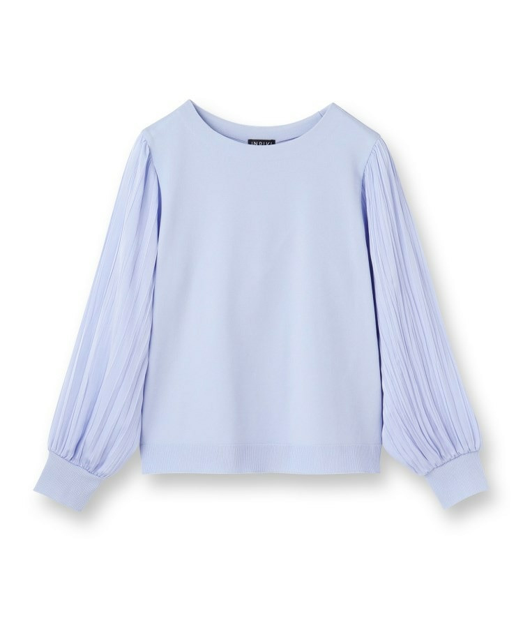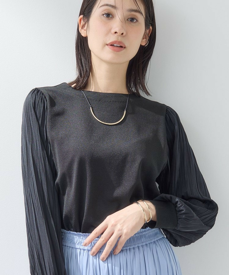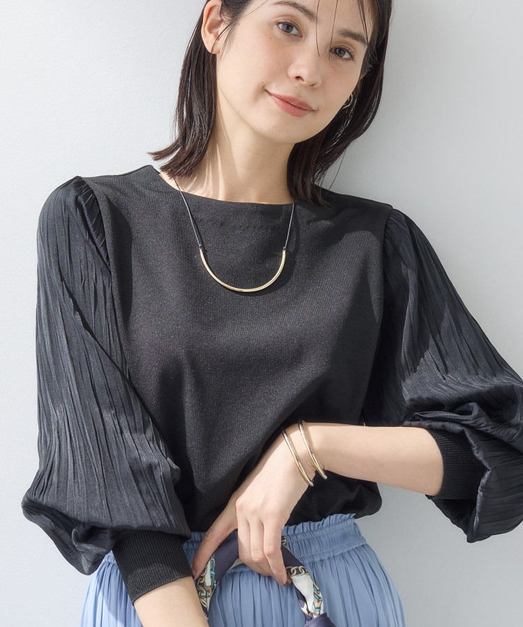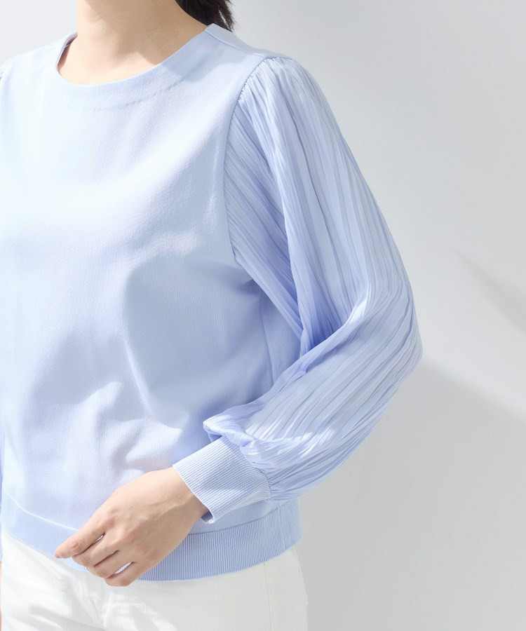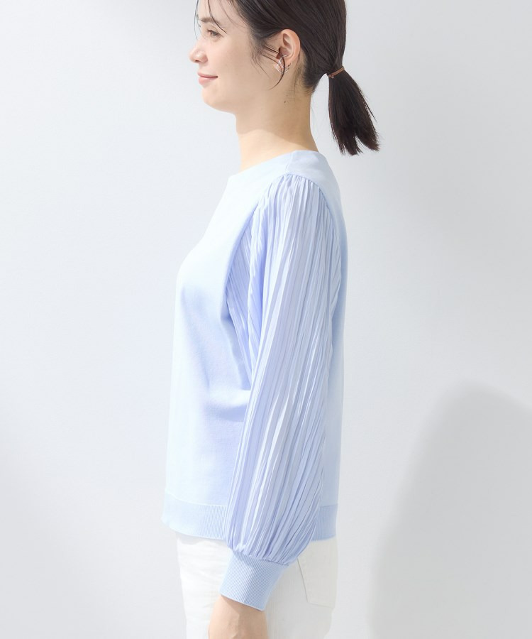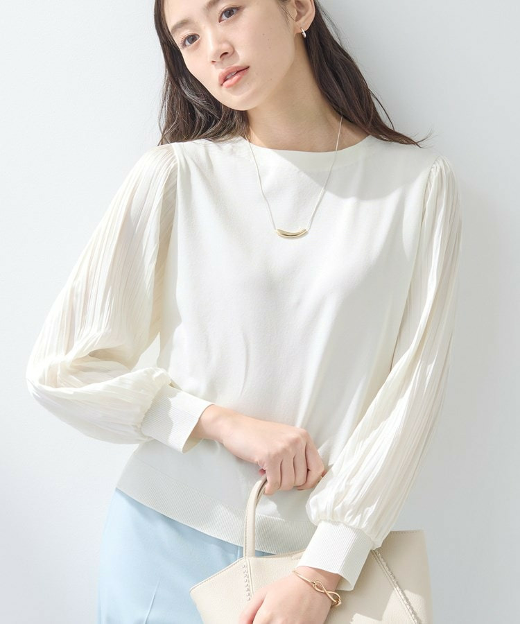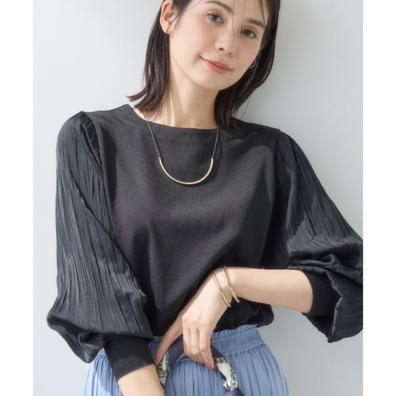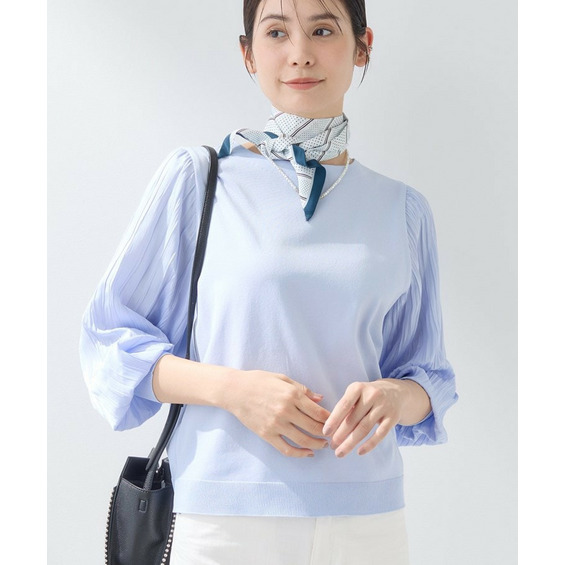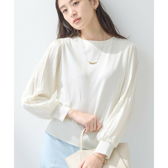 袖にプリーツ加工の布帛をあしらった丸首ニットです。