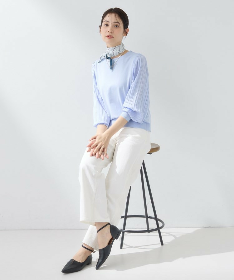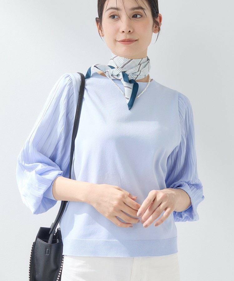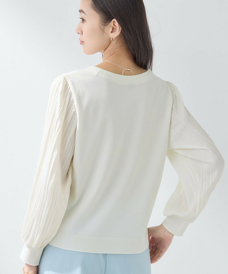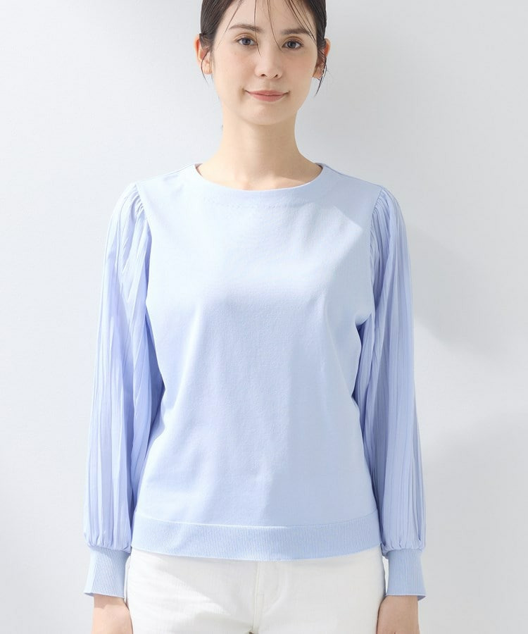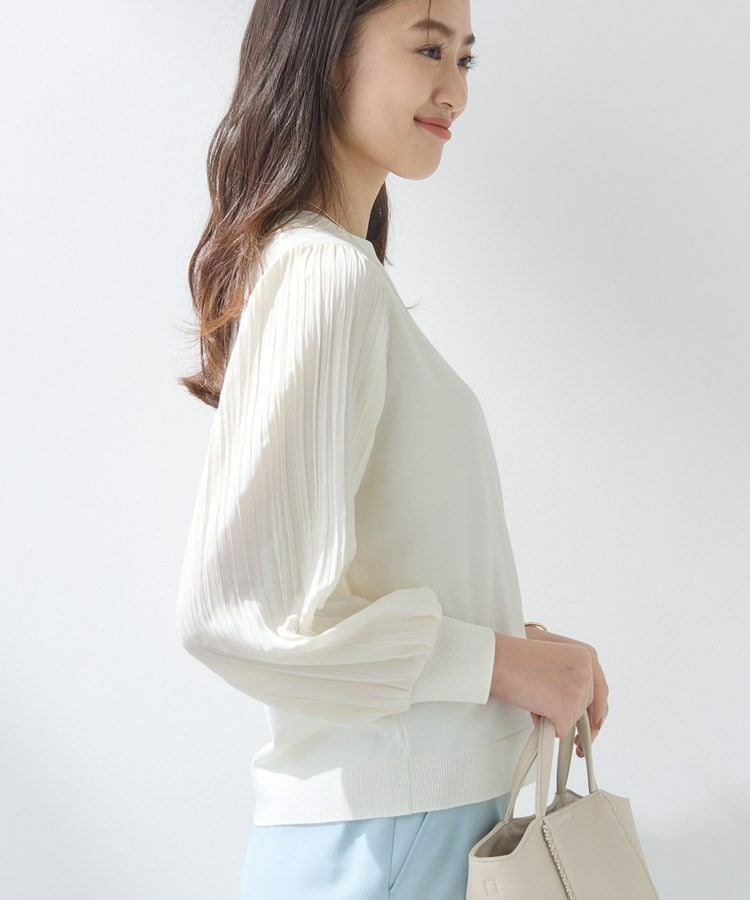 身頃は柔らかなニットで着心地がよく、袖の軽やかなプリーツ風しわ加工がポイントになり、女性らしさを引き立てます。