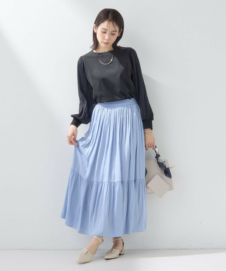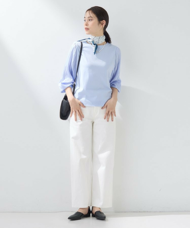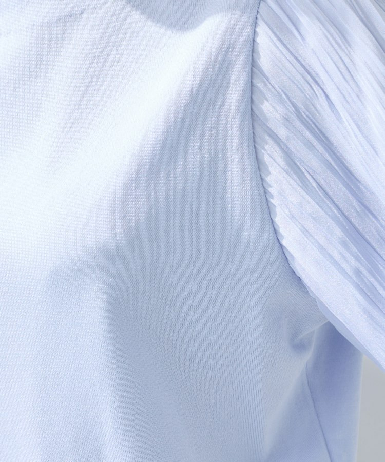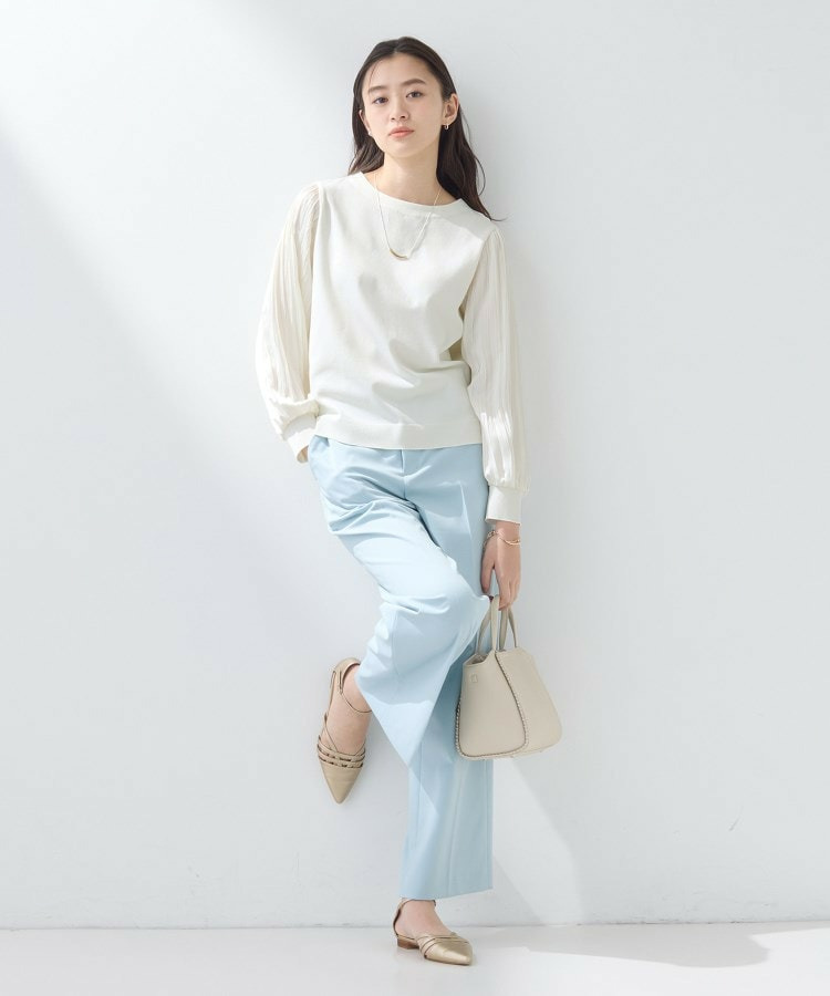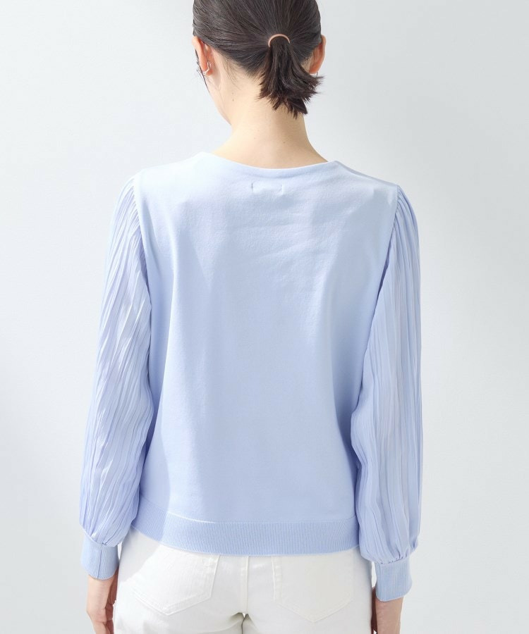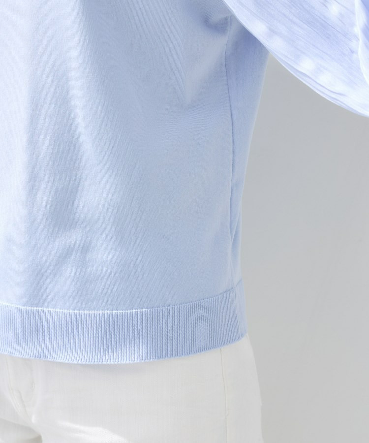 身頃は柔らかなニットで着心地がよく、袖の軽やかなプリーツ風しわ加工がポイントになり、女性らしさを引き立てます。