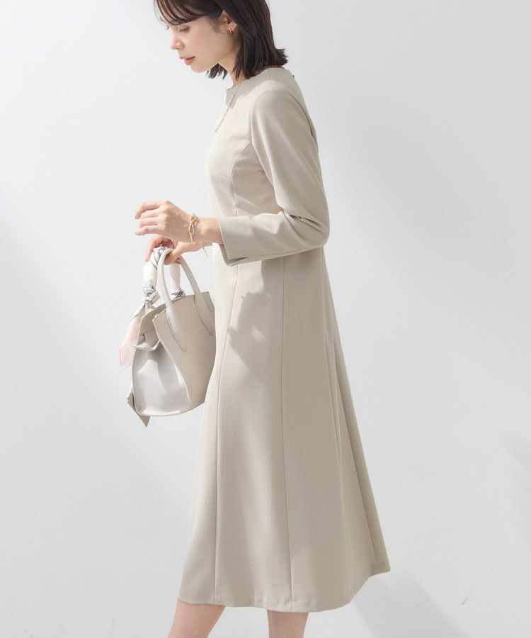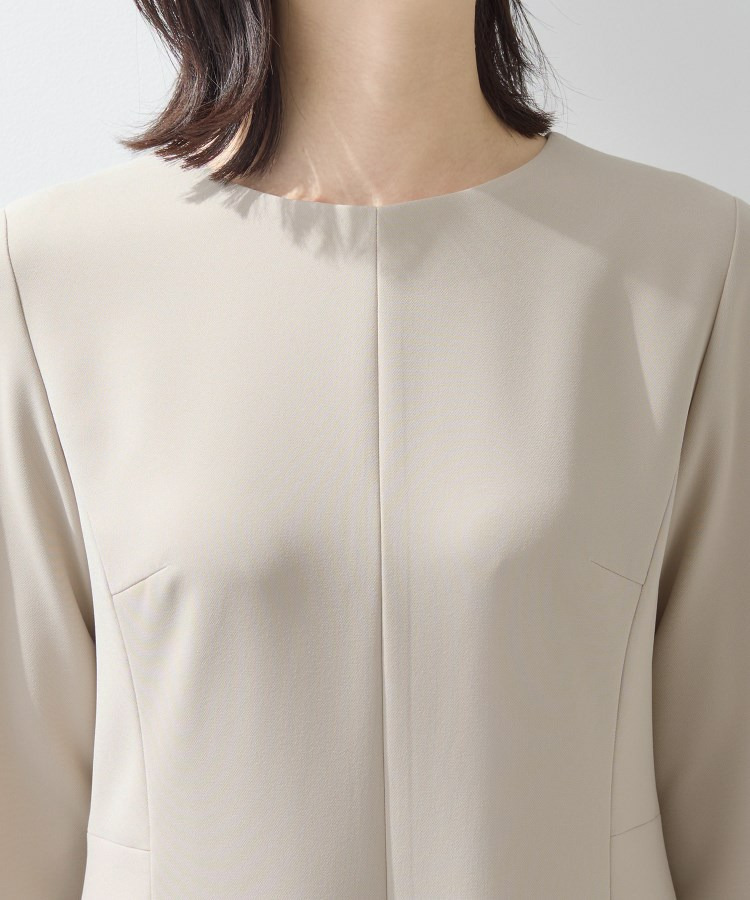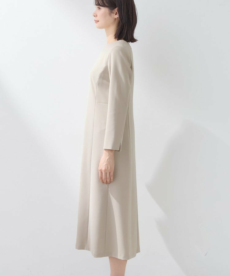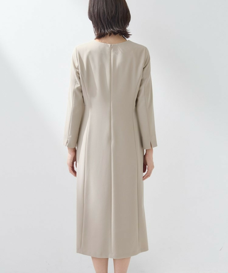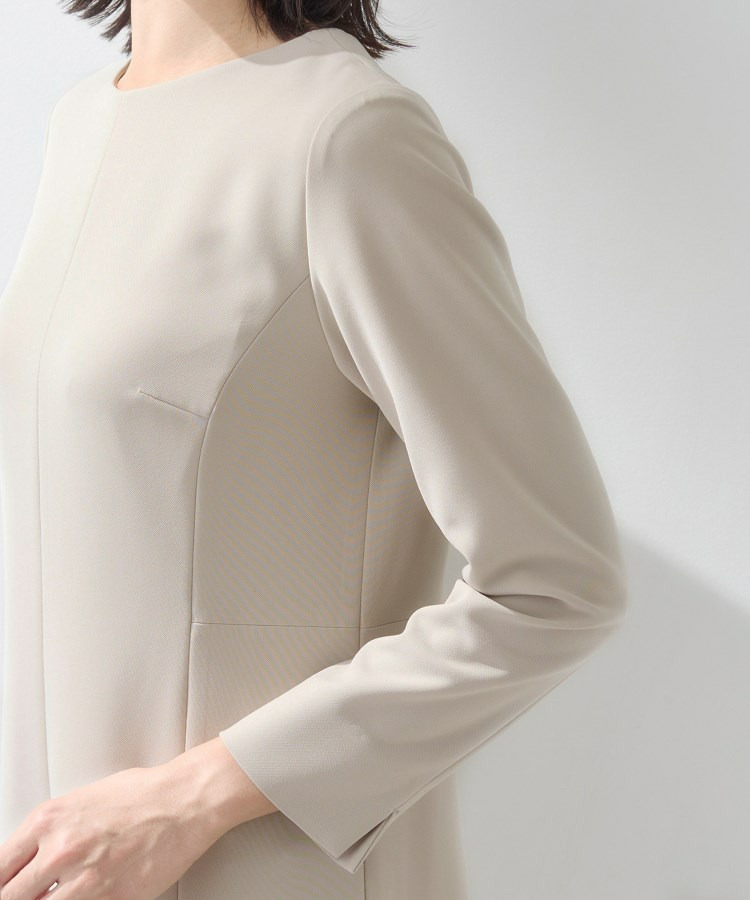 前中心とサイドのパネル切り替えデザインが視覚的にもすっきりと見せ、両脇のウエストに施されたウエスト切り替えがスタイルアップ見えとなるワンピースです。