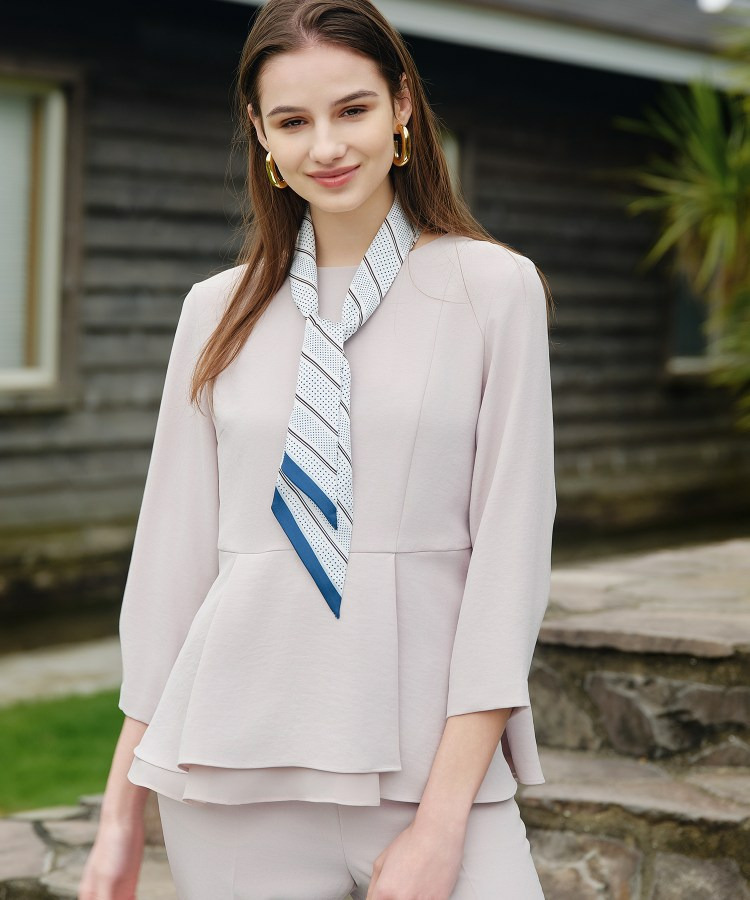 ペプラムやシフォン使いの良さを活かしながら、アシンメトリーデザインと裾からのぞくシフォンでアップデートしたブラウスです。