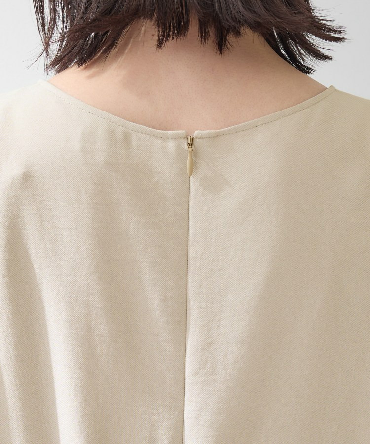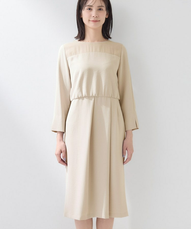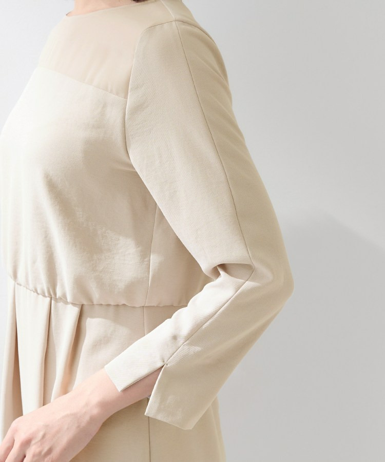 ウエストはブラウジングしたデザインなのでウエスト周りもカバーし、少し高めのウエスト位置で設定しているのでスタイルアップ見え効果も期待できるワンピースとなっています。