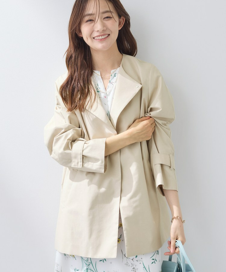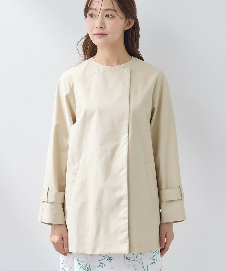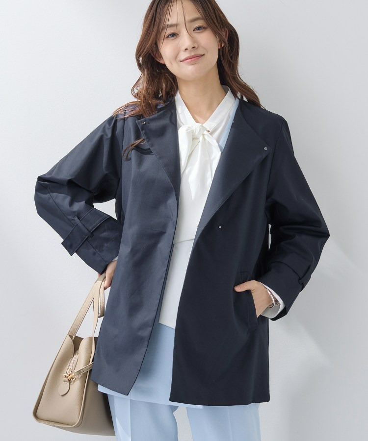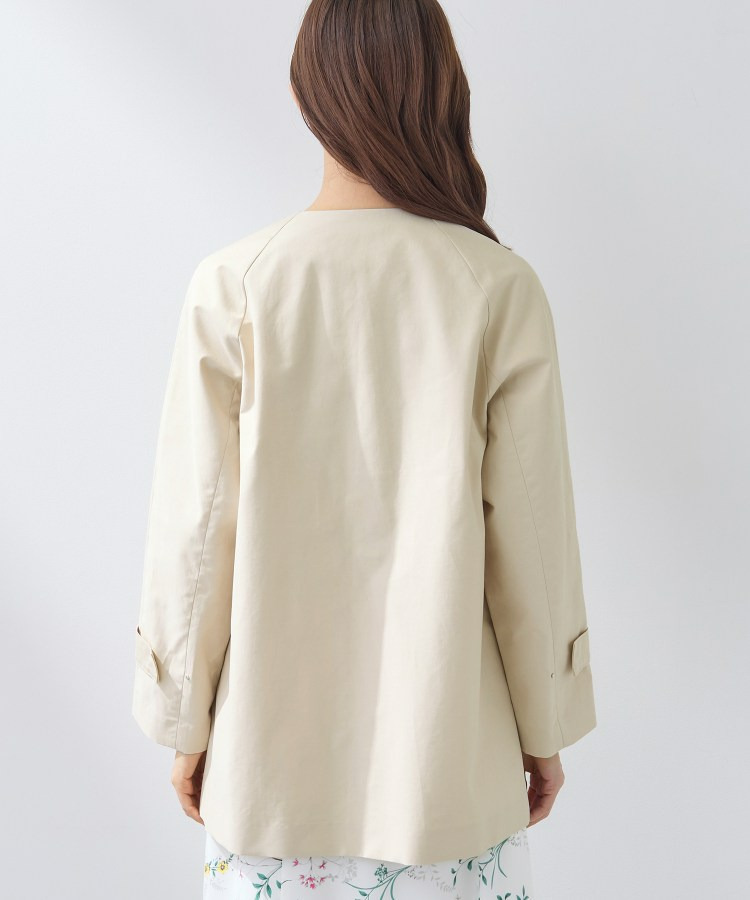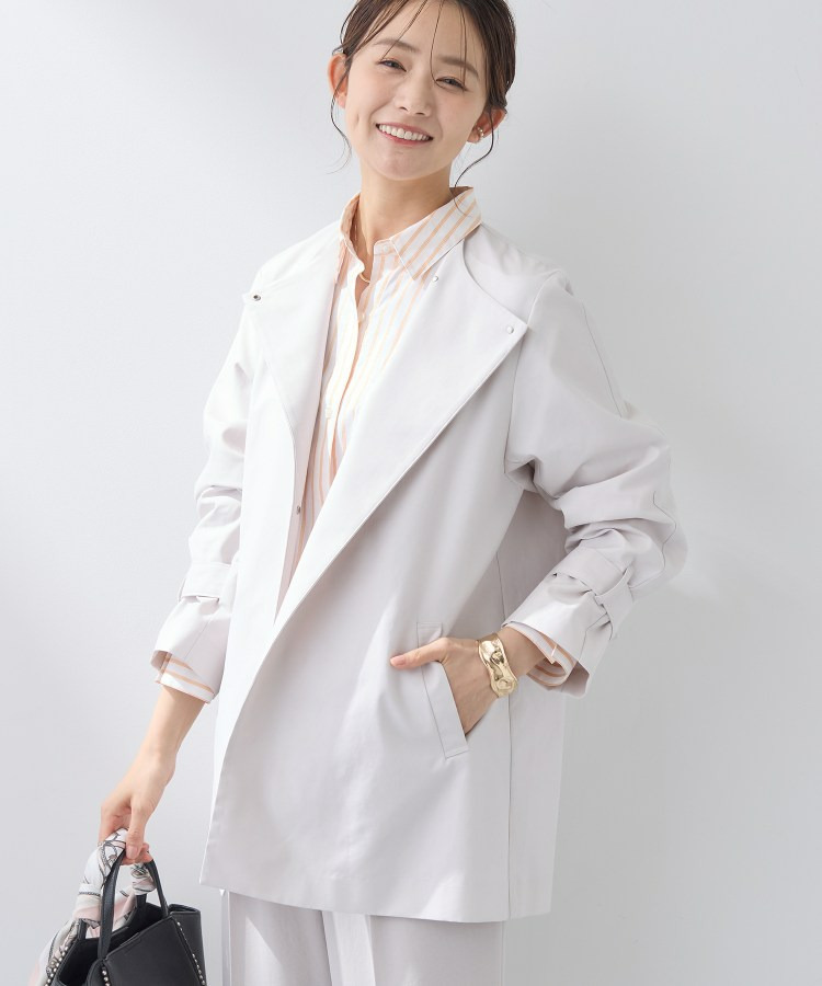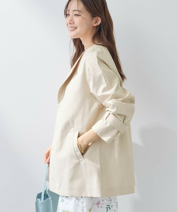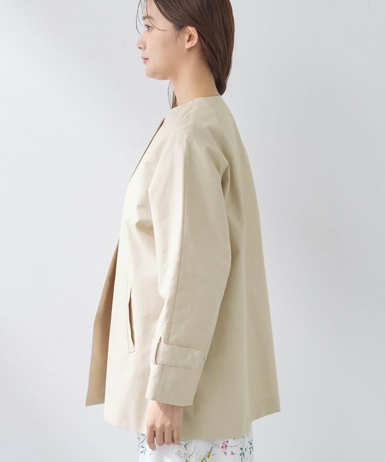 シンプルなノーカラーながら、袖ぐりのトレンチデザインを効かせたクラシカルな印象も持っています。