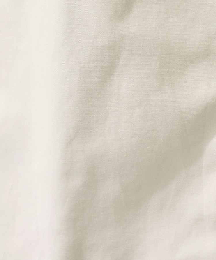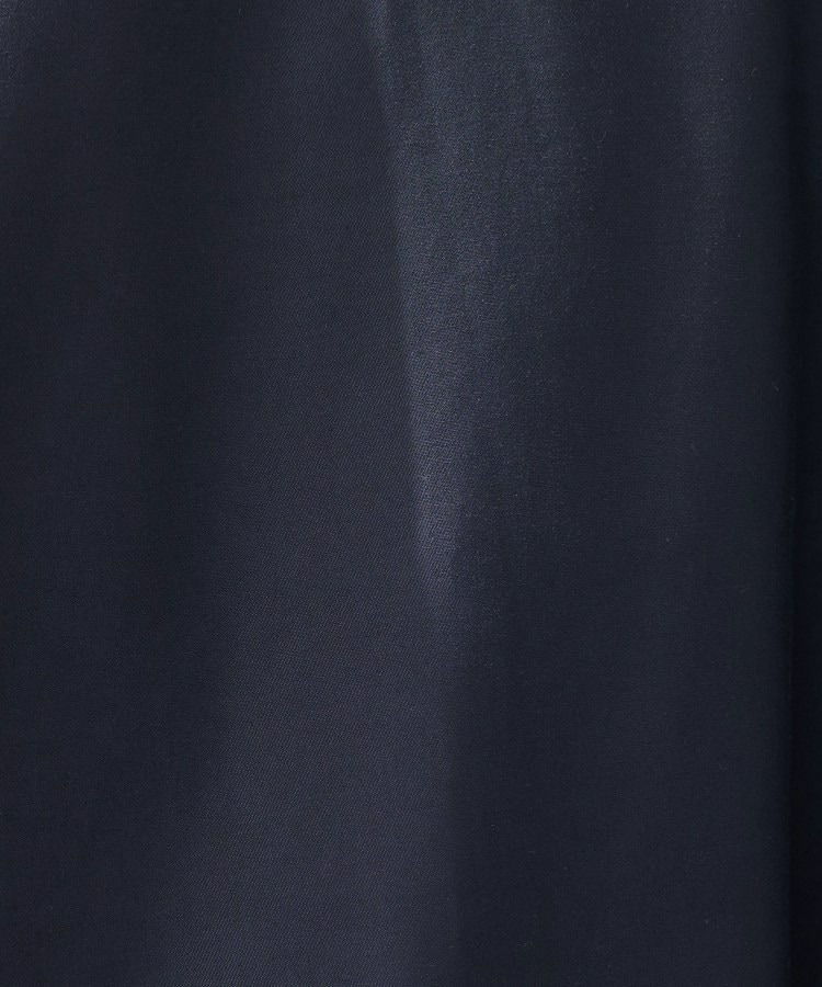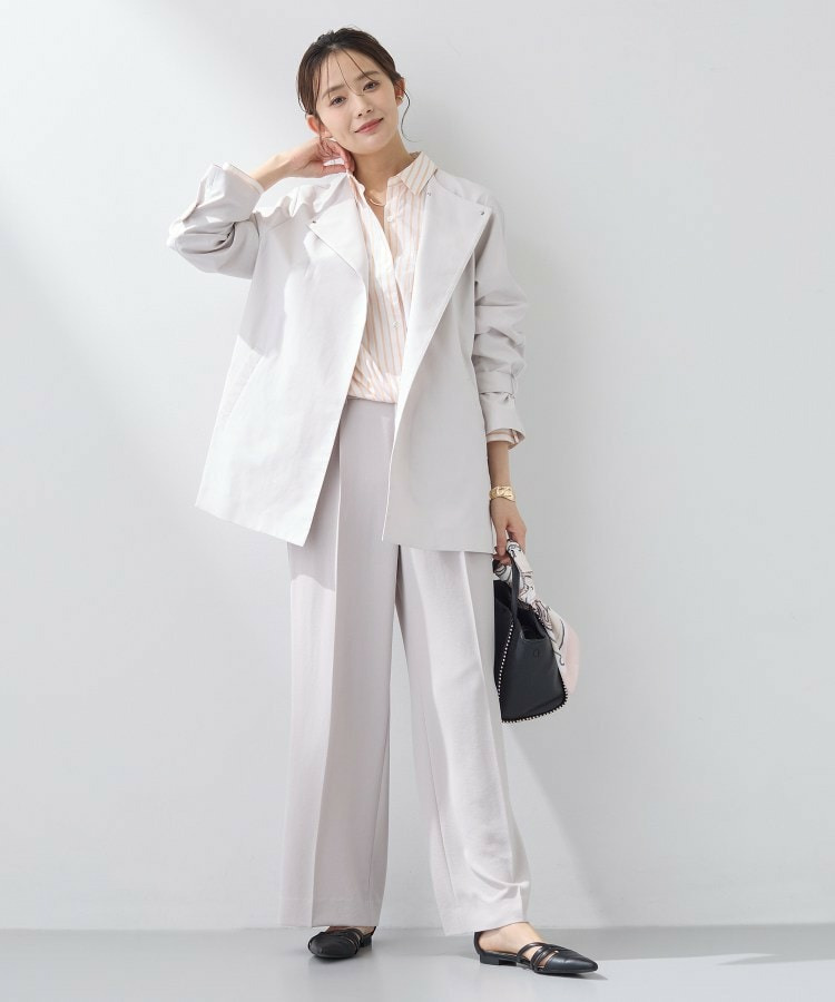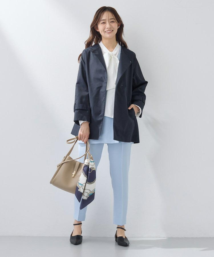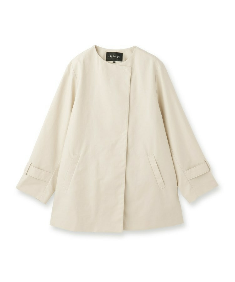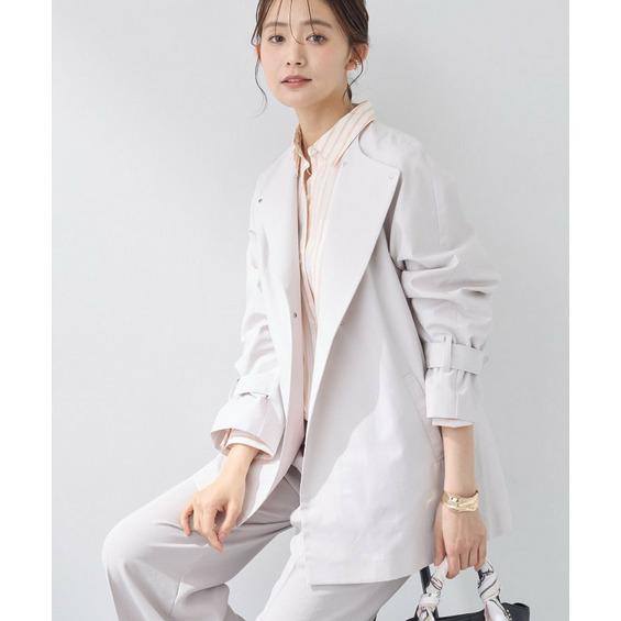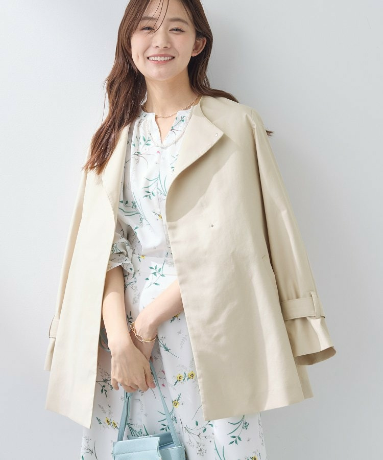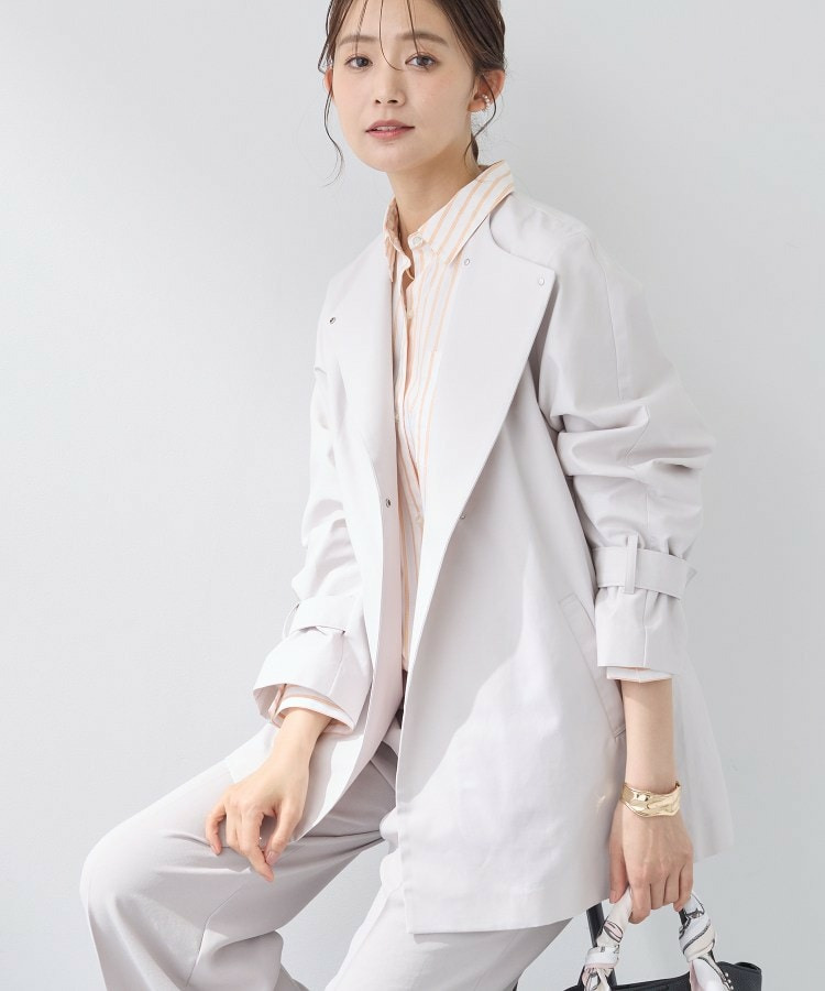 シンプルなノーカラーながら、袖ぐりのトレンチデザインを効かせたクラシカルな印象も持っています。