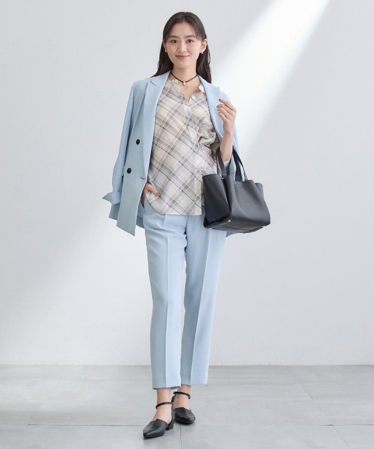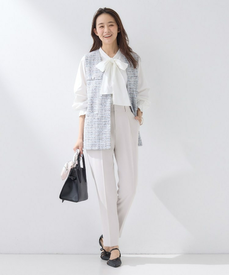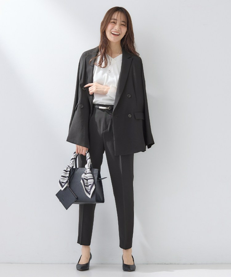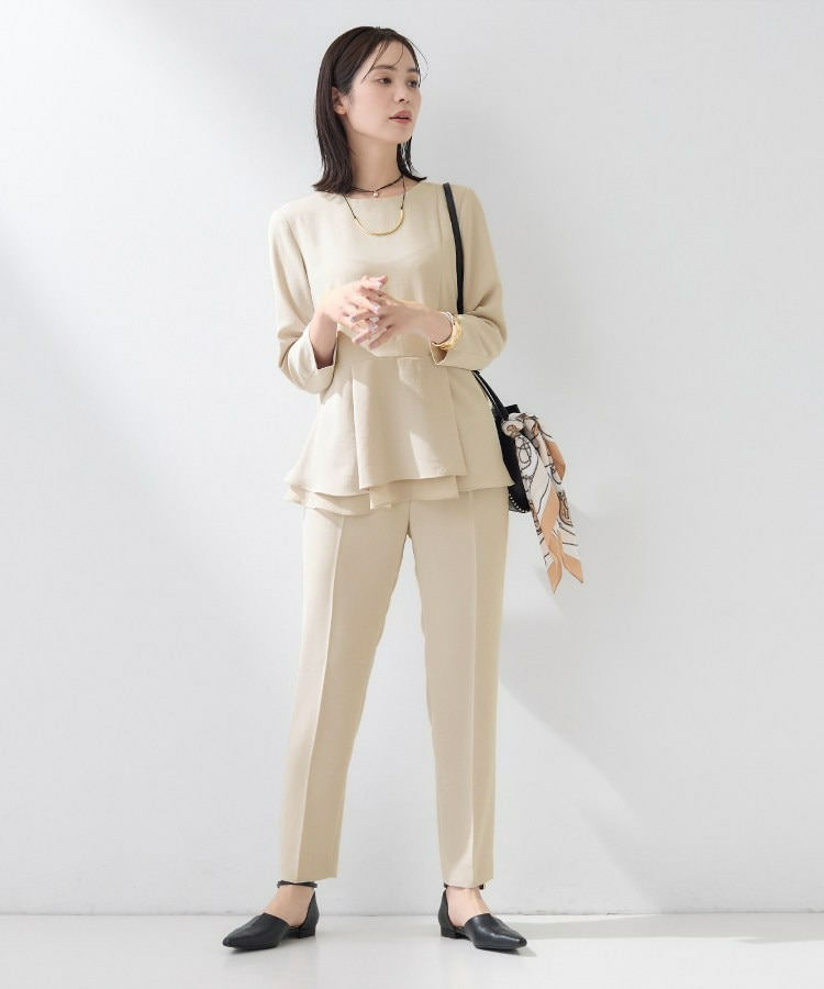 同素材のペプラムブラウスと合わせたセットアップスタイルもセレモニー、通勤用としておすすめです。
