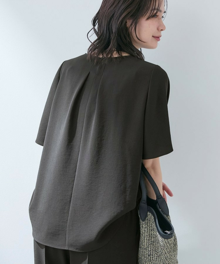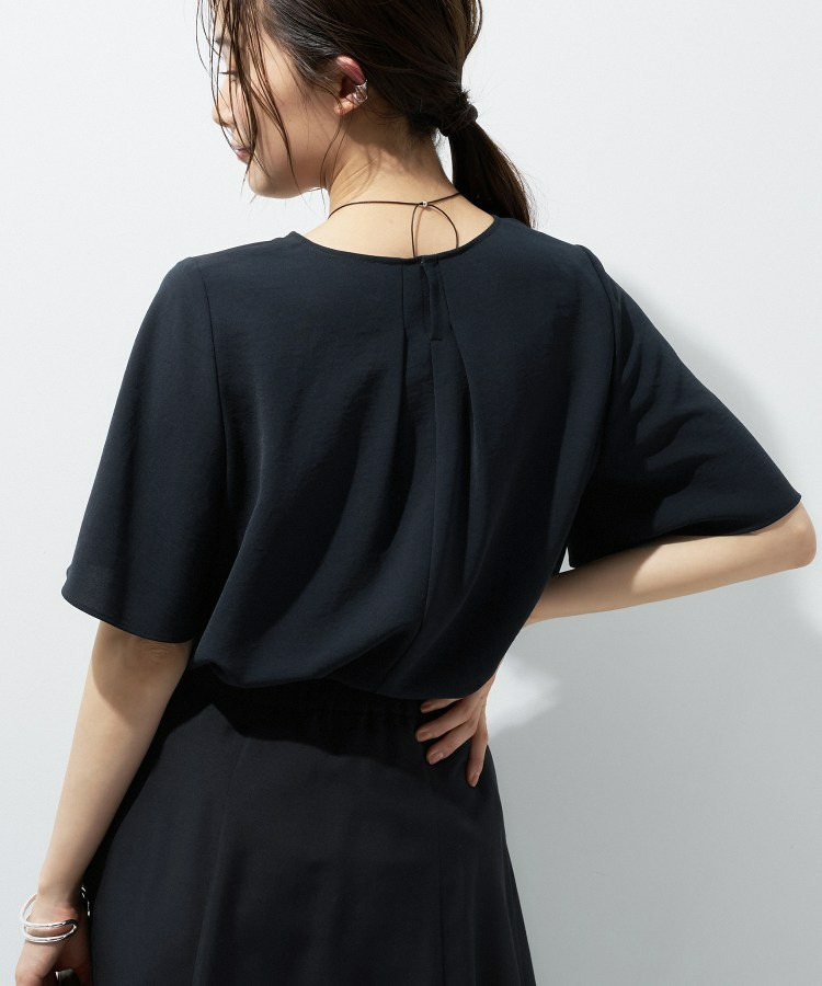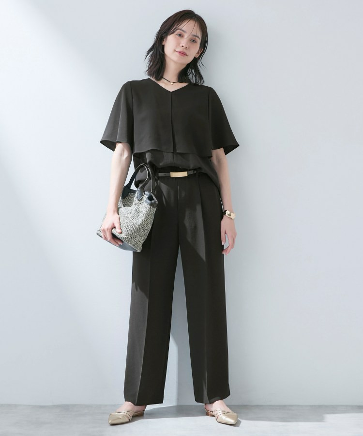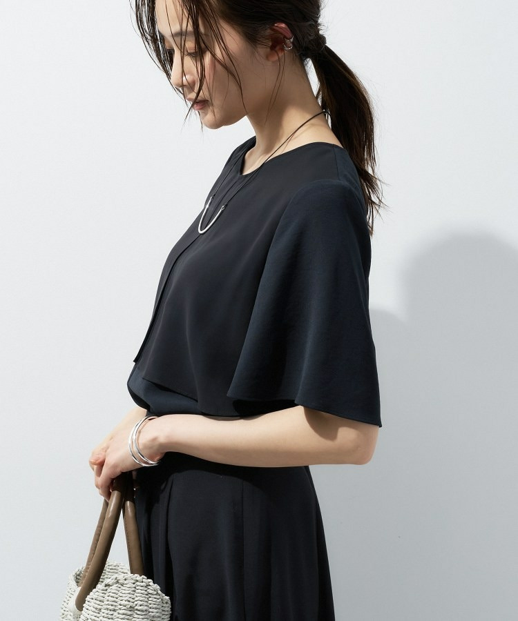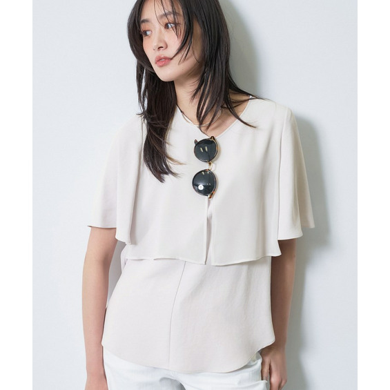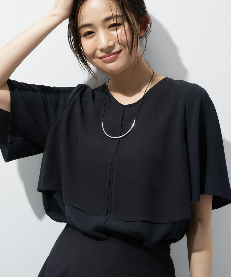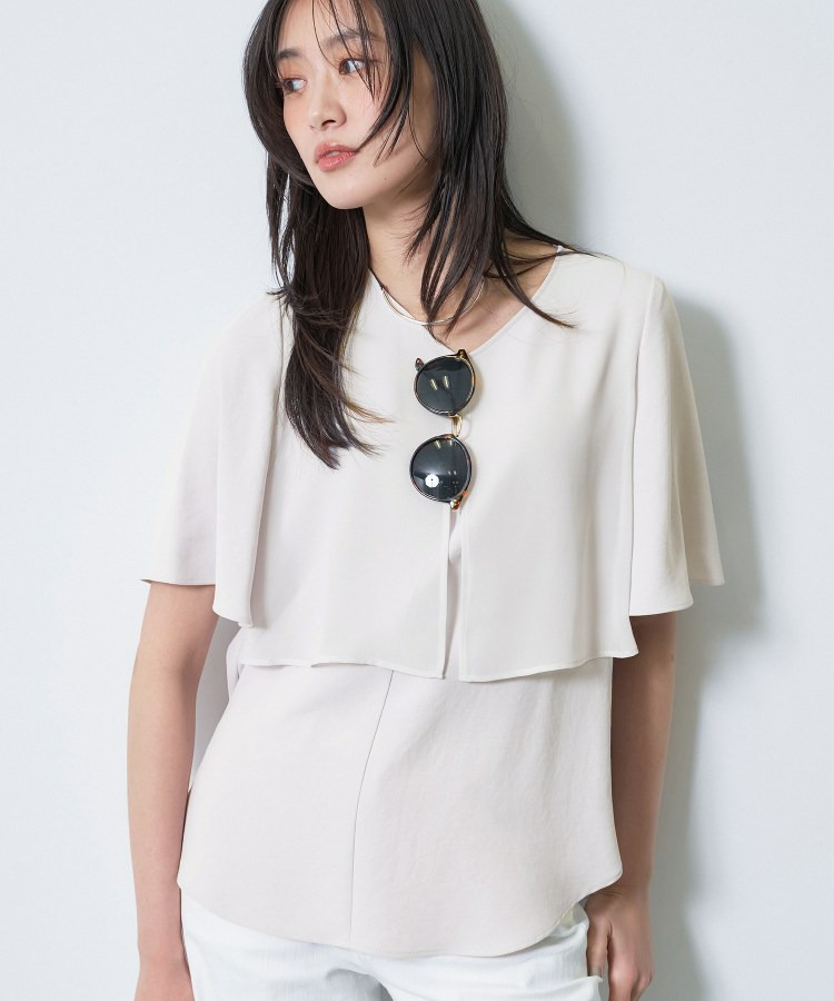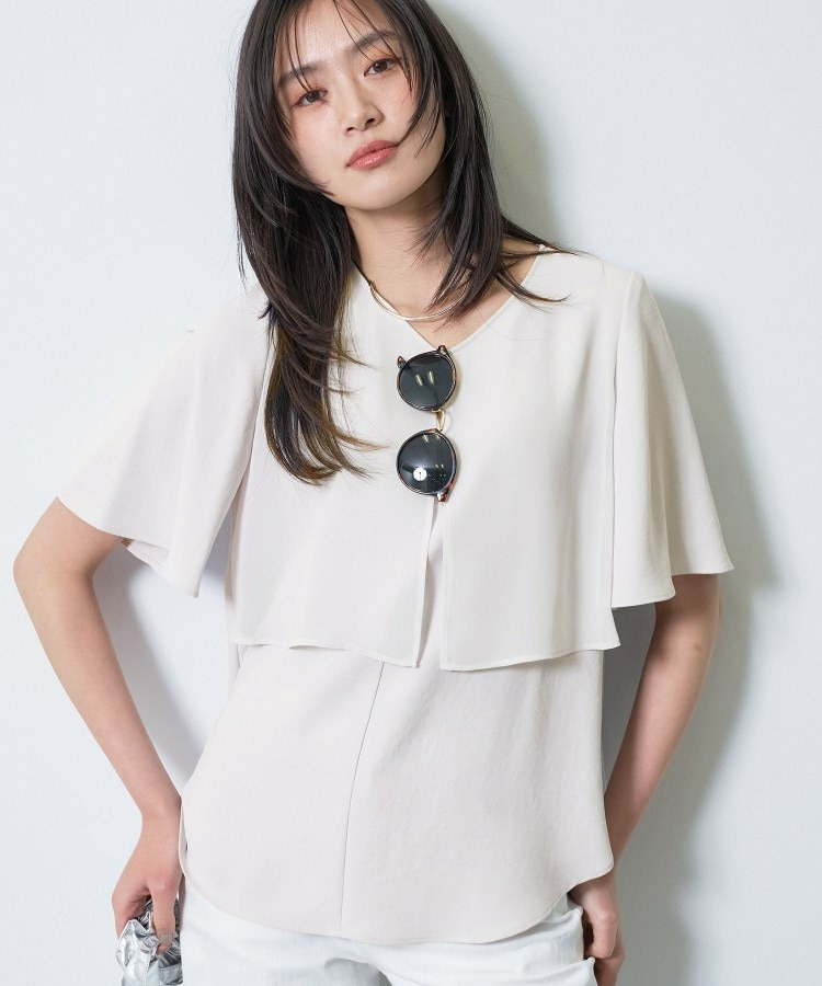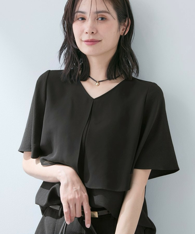 袖のフレアスリーブとフロントのシフォン使いが軽やかなブラウスです。