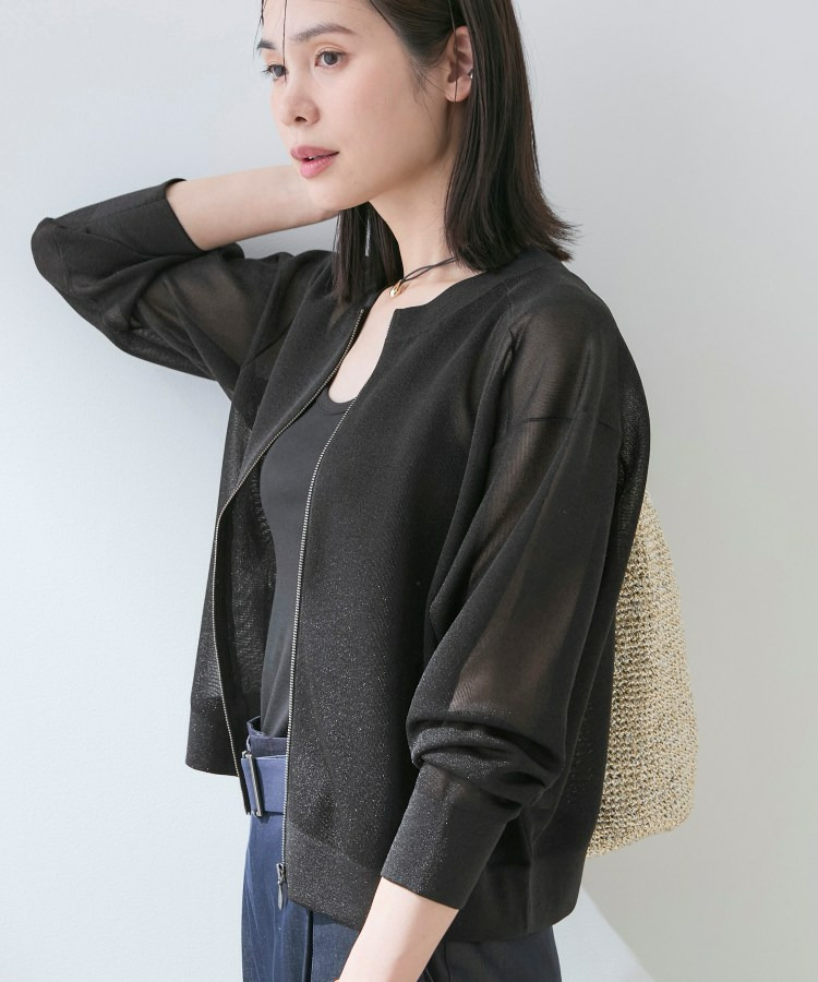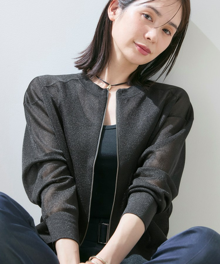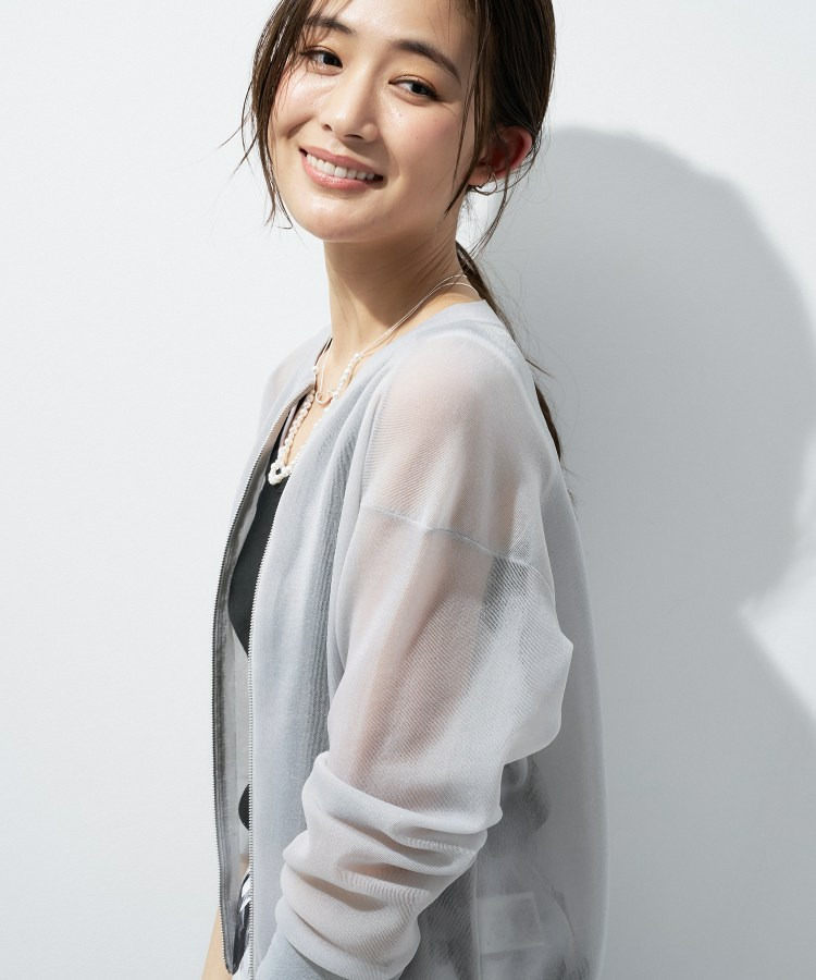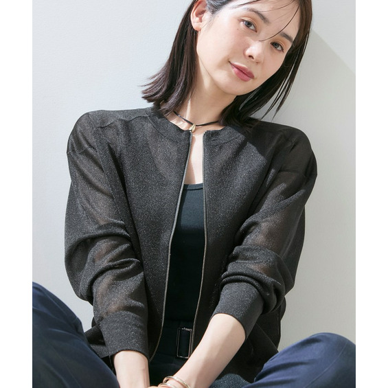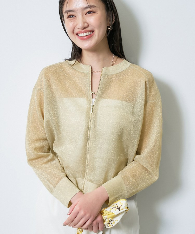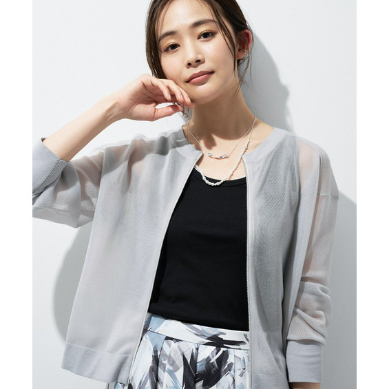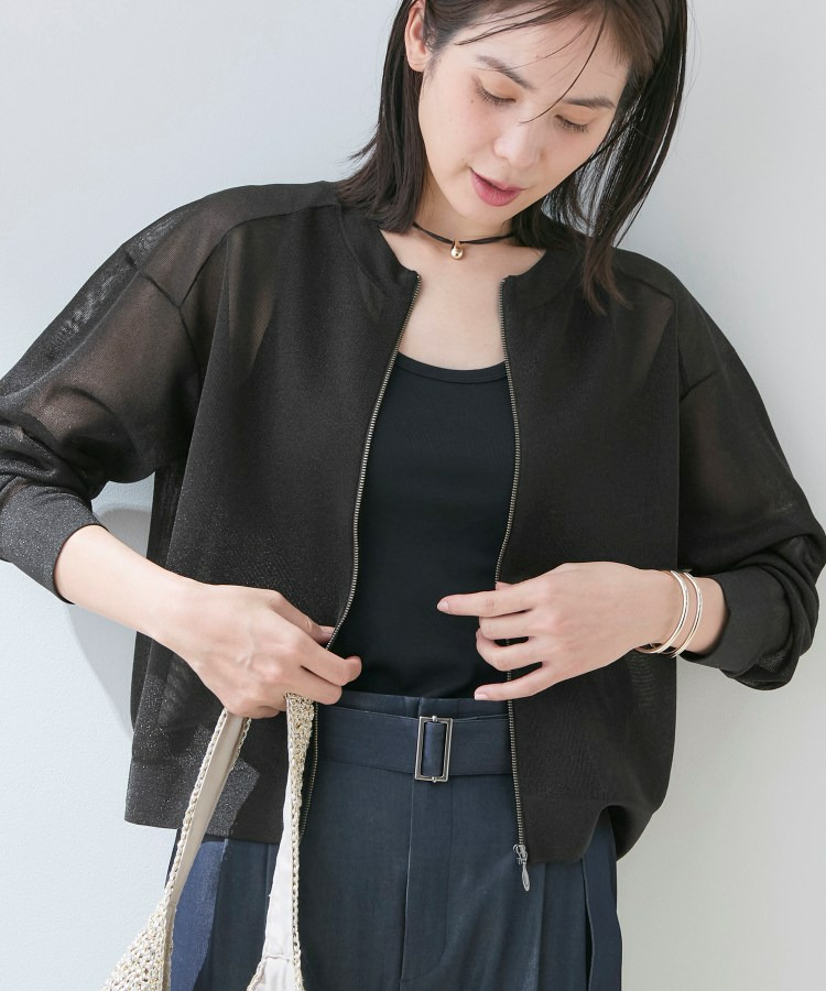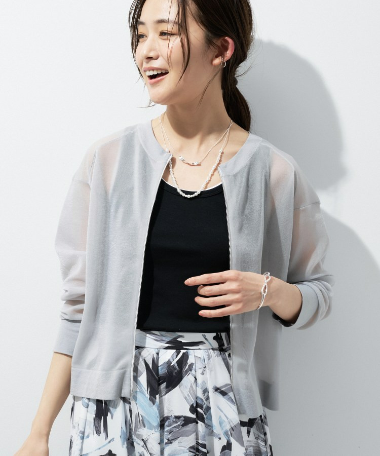 ほんのり透け感のあるシアー素材を、スムース編みで仕上げたブルゾンタイプのニットカーディガンです。