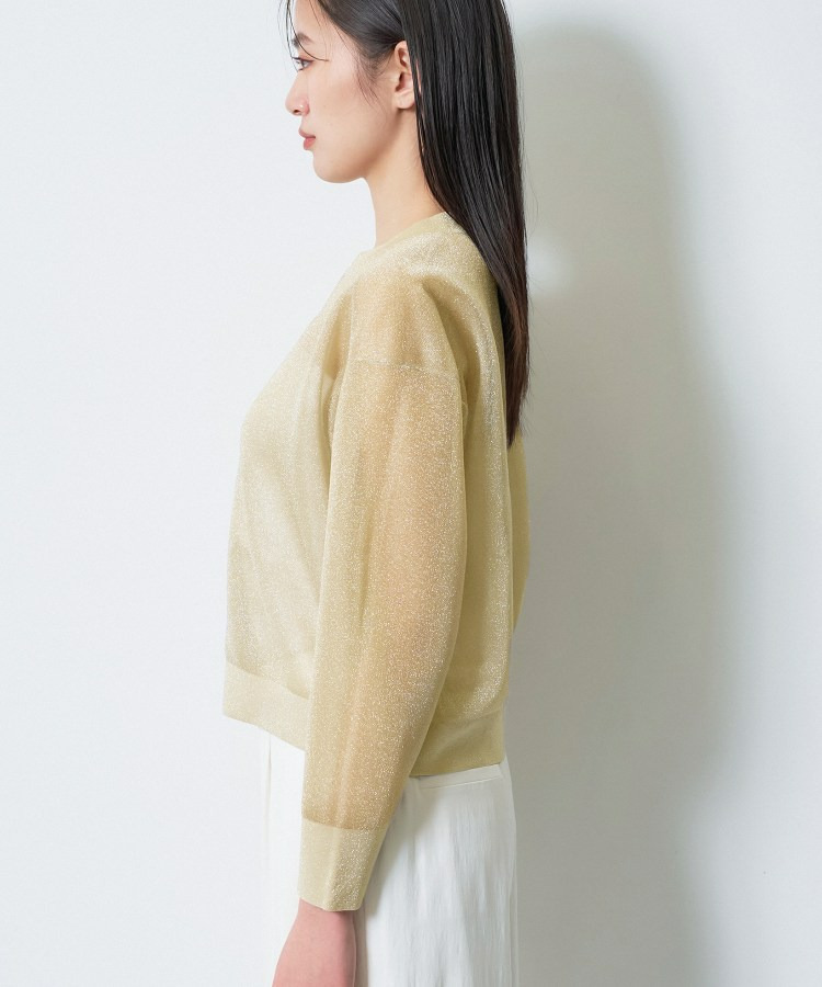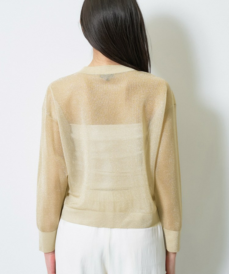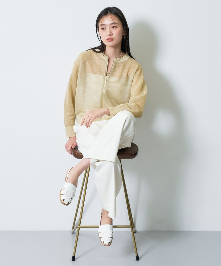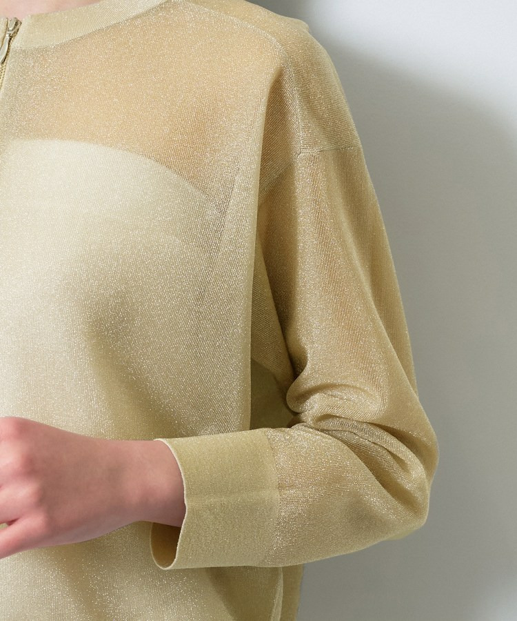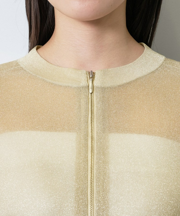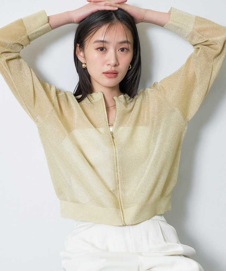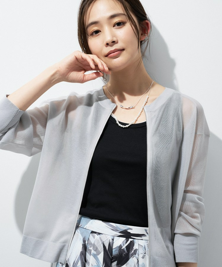 ほんのり透け感のあるシアー素材を、スムース編みで仕上げたブルゾンタイプのニットカーディガンです。