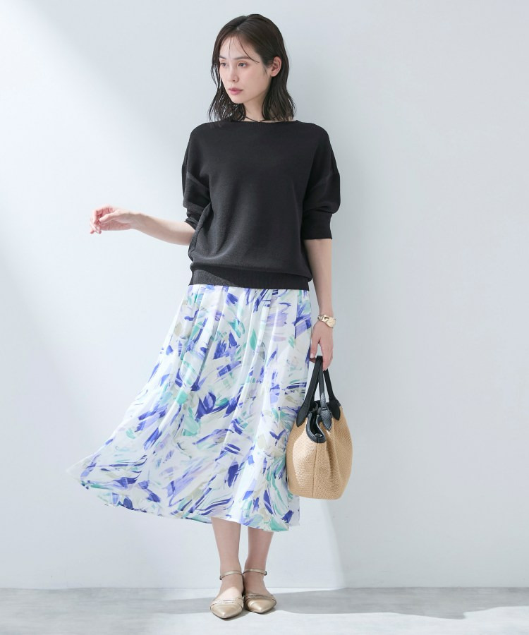 ボートネックの抜け感が、シンプルなスカートスタイルにさりげない華やかさをプラスします。