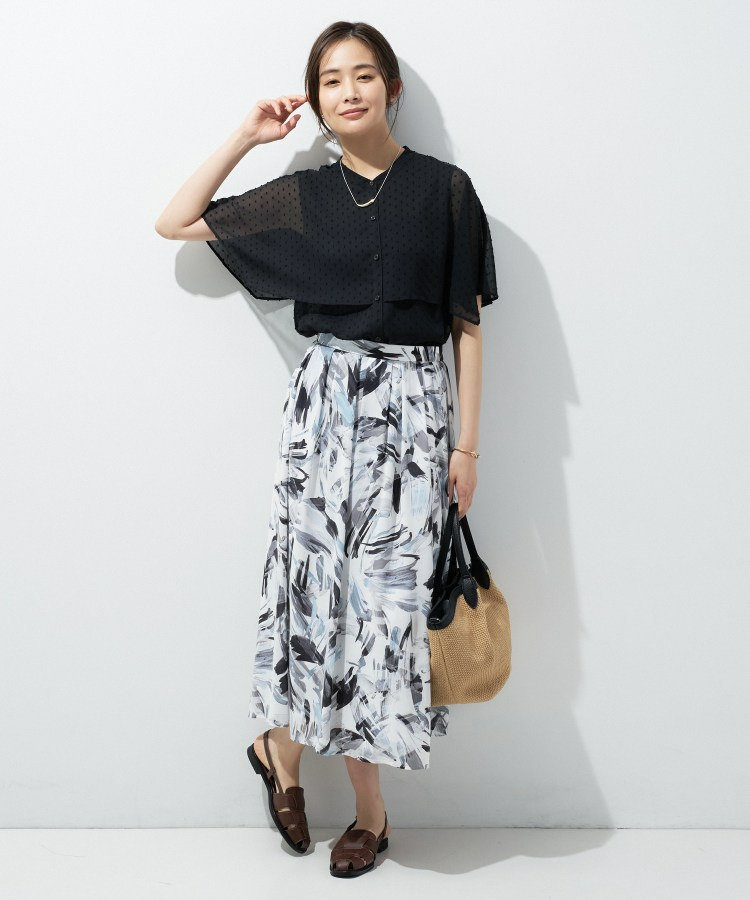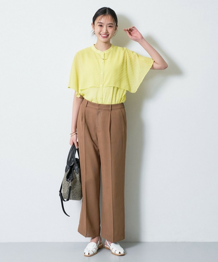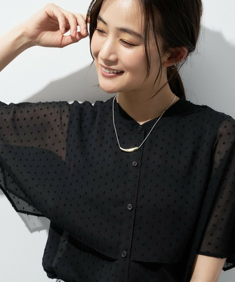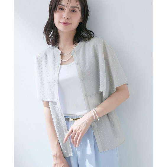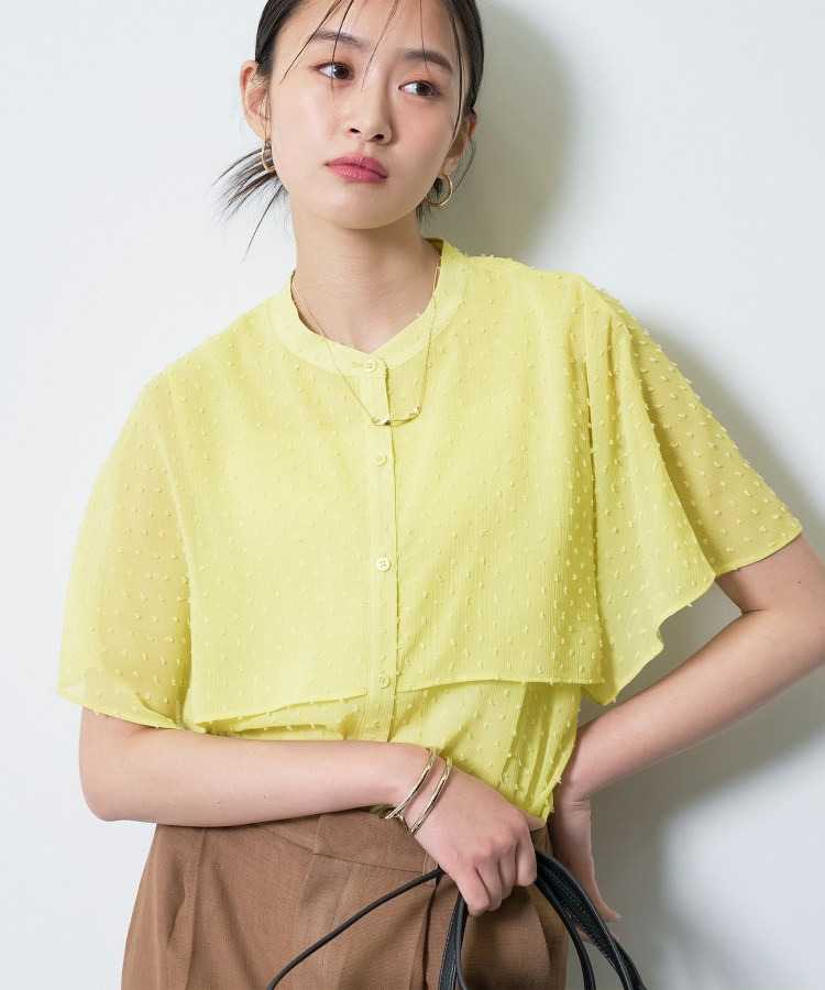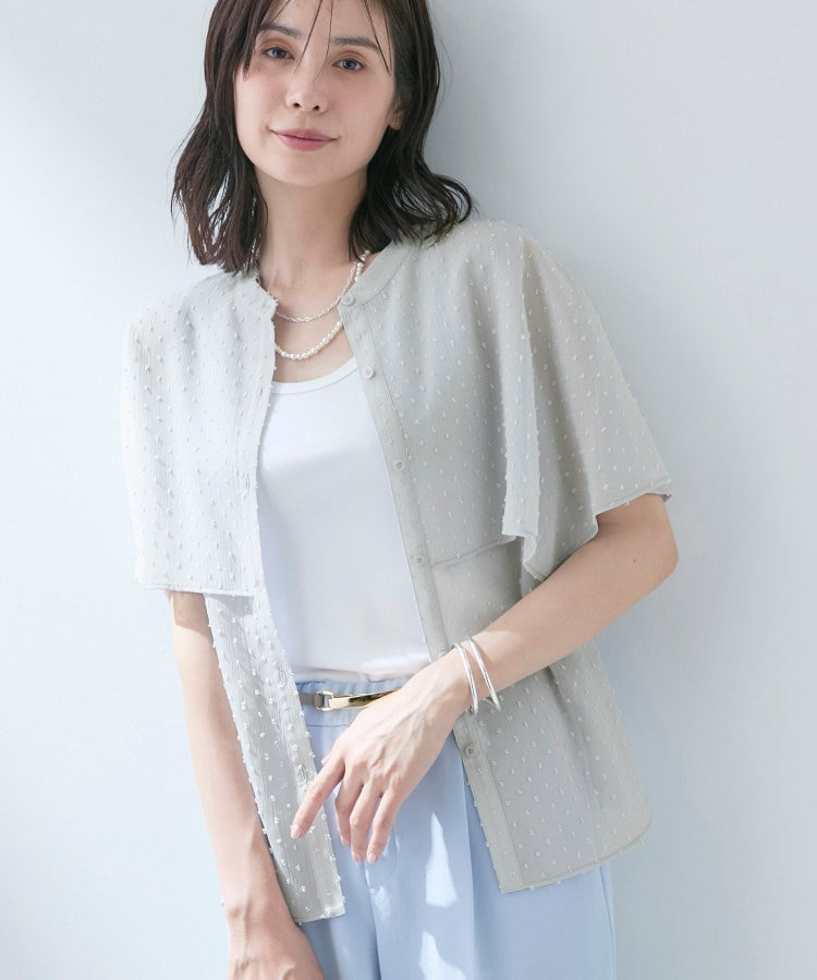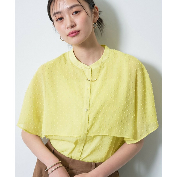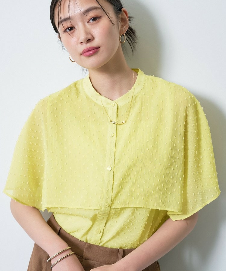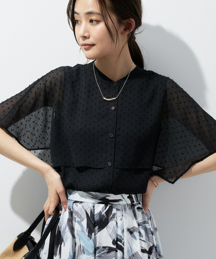 軽やかなジャカード素材にケープデザインのアクセントを取り入れたブラウスは1枚着としてこれからの季節に活躍するアイテムです。