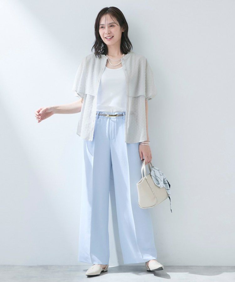 二の腕をカバーしてくれる袖丈と身体離れのよいケープ袖は軽やかな印象でご着用いただけます。