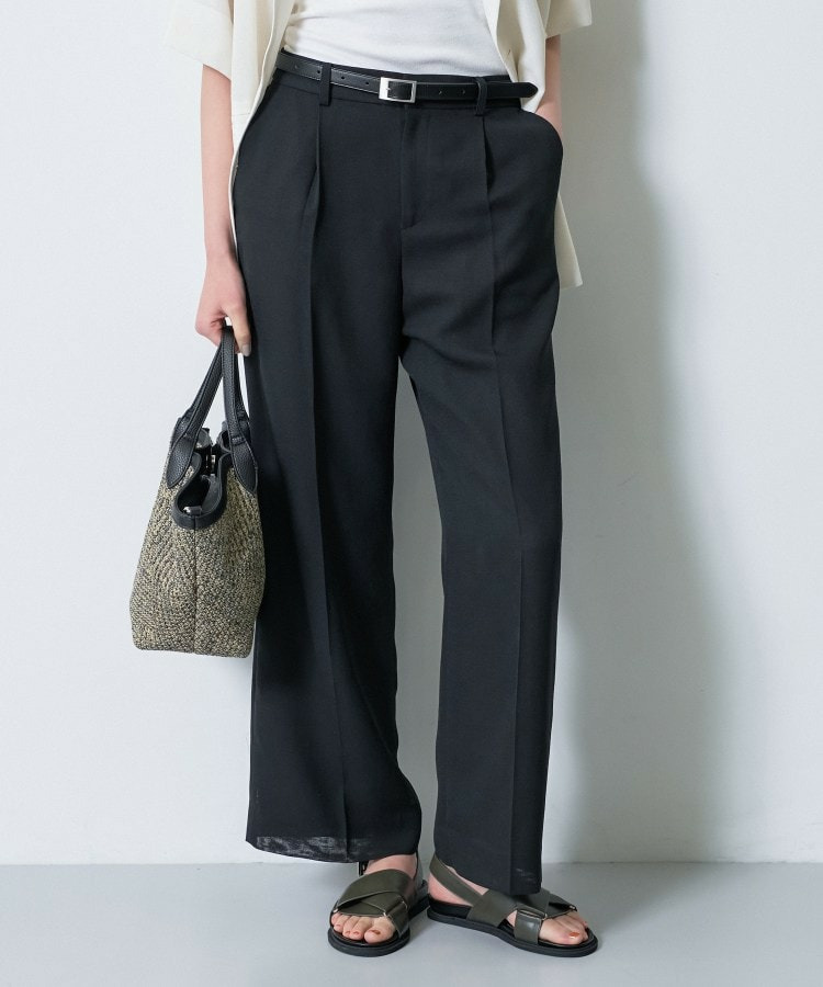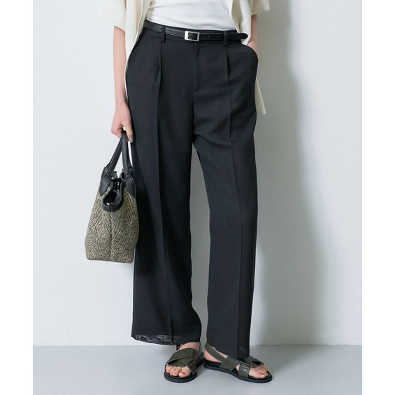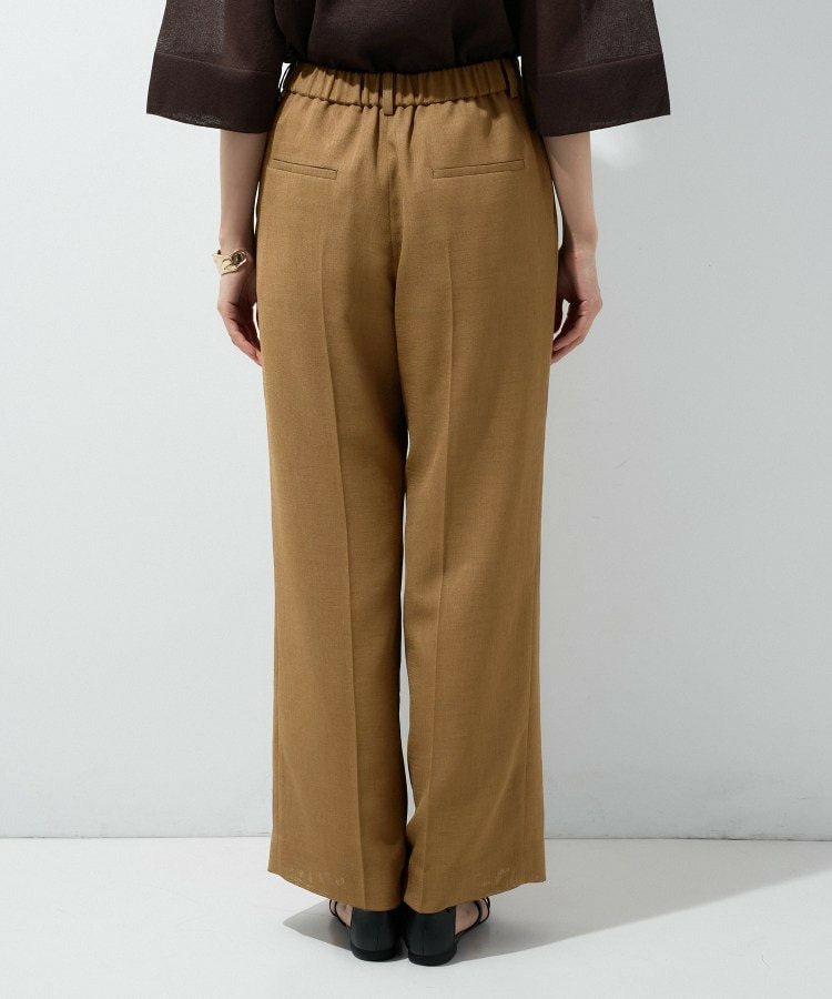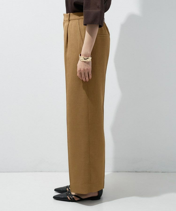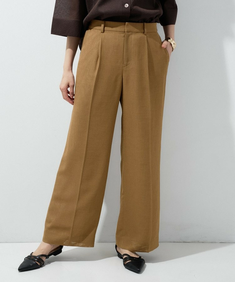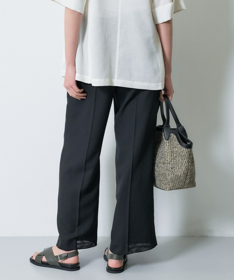 きちんと感を演出するセンタープレスと、適度なハリ感が脚のラインを拾いすぎずに美しく見せます。