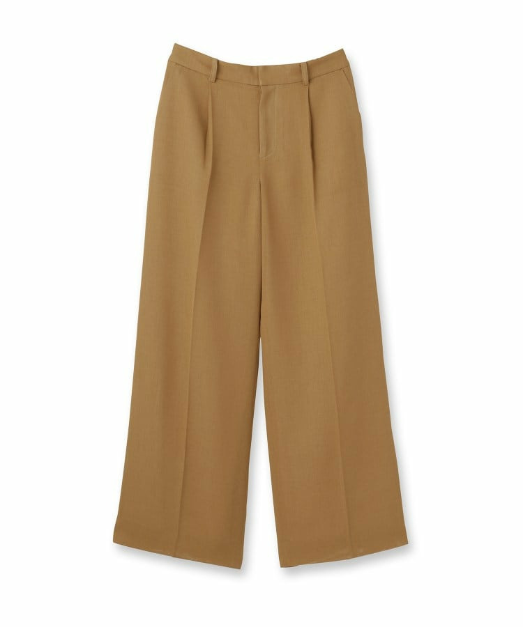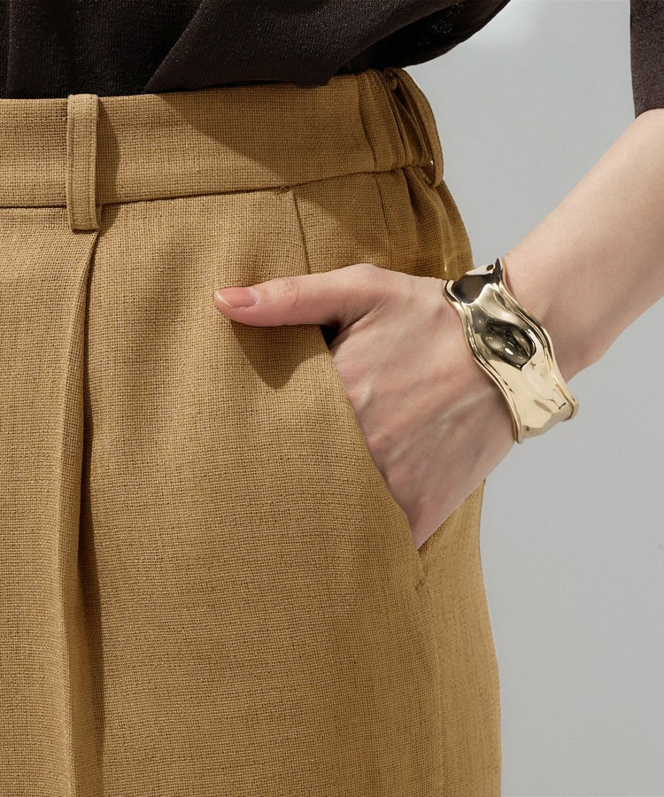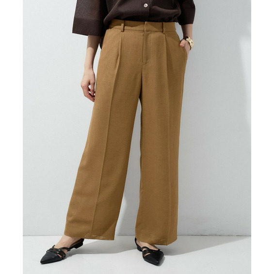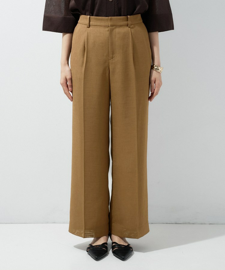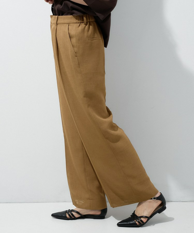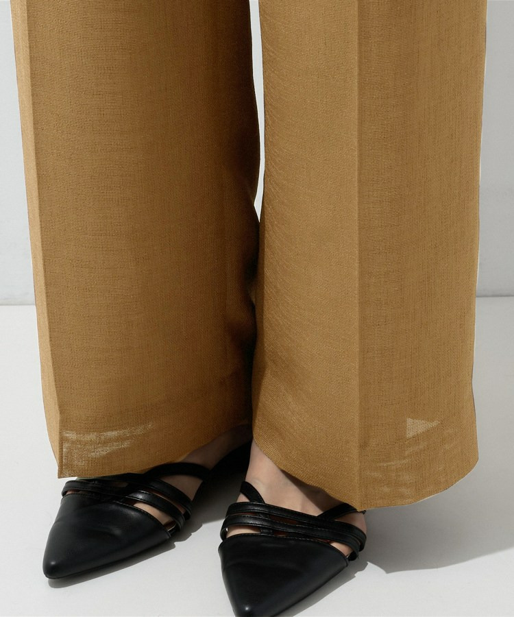 きちんと感を演出するセンタープレスと、適度なハリ感が脚のラインを拾いすぎずに美しく見せます。