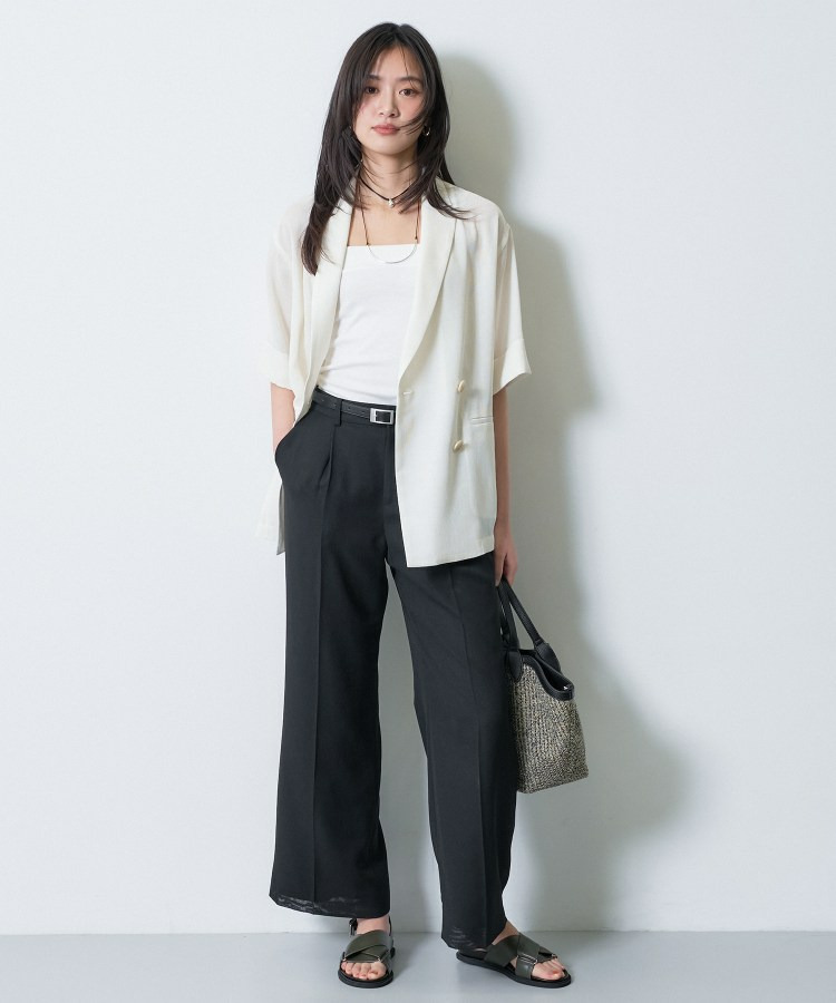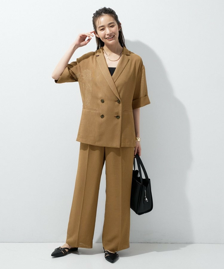 同素材のジャケットとのセットアップで、トレンド感のあるモダンなサマースーツスタイルが完成します。