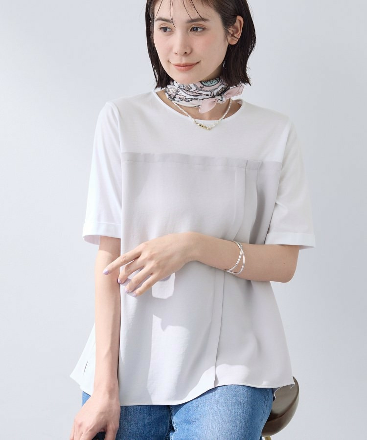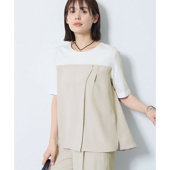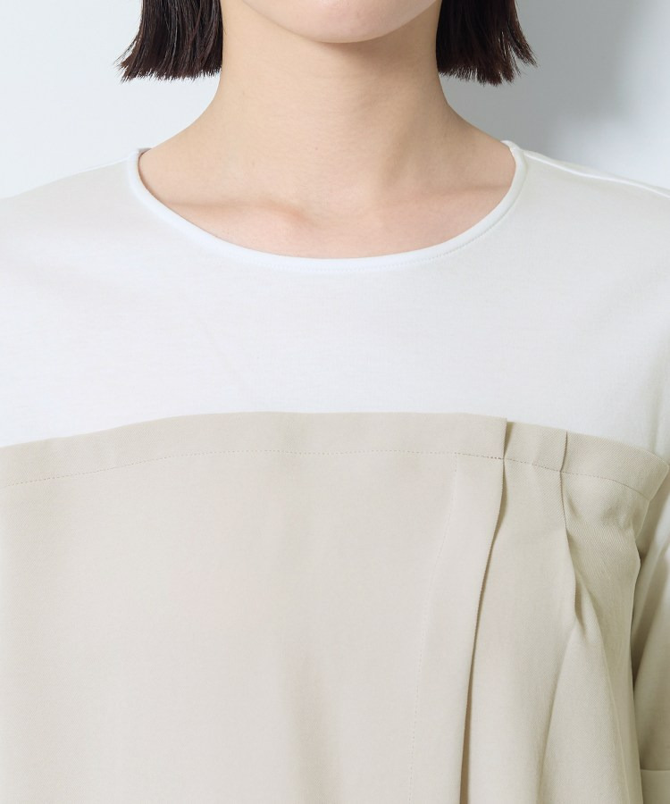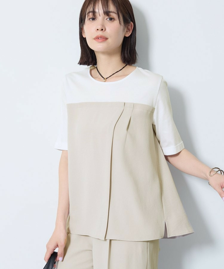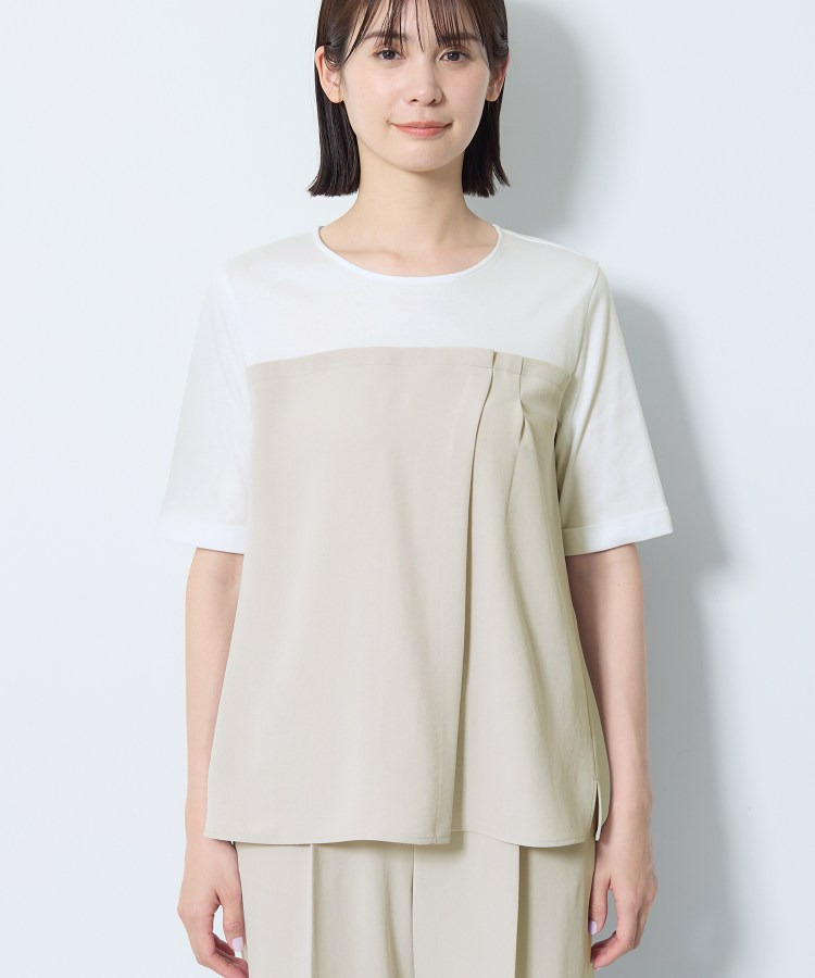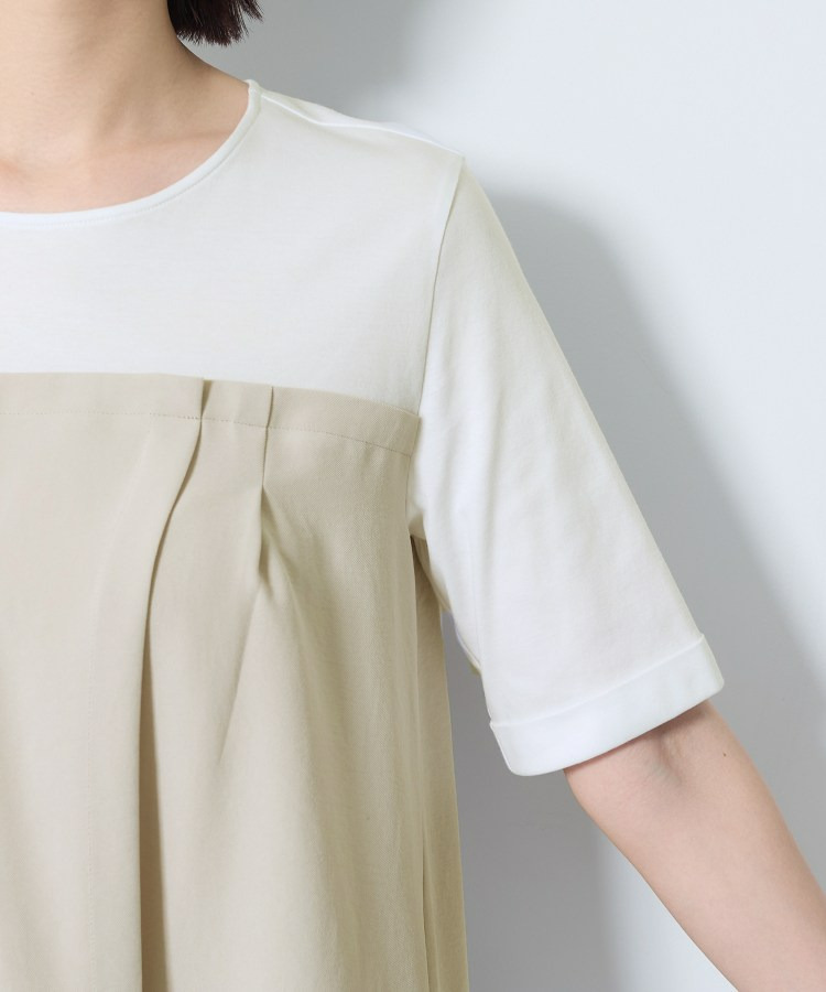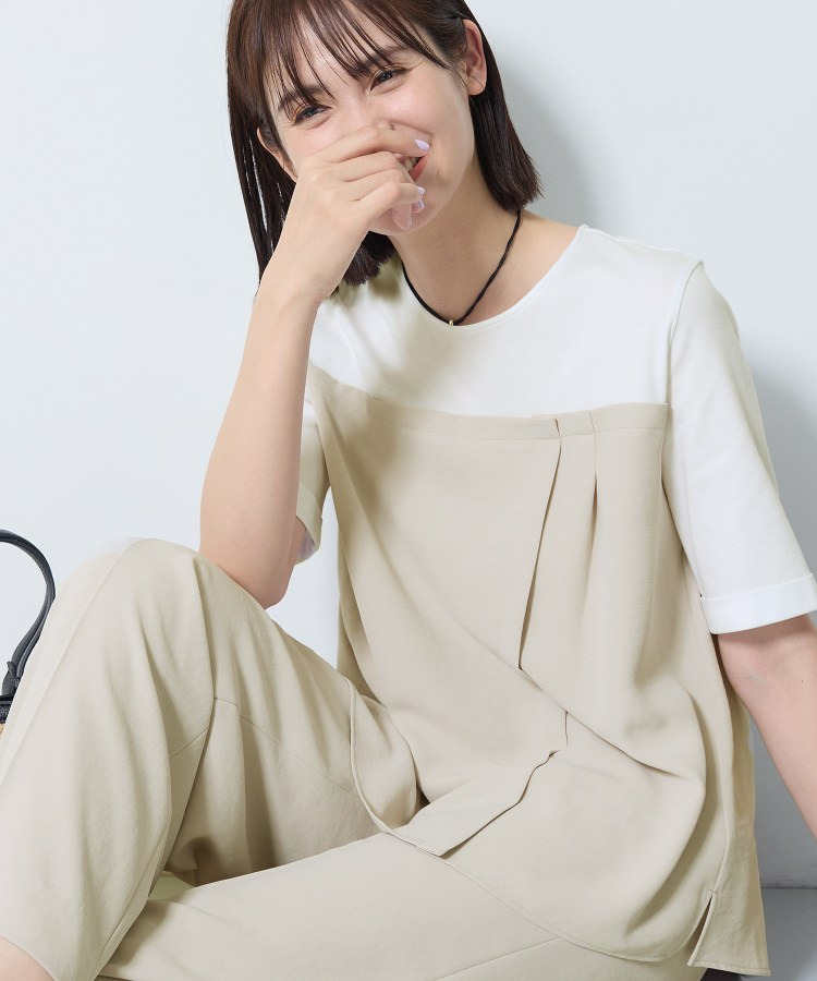 一枚で完結する時短映えデザインはそのままに、肌離れのよい軽やかなドッキング素材と重ねタックデザインがポイントのトップスです。