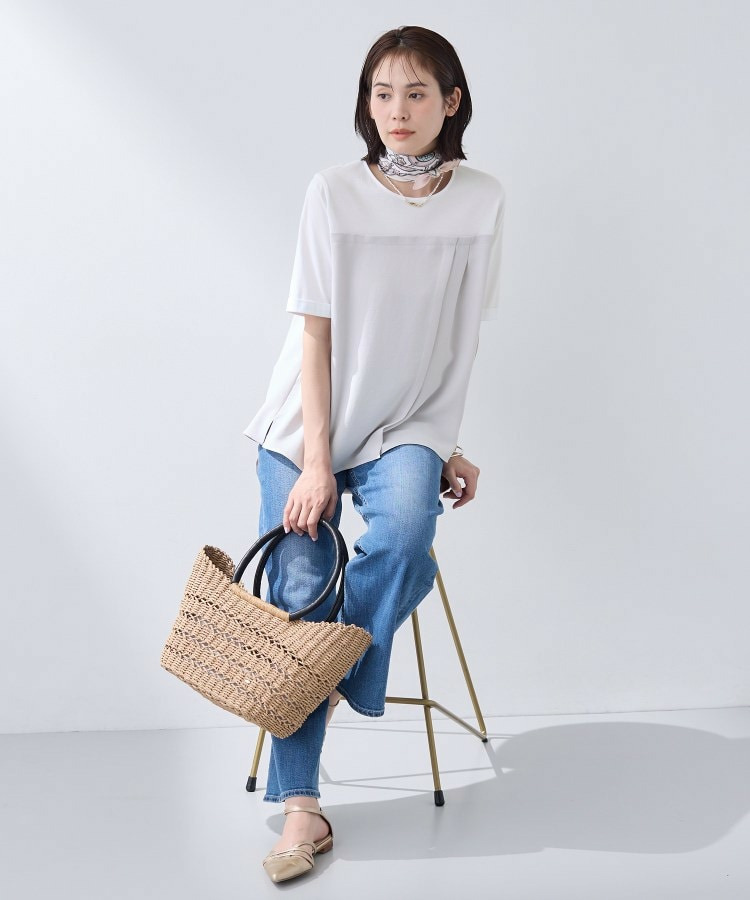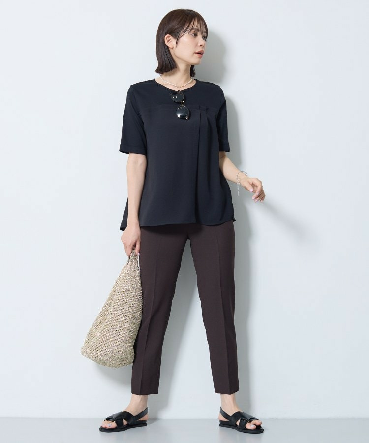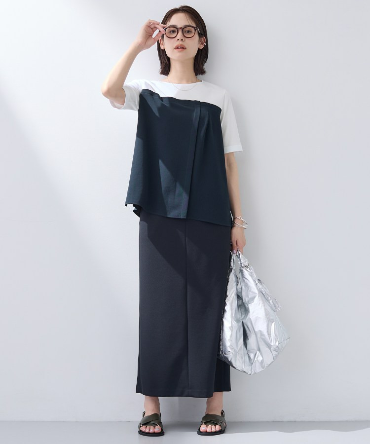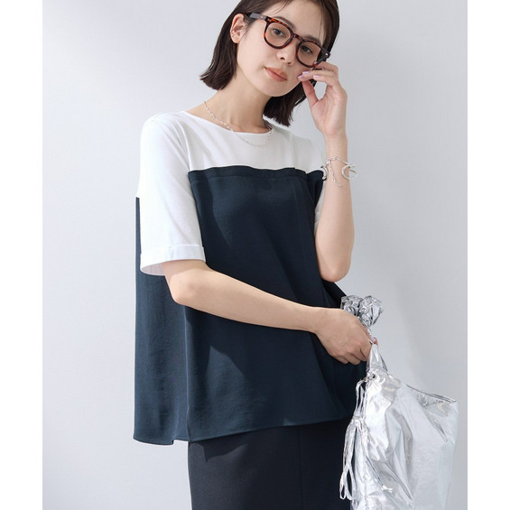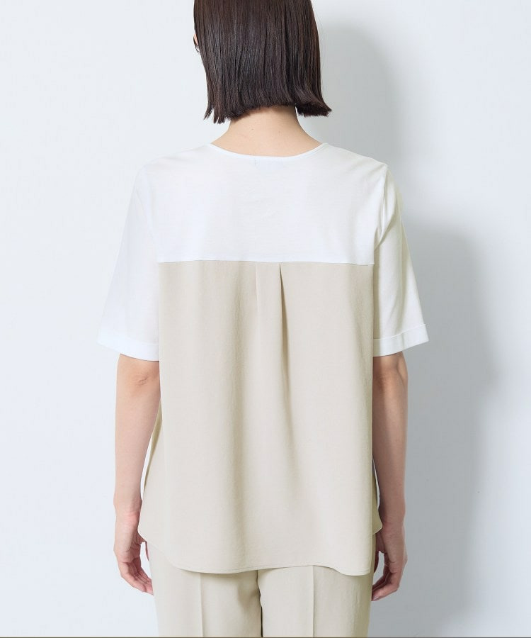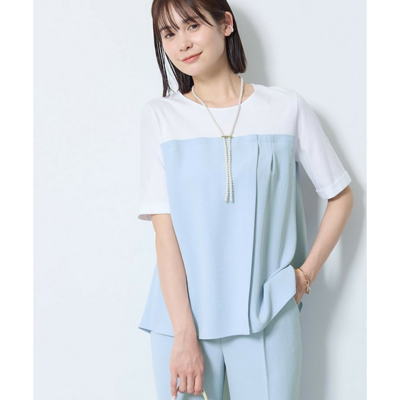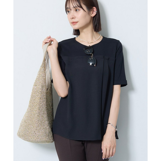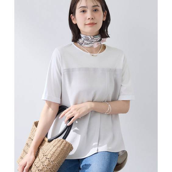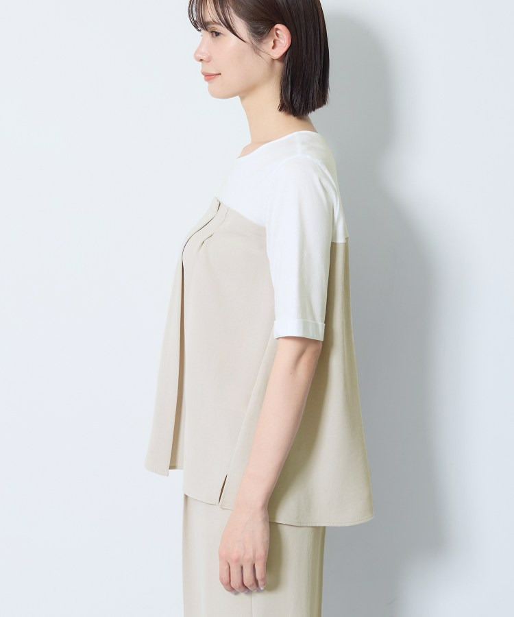 一枚で完結する時短映えデザインはそのままに、肌離れのよい軽やかなドッキング素材と重ねタックデザインがポイントのトップスです。