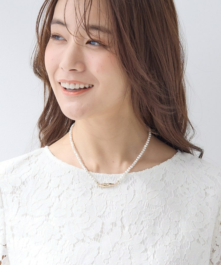 不揃いな小粒フェイクパールとメタルトップの組み合わせがこなれ感たっぷりなショートネックレスです。
