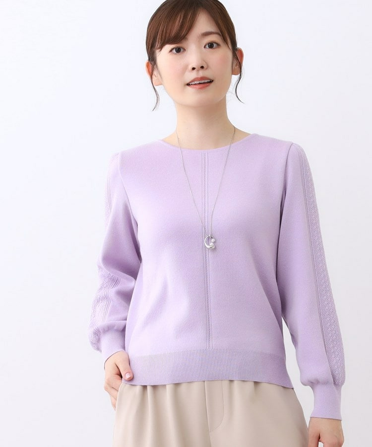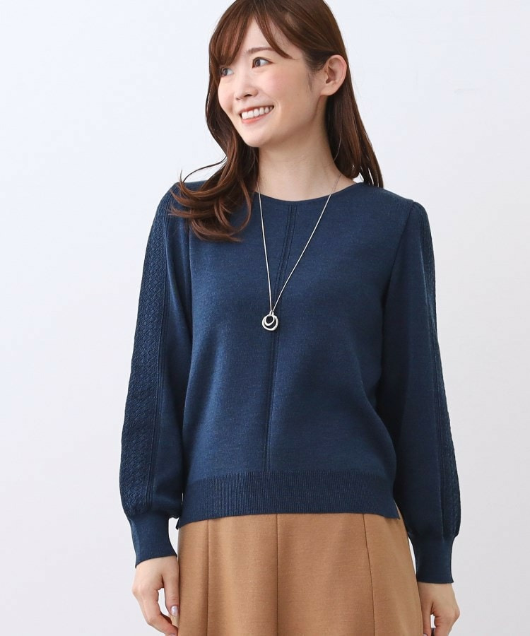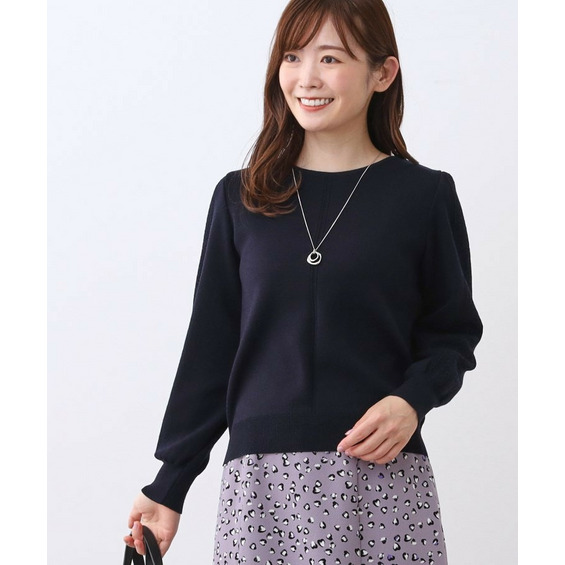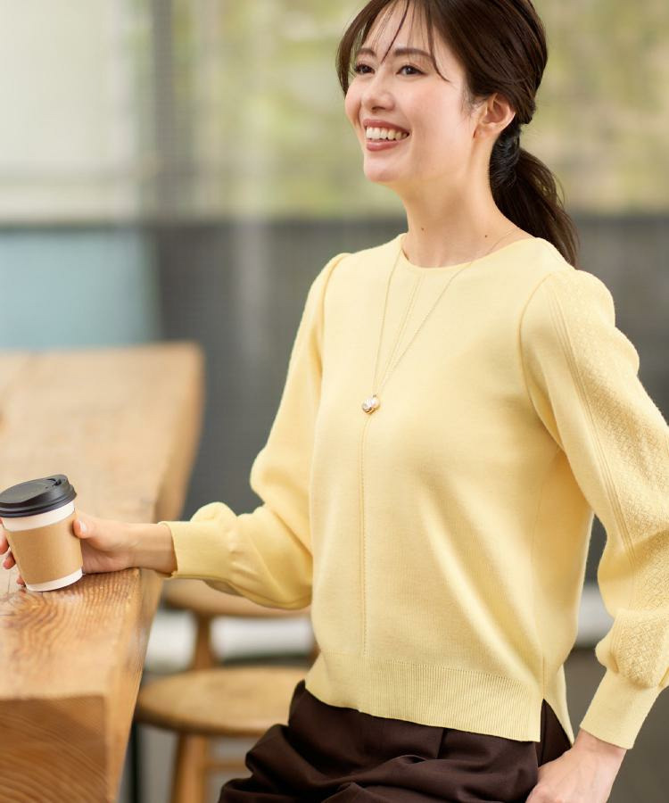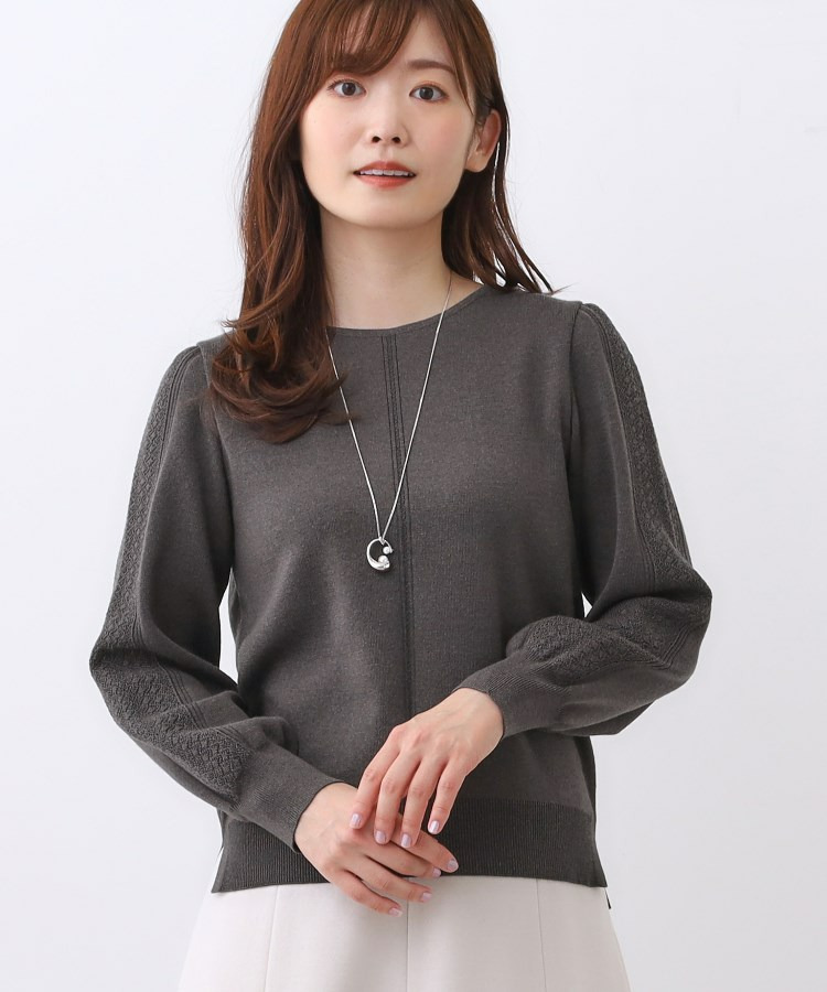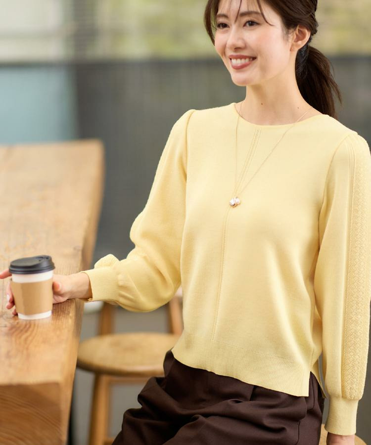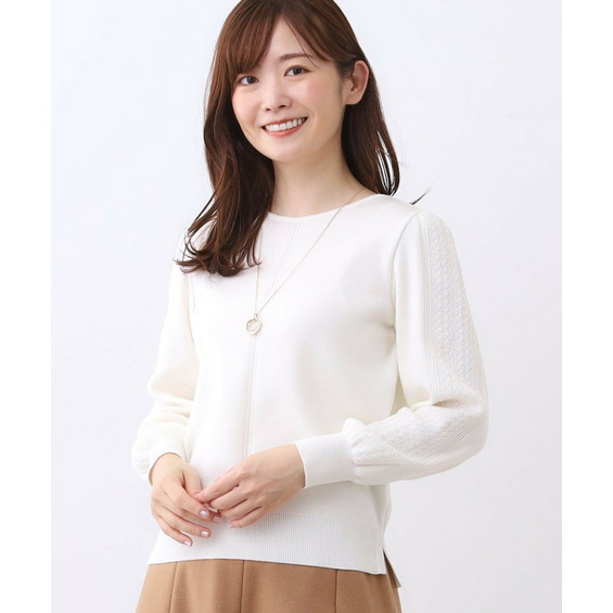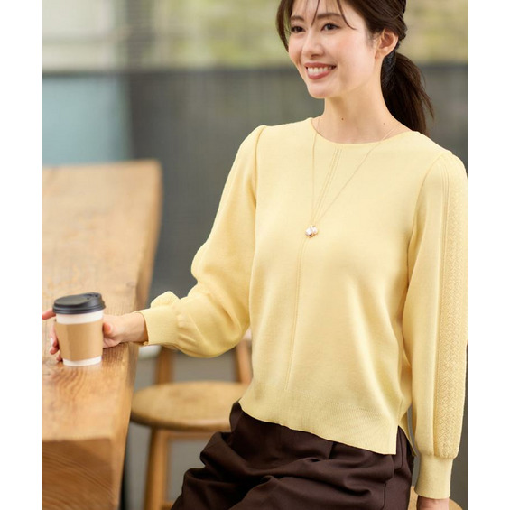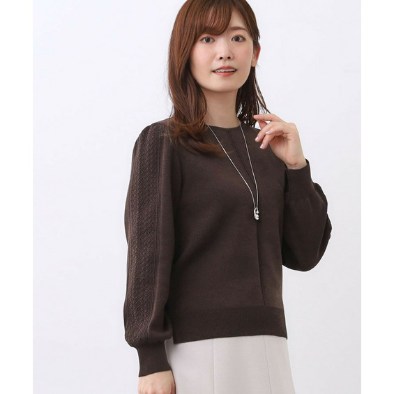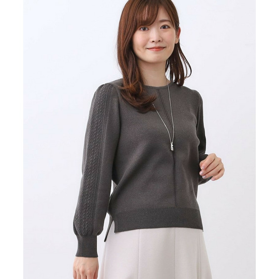 袖の上品な写し柄とラインがポイントでスカートにもパンツにもスタイリングしやすいニットになっています。