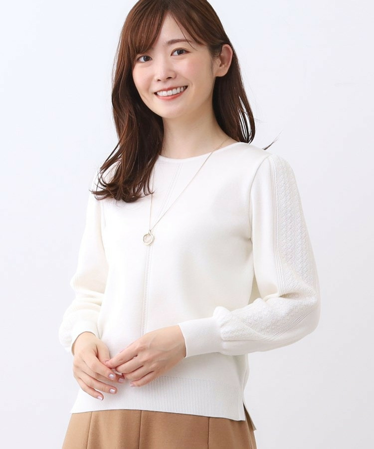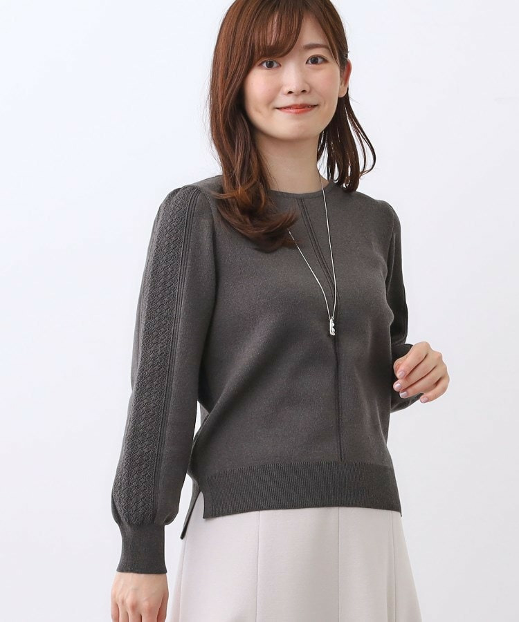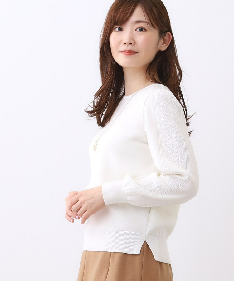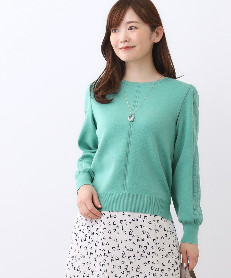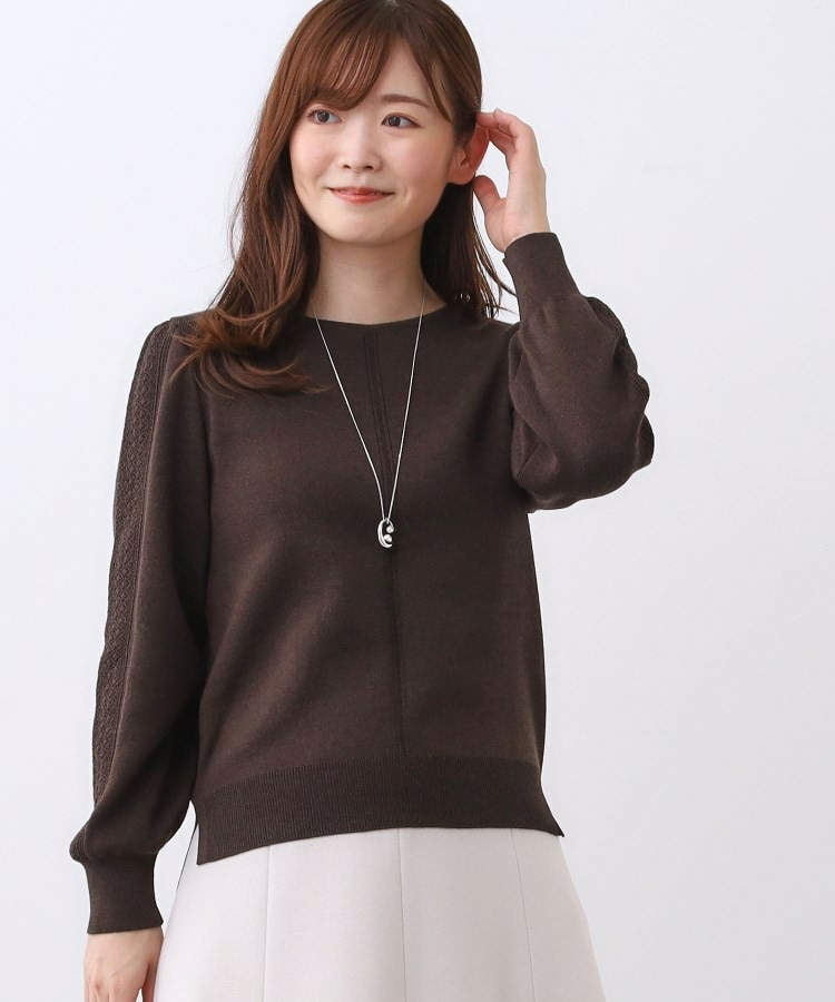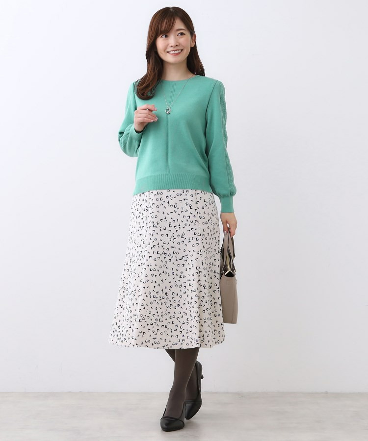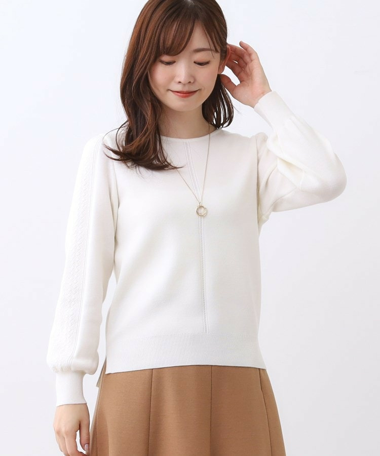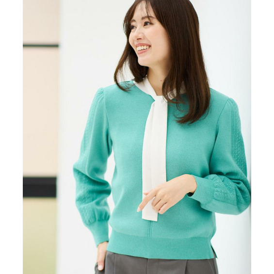 袖の上品な写し柄とラインがポイントでスカートにもパンツにもスタイリングしやすいニットになっています。