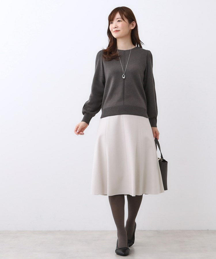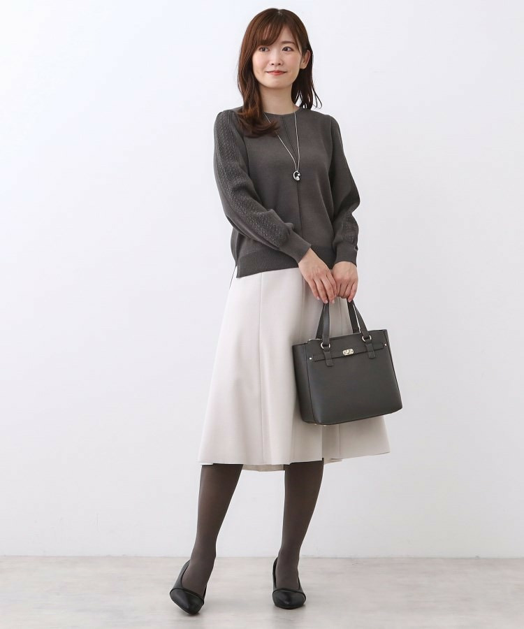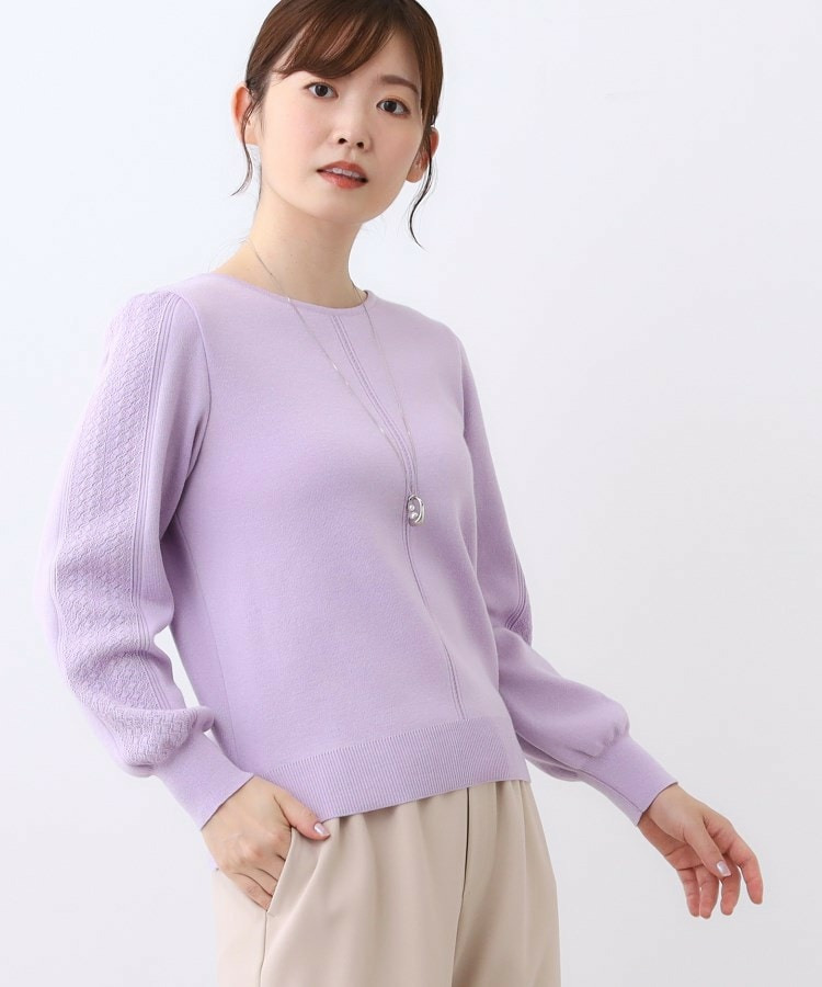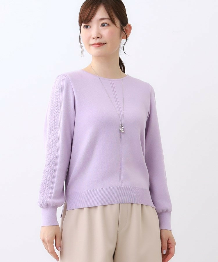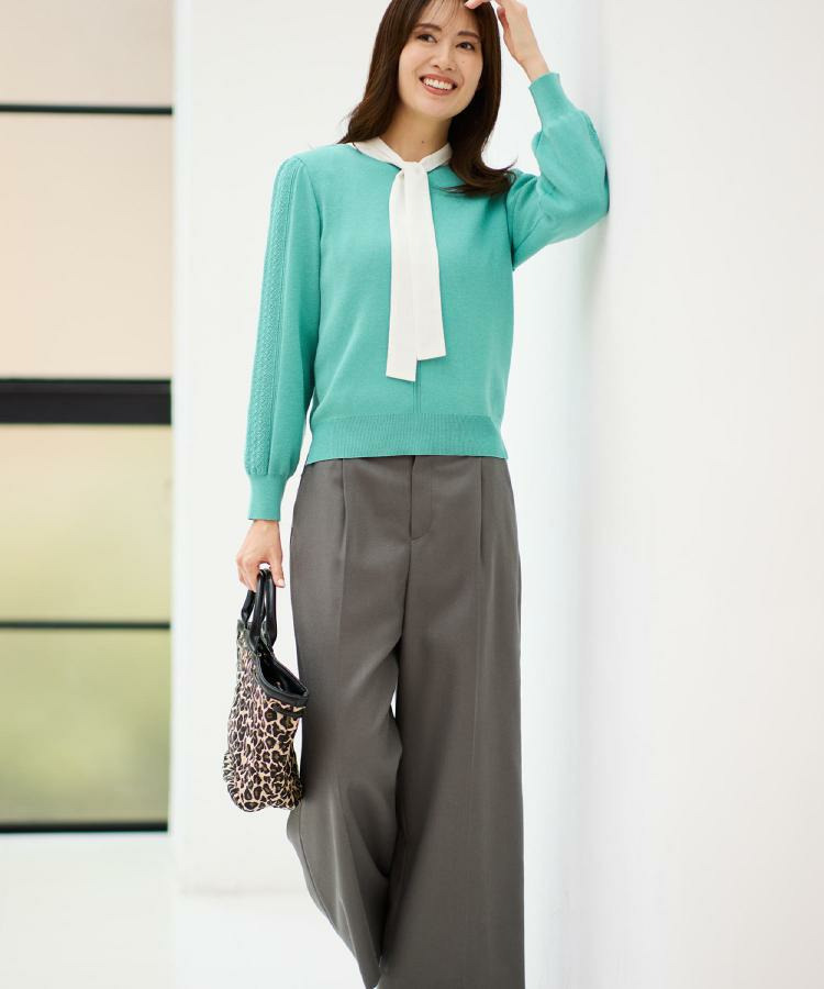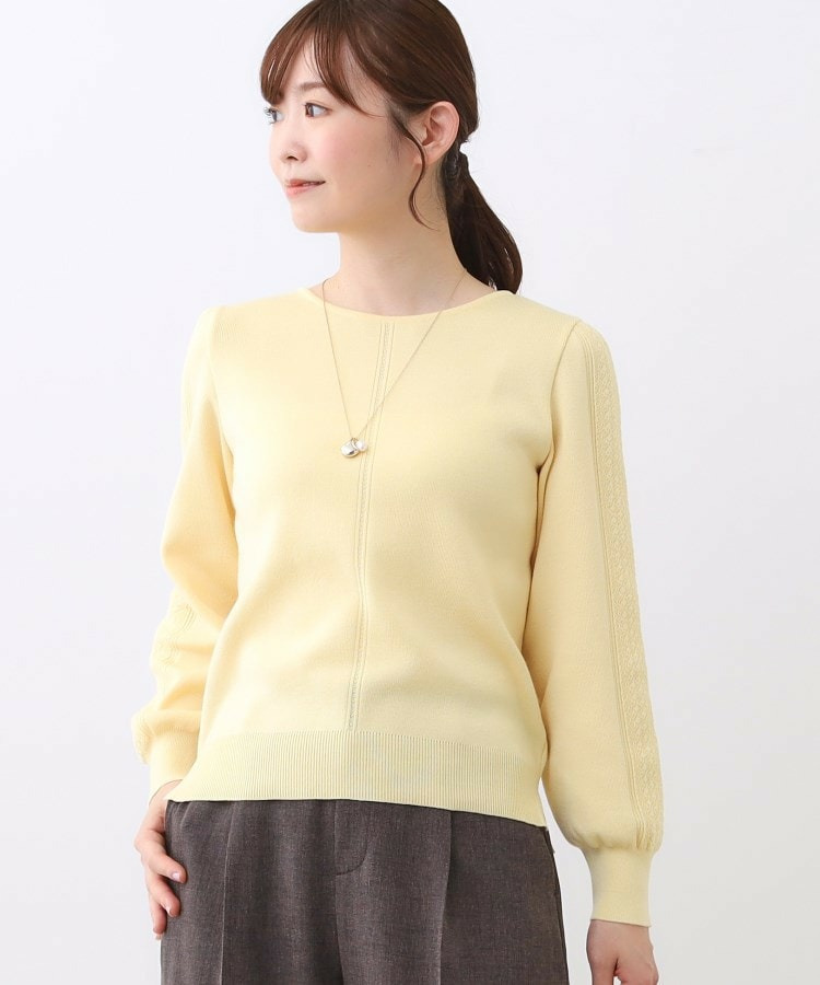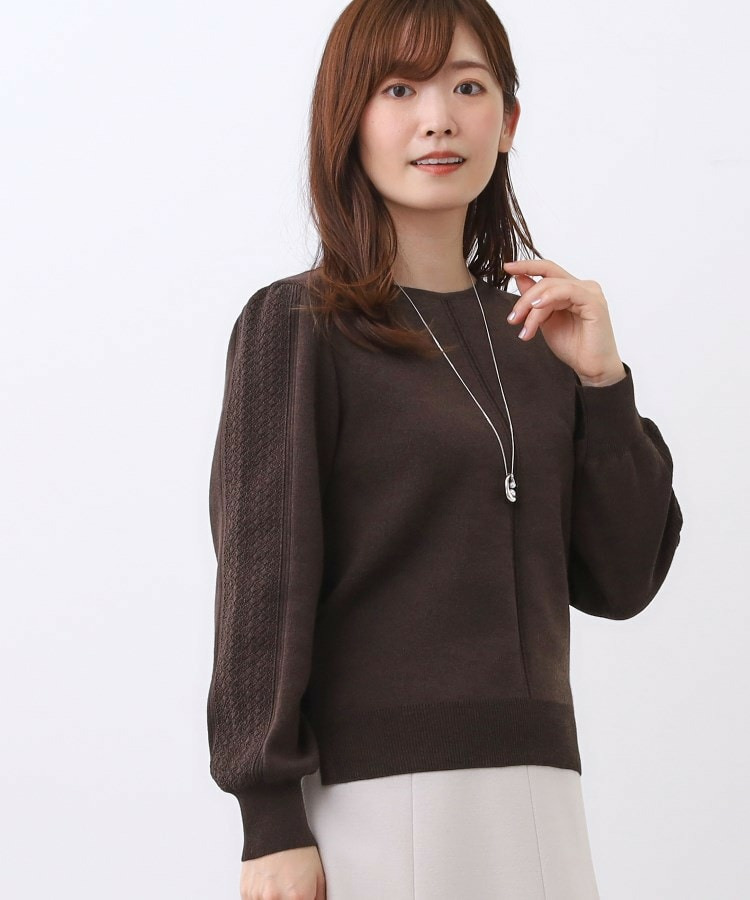 袖の上品な写し柄とラインがポイントでスカートにもパンツにもスタイリングしやすいニットになっています。