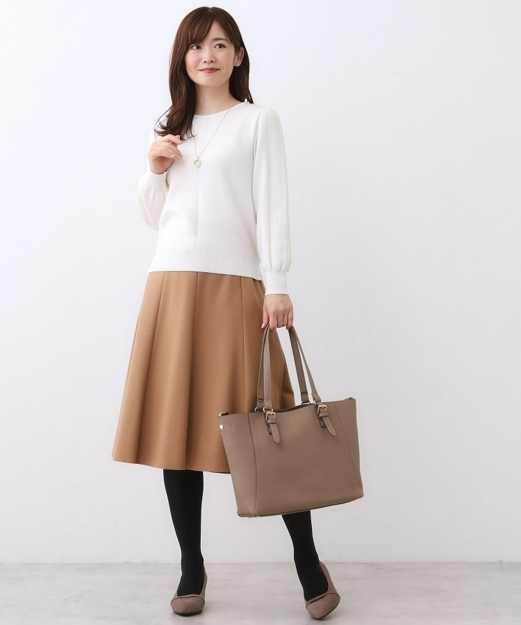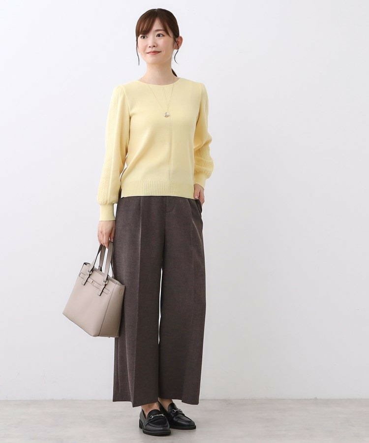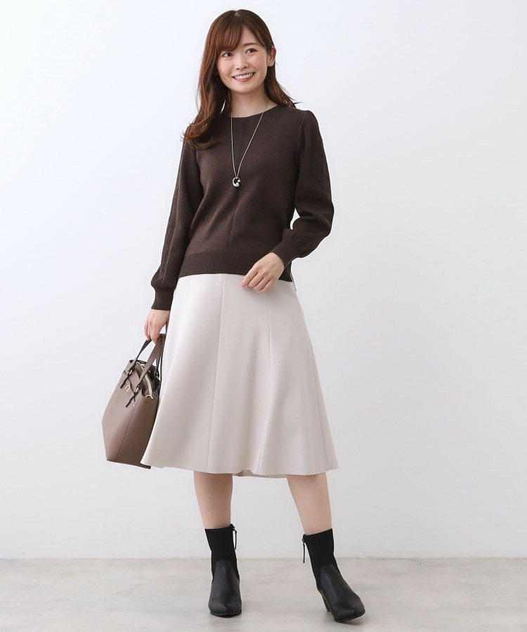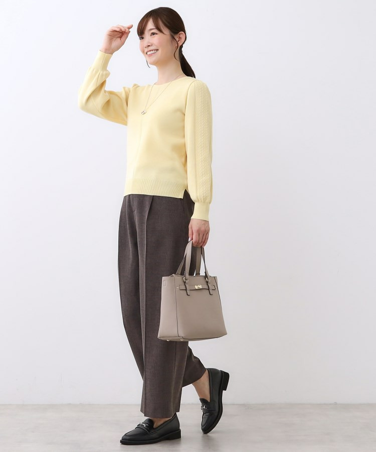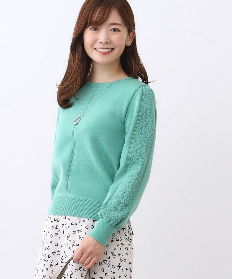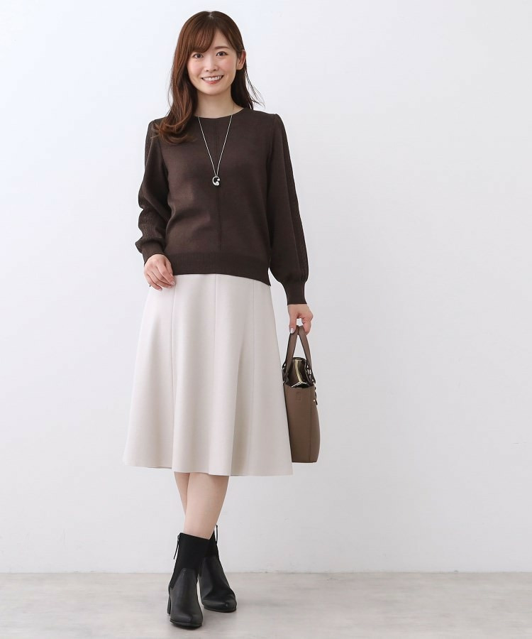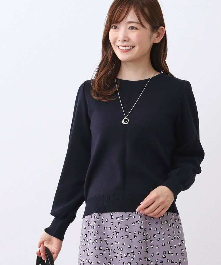 袖の上品な写し柄とラインがポイントでスカートにもパンツにもスタイリングしやすいニットになっています。