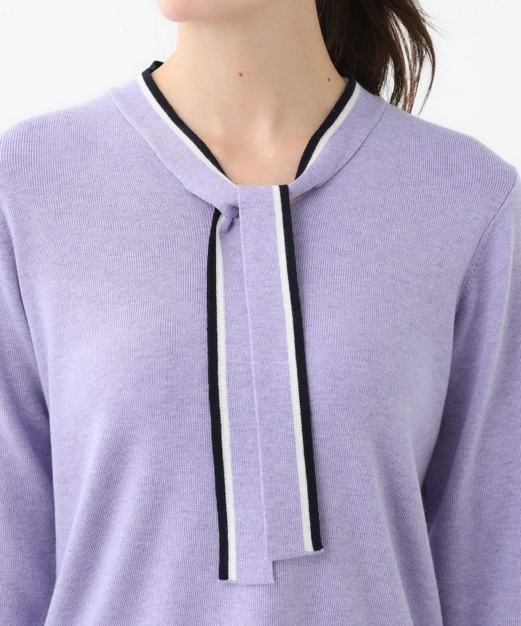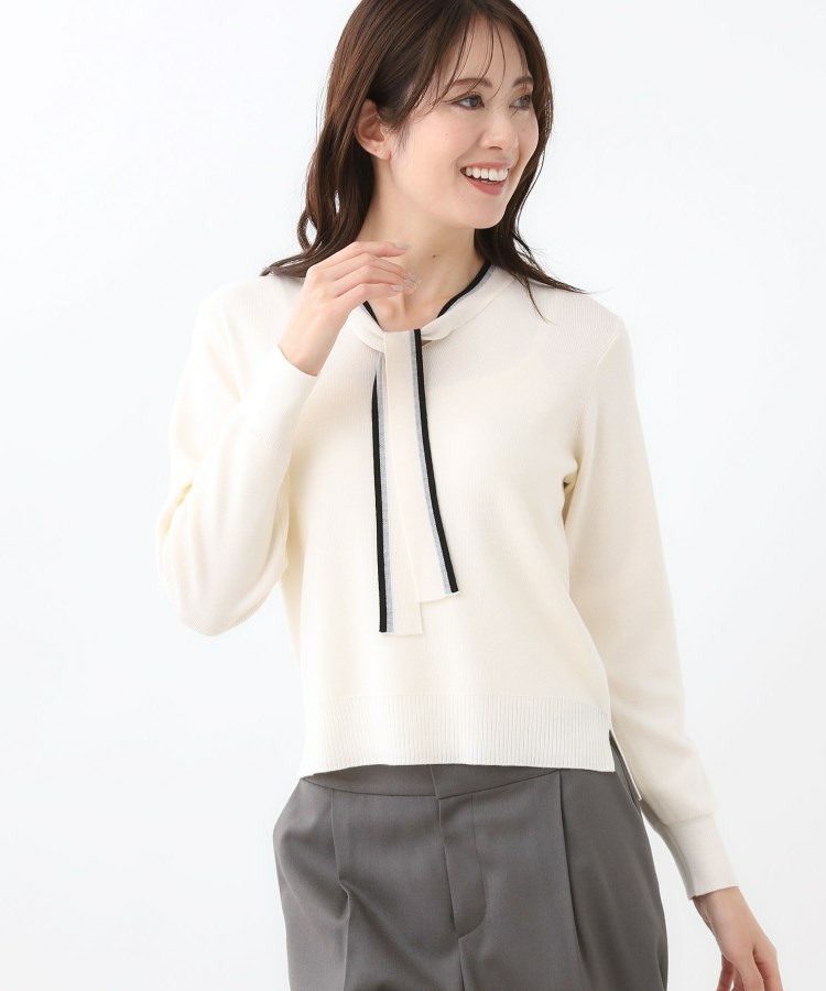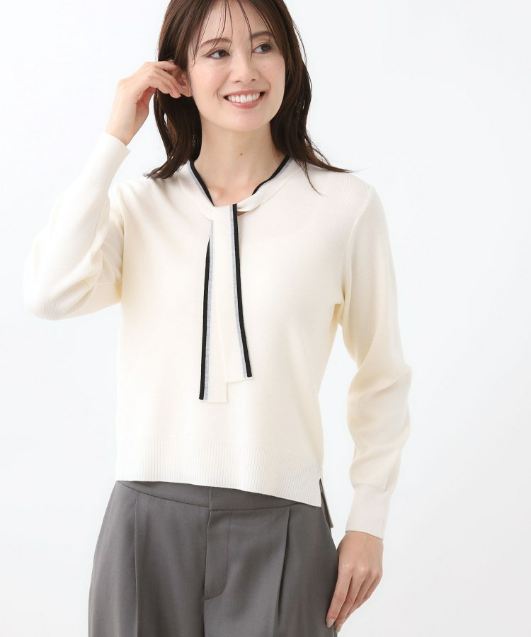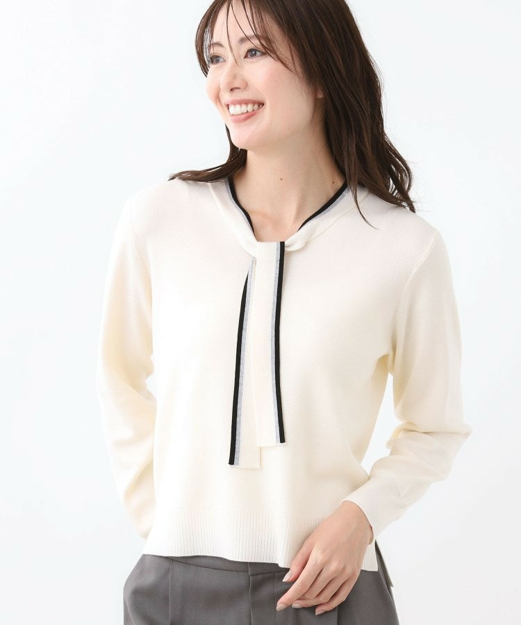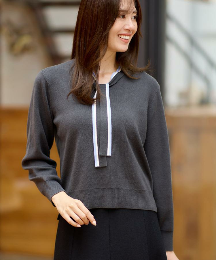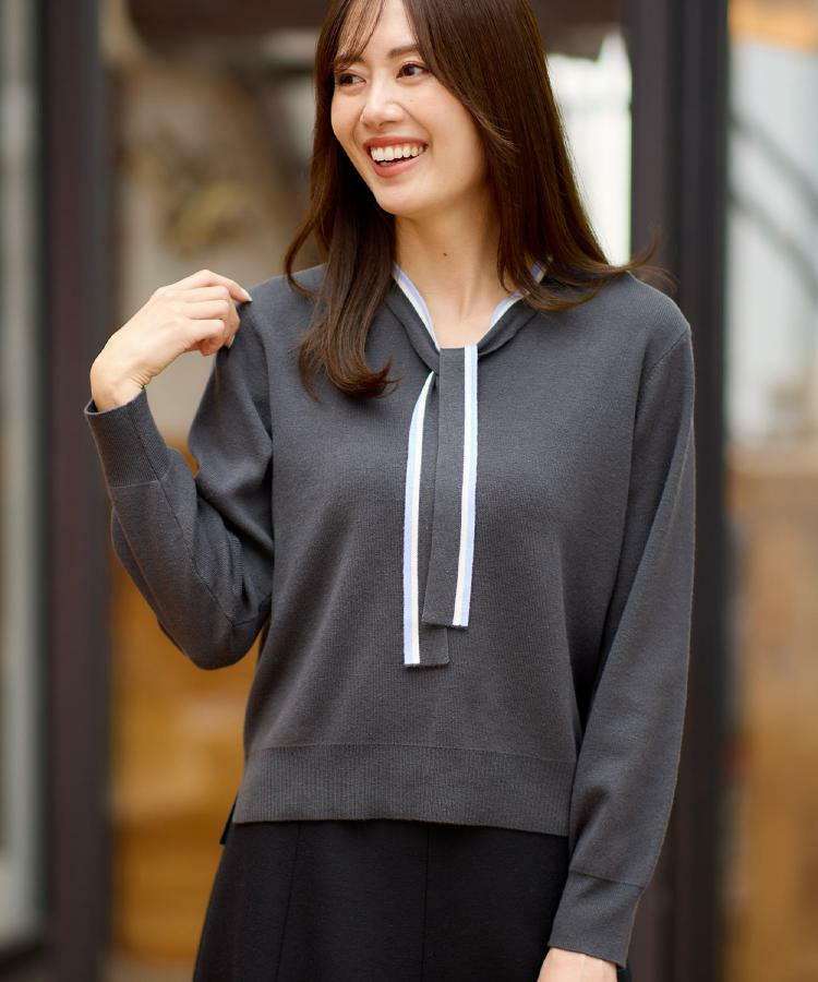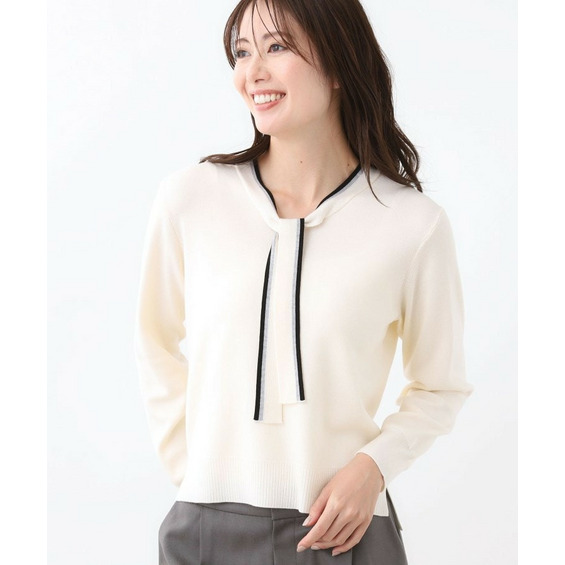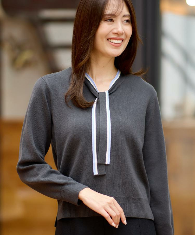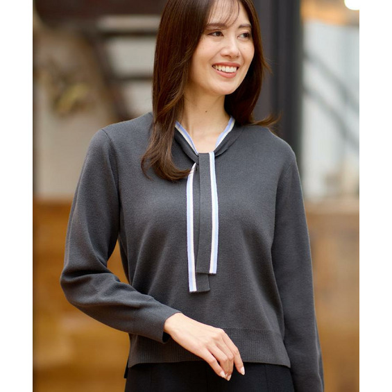 総針組織で身体のラインを拾いにくく、ボウタイ部分は柔らかさを残し、衿元に女性らしい華やかな印象をもたせたボウタイにしています。