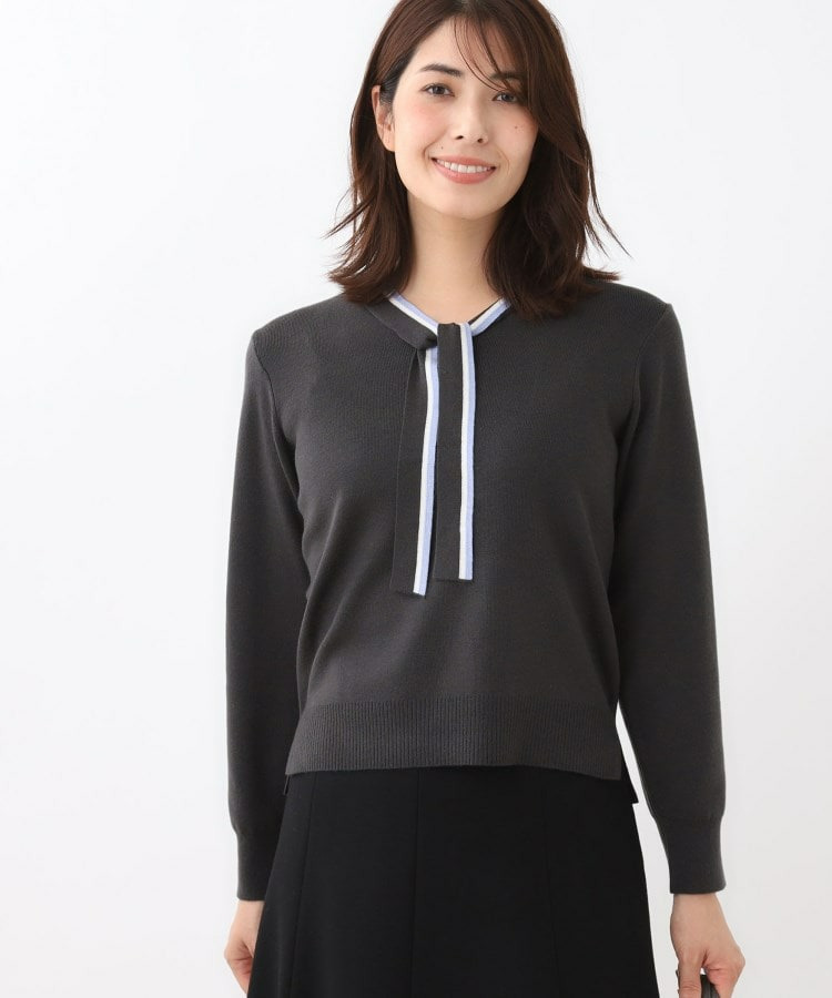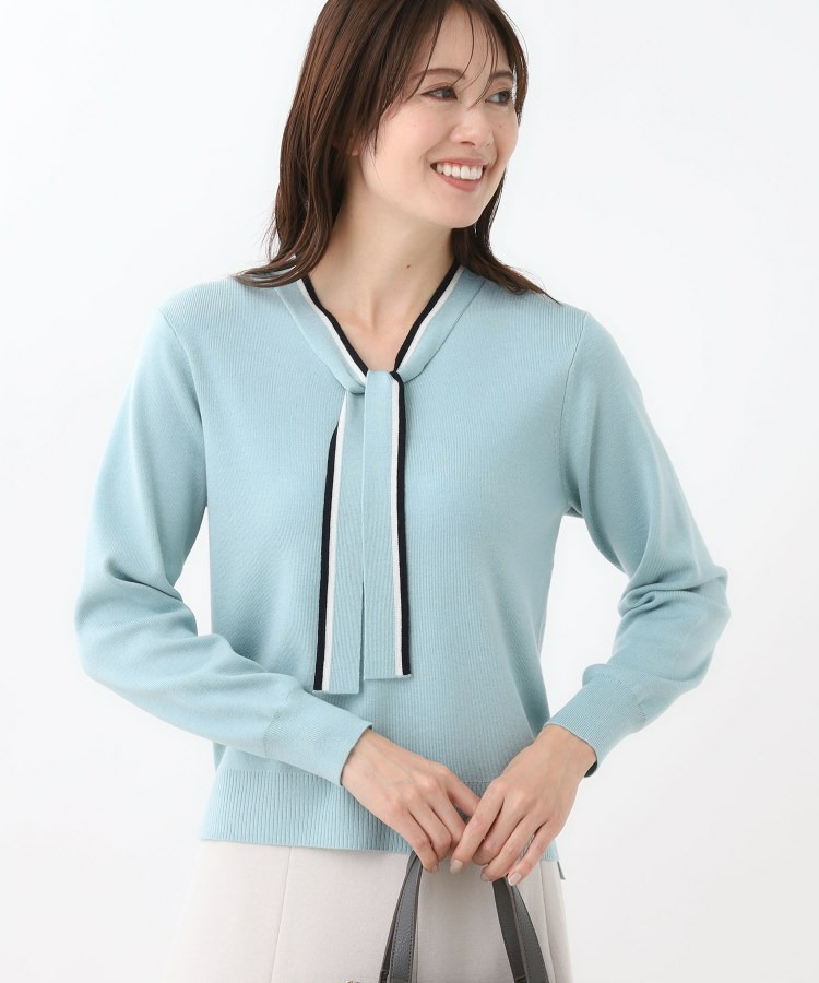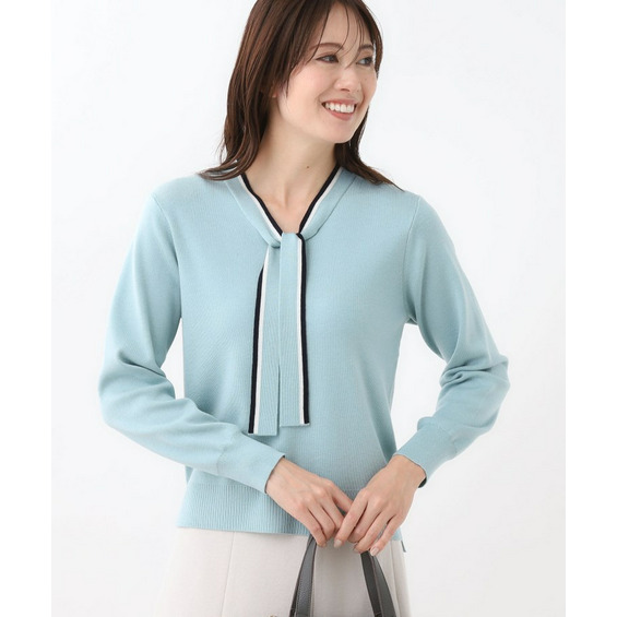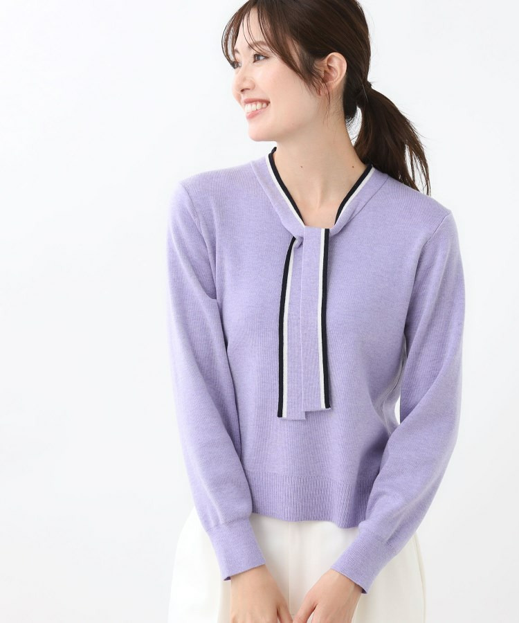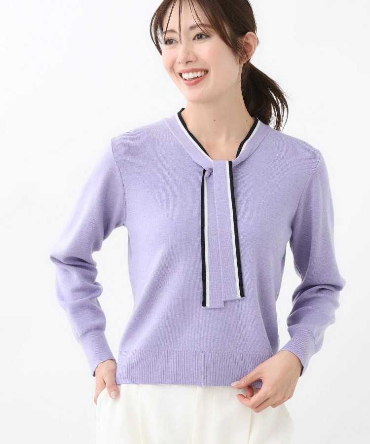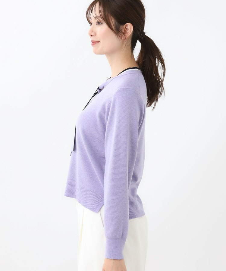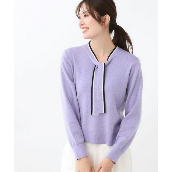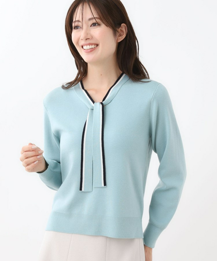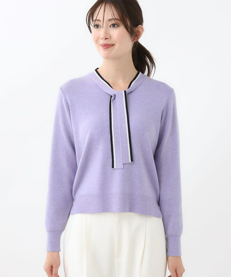 総針組織で身体のラインを拾いにくく、ボウタイ部分は柔らかさを残し、衿元に女性らしい華やかな印象をもたせたボウタイにしています。