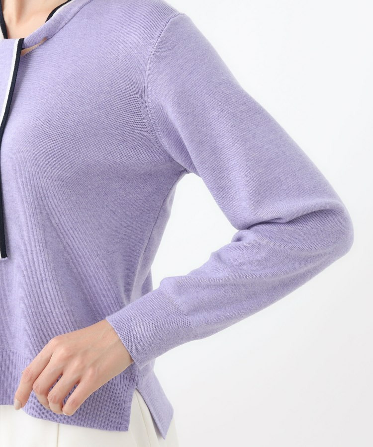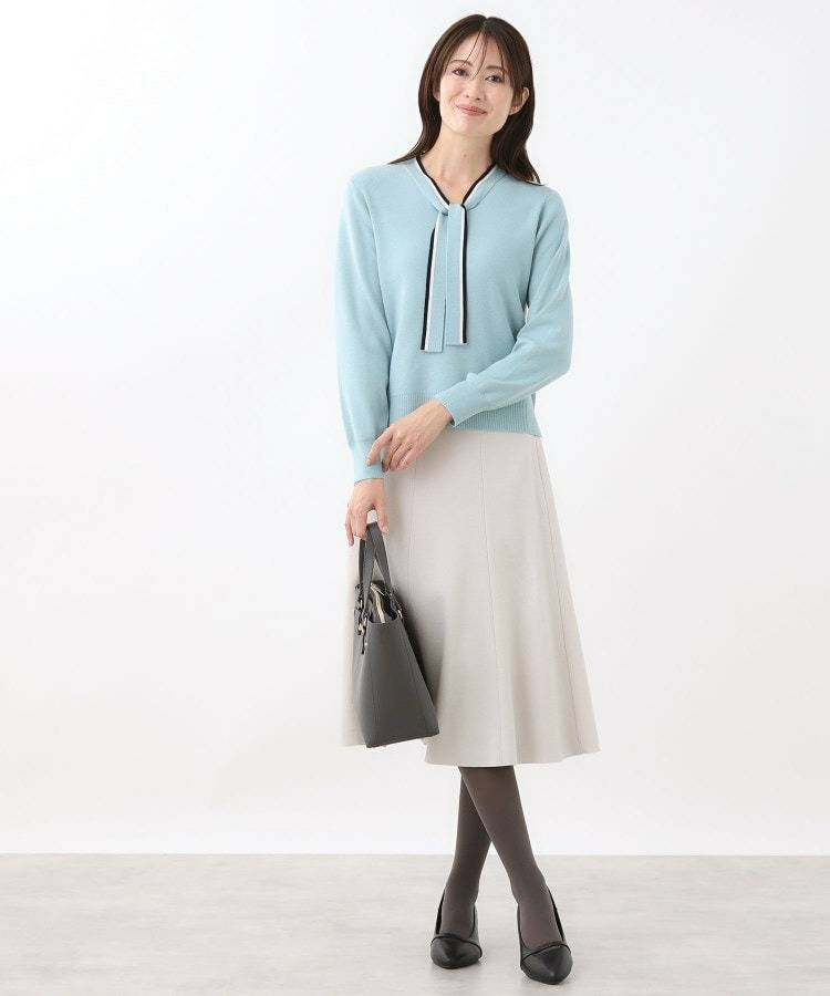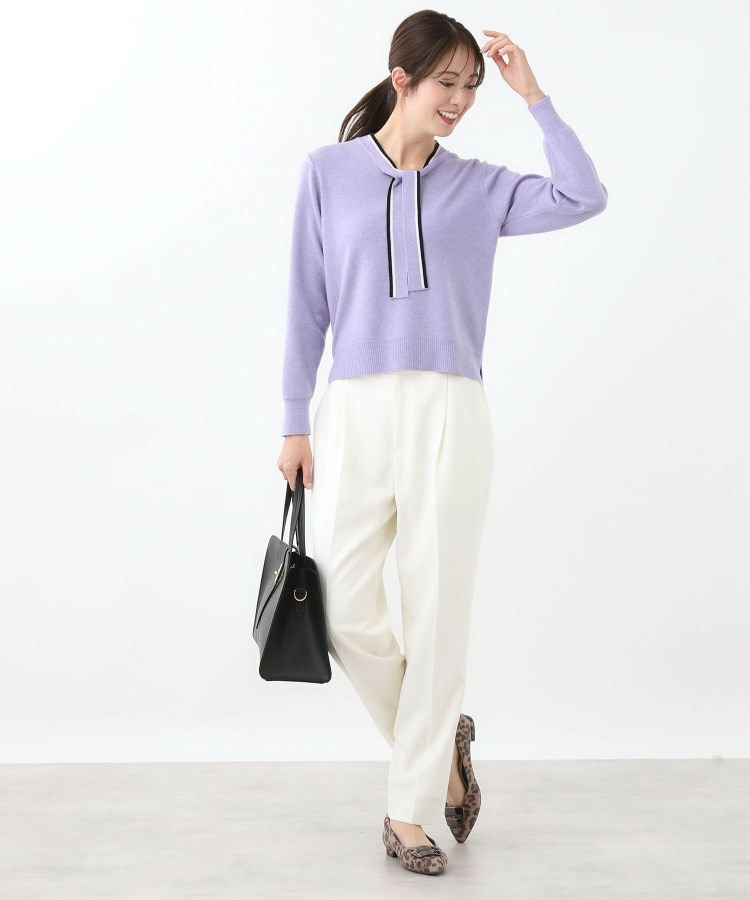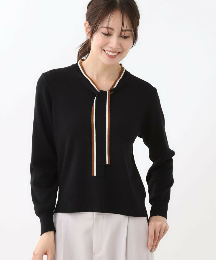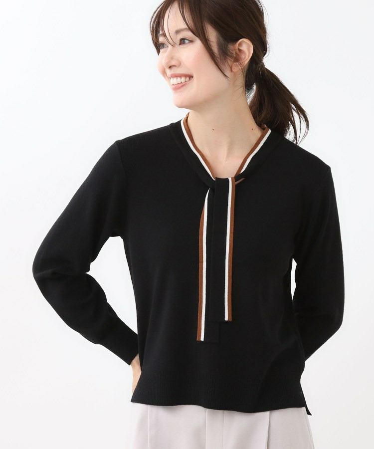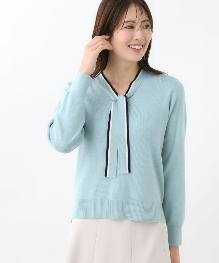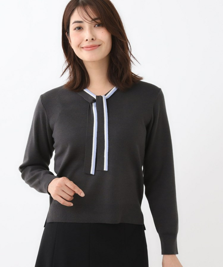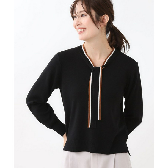総針組織で身体のラインを拾いにくく、ボウタイ部分は柔らかさを残し、衿元に女性らしい華やかな印象をもたせたボウタイにしています。