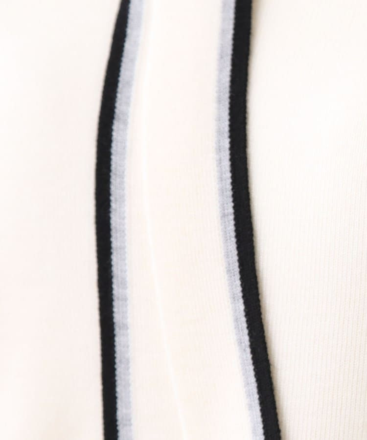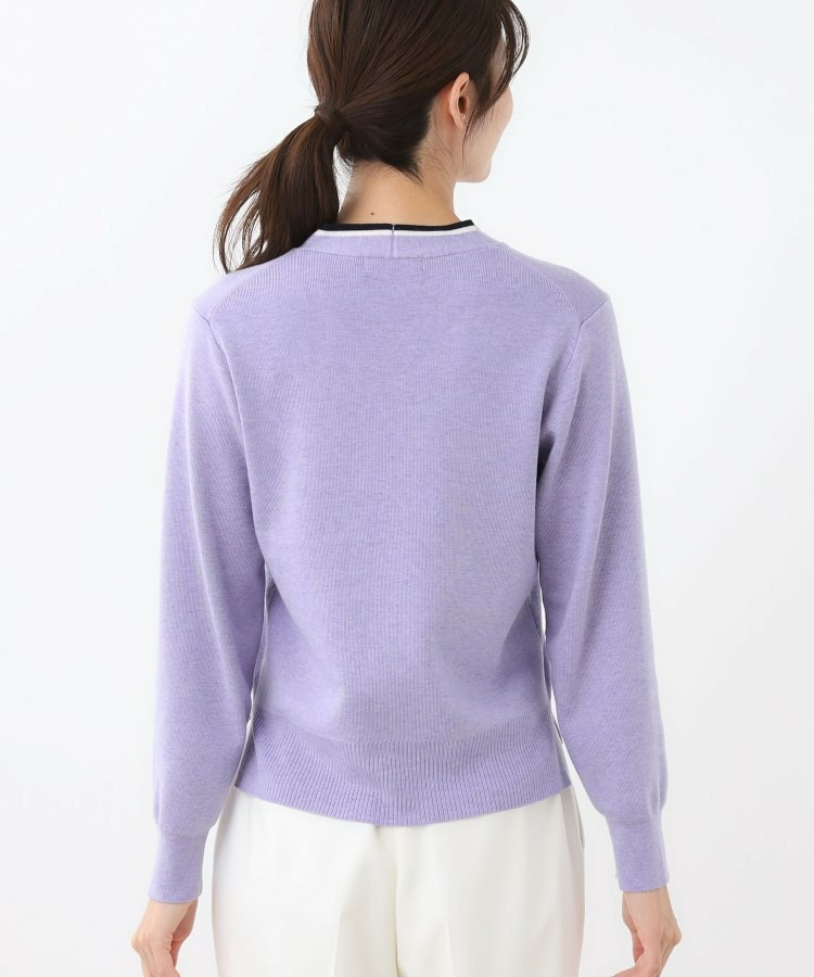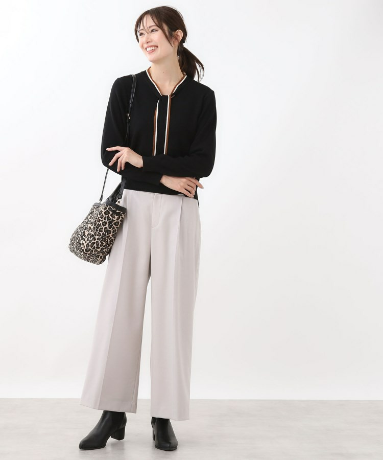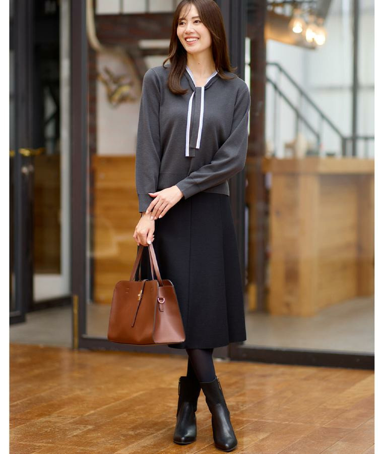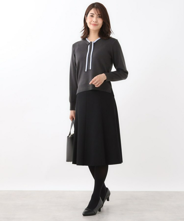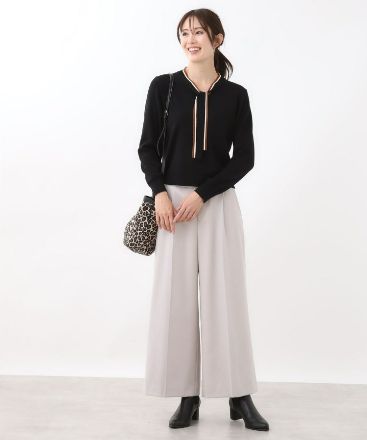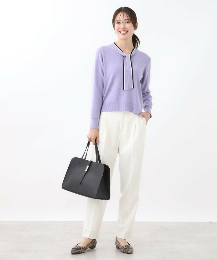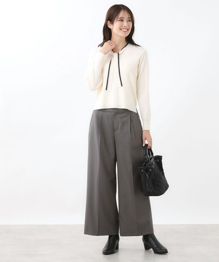 総針組織で身体のラインを拾いにくく、ボウタイ部分は柔らかさを残し、衿元に女性らしい華やかな印象をもたせたボウタイにしています。
