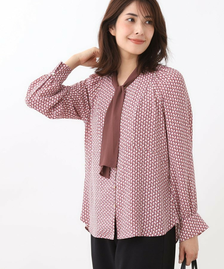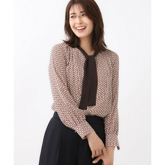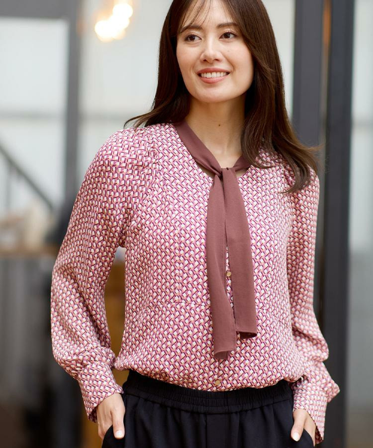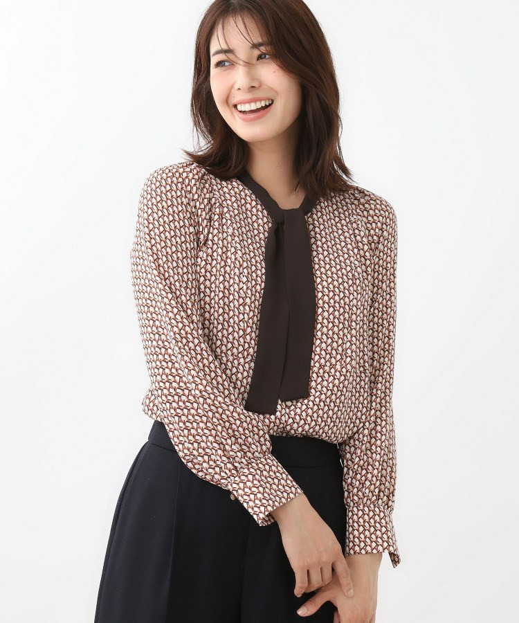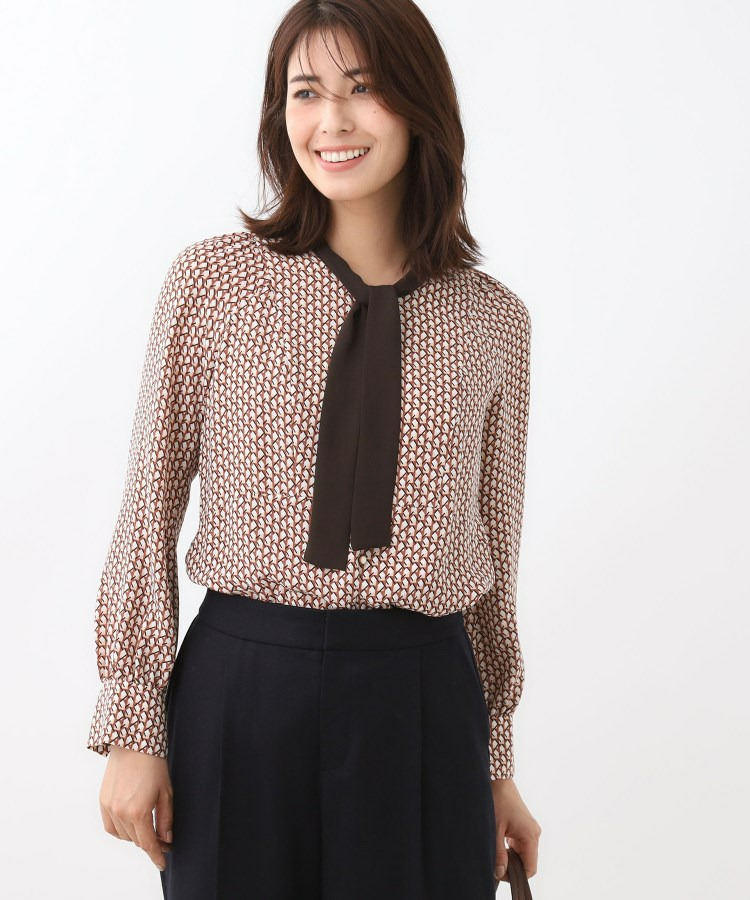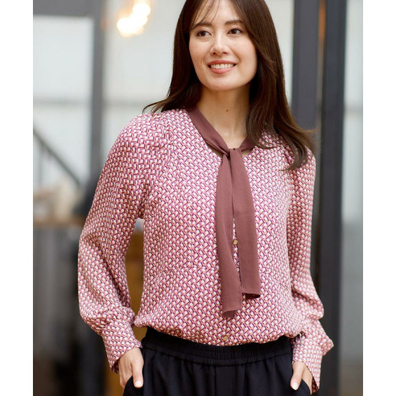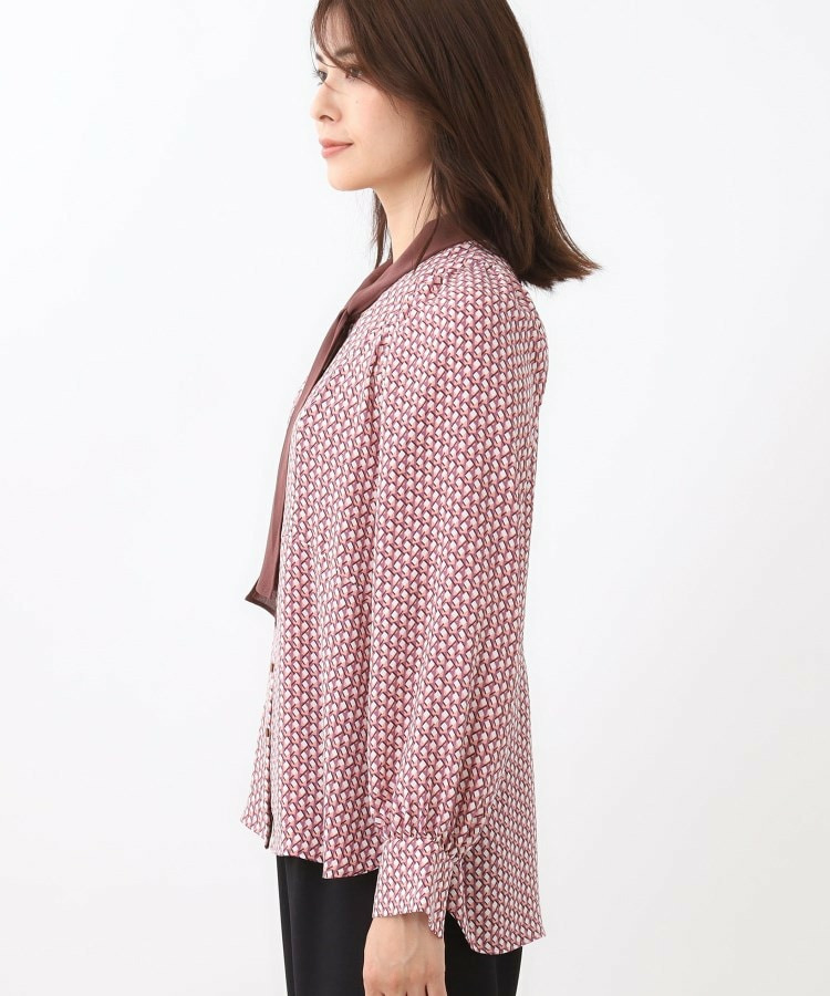 身頃はプリント柄、衿は無地生地を使用したボータイブラウス。