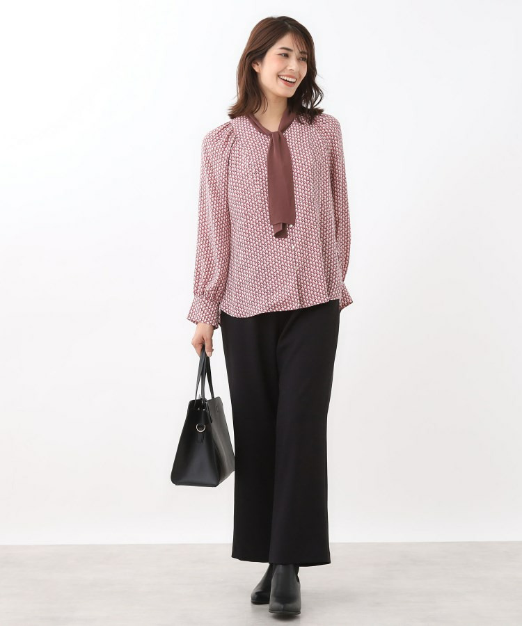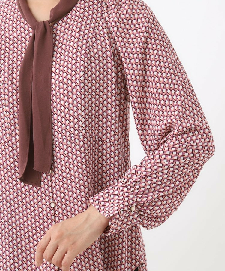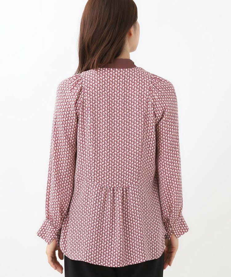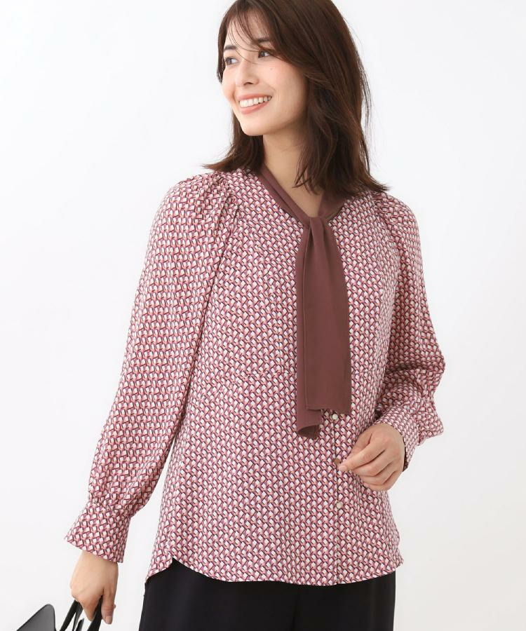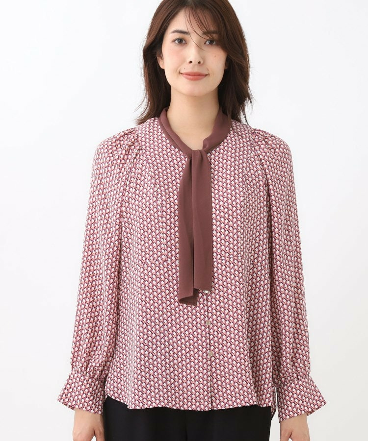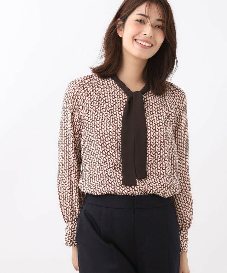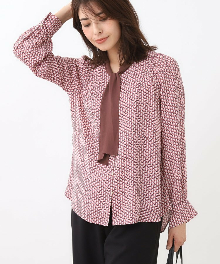 身頃はプリント柄、衿は無地生地を使用したボータイブラウス。