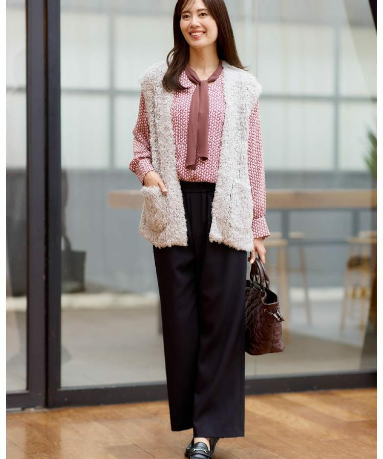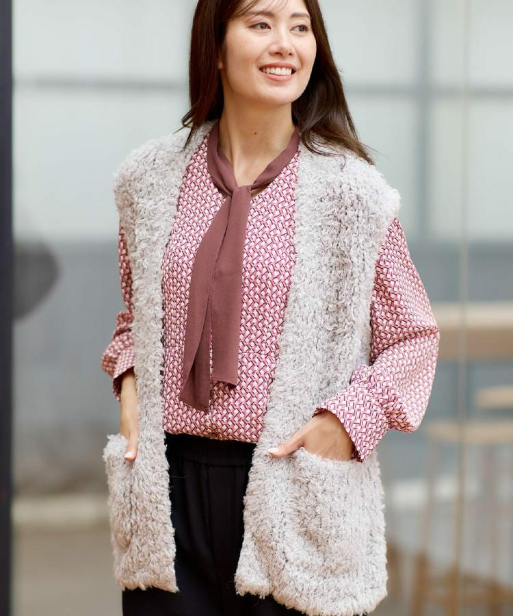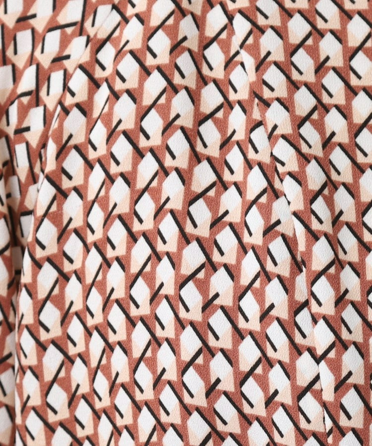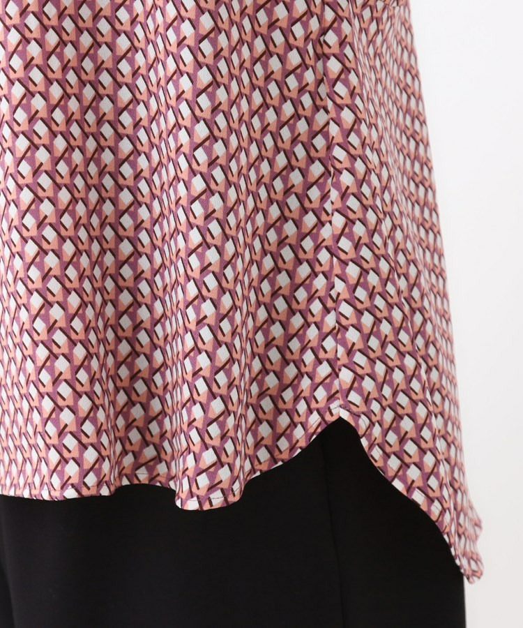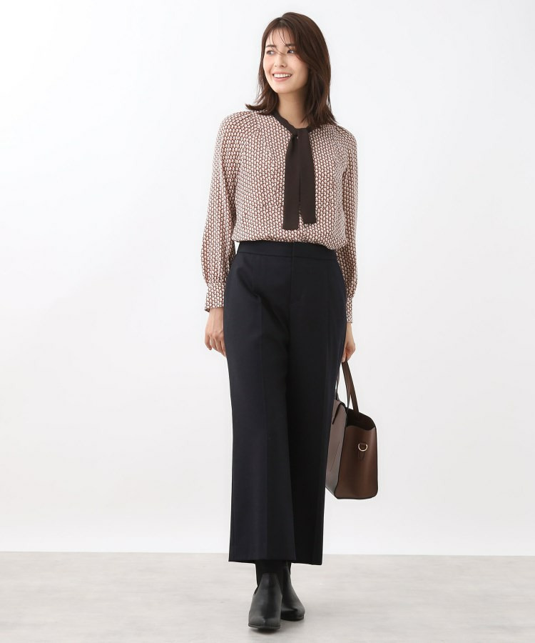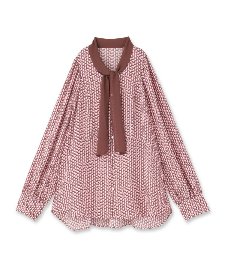 身頃はプリント柄、衿は無地生地を使用したボータイブラウス。